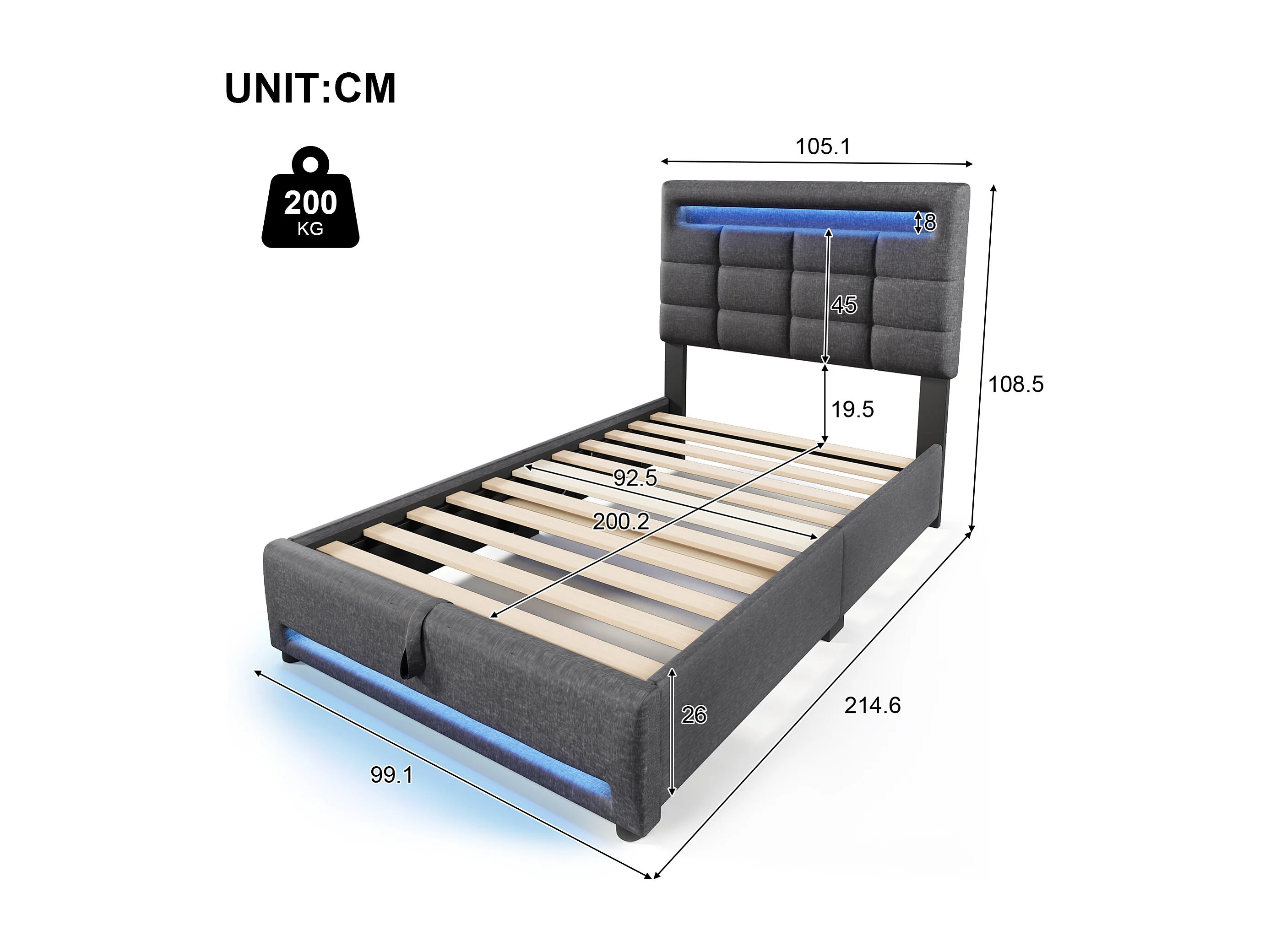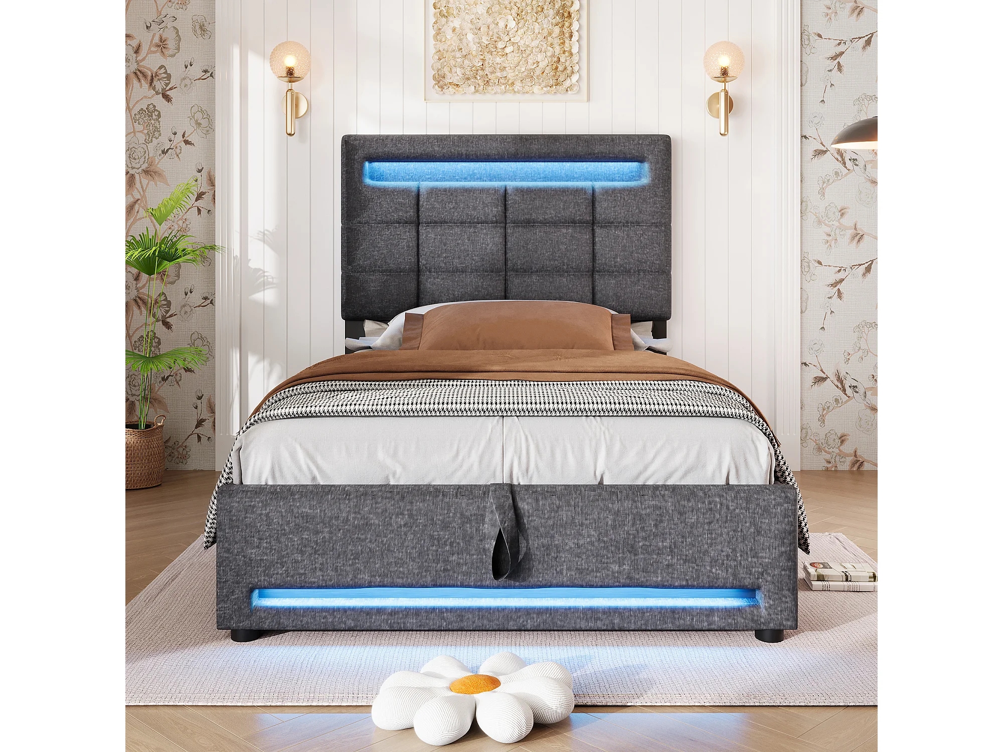 Lit rembourré 90x200 cm en lin gris avec LED, télécommande APP, port USB et rangement hydraulique intégré