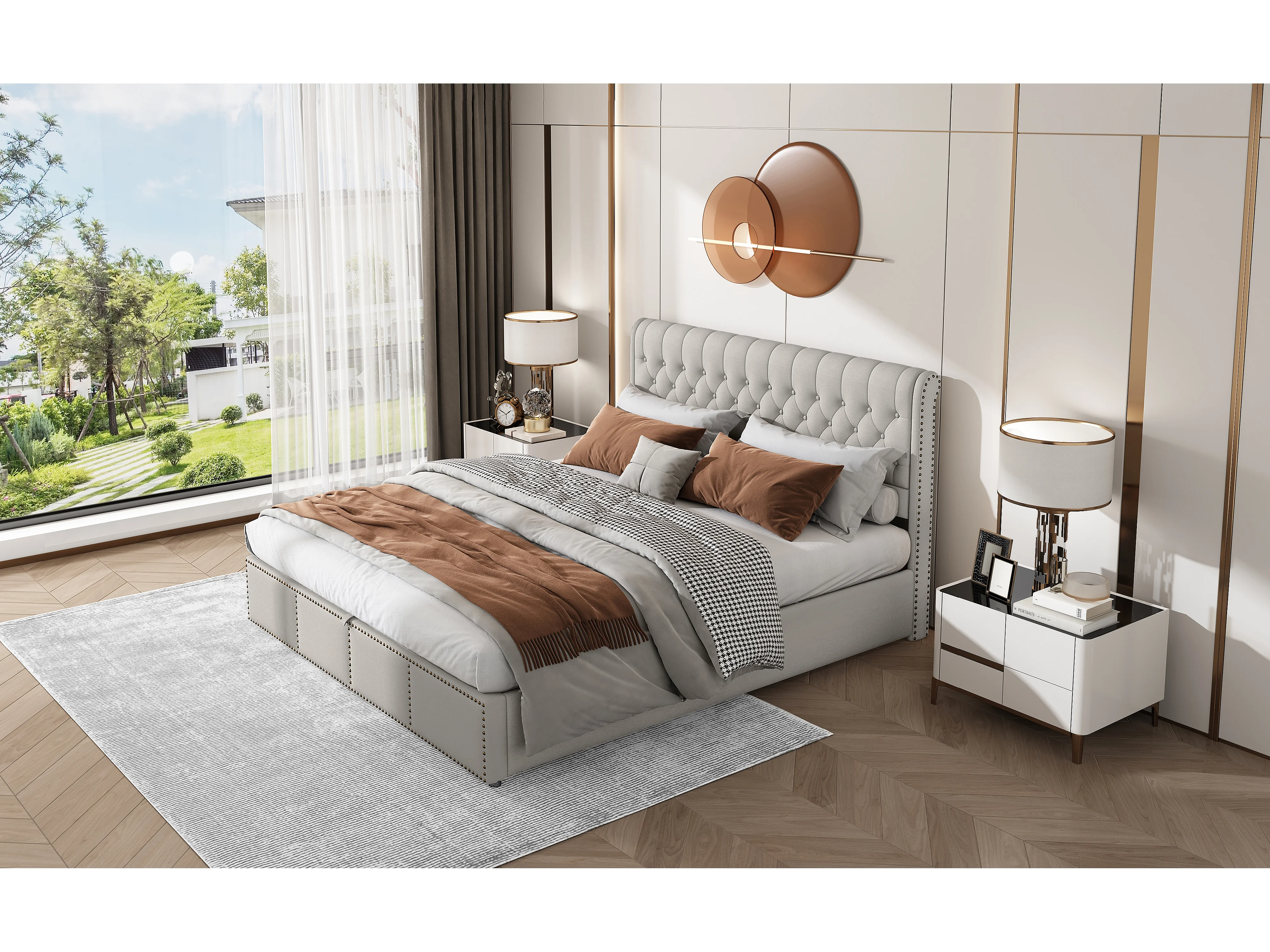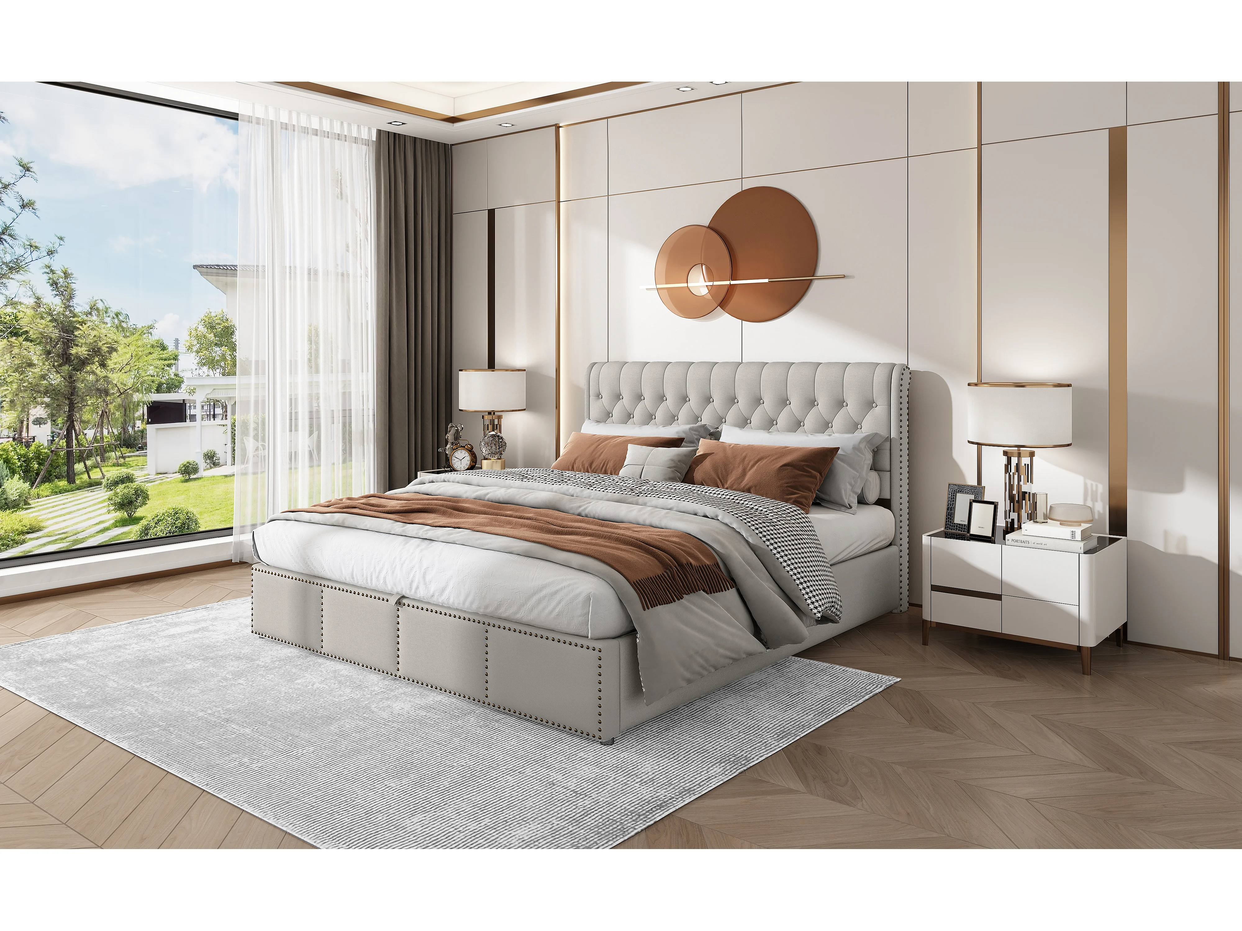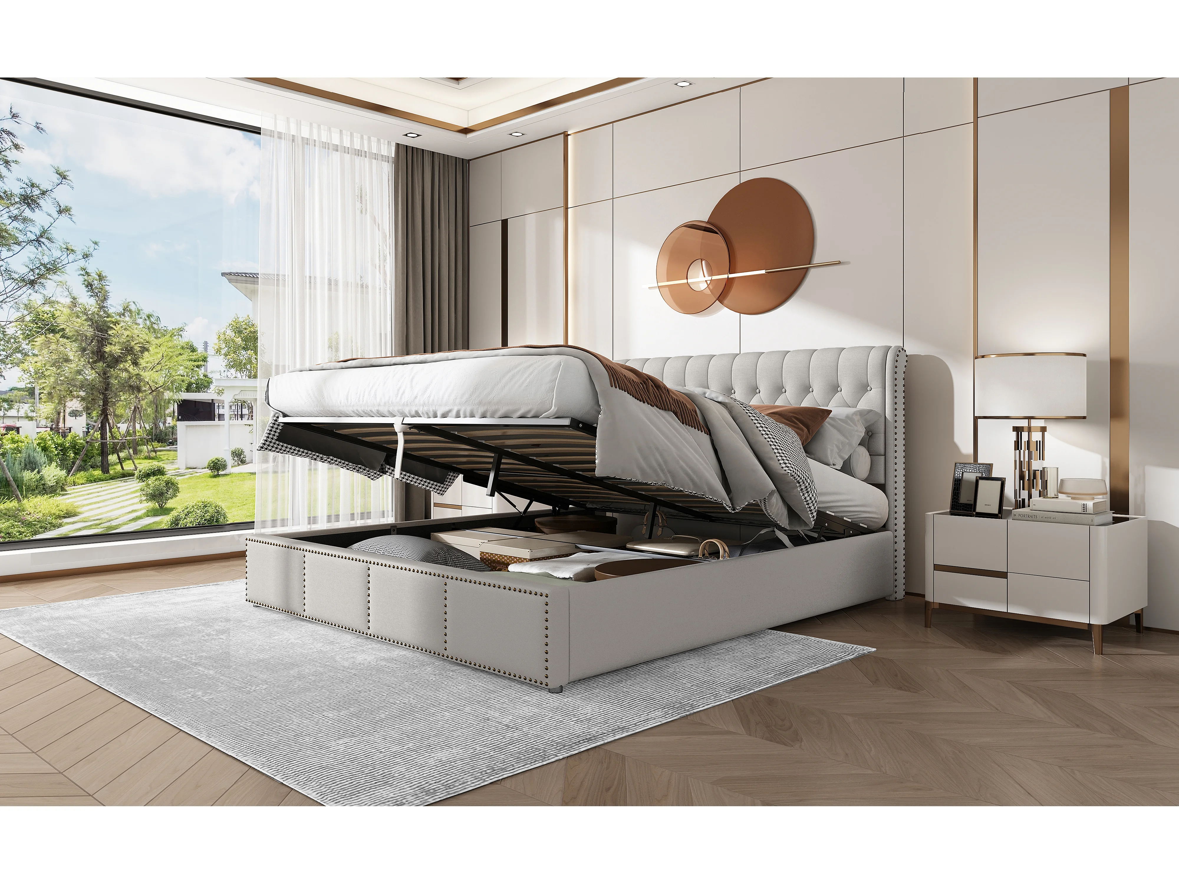 Lit rembourré en lin, 160 x 200 cm, gris, avec rangement et design élégant en clous