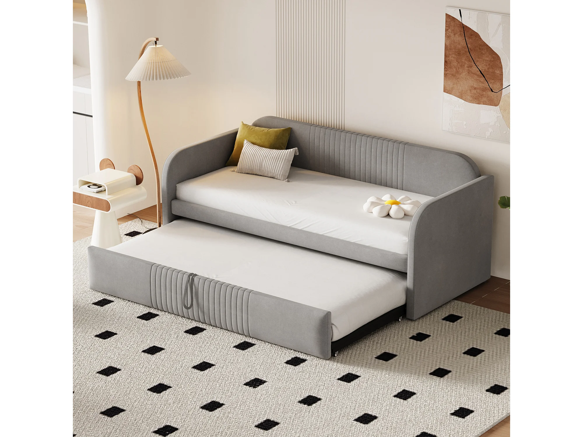 Lit rembourré extensible 90/180x190 cm à rayures verticales, en lin respirant, avec sommier, gris clair (matelas non inclus)