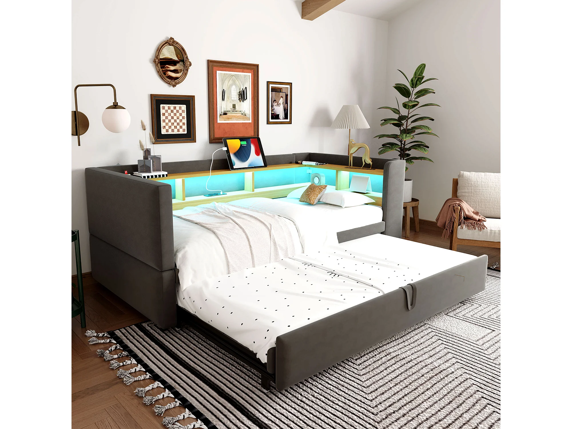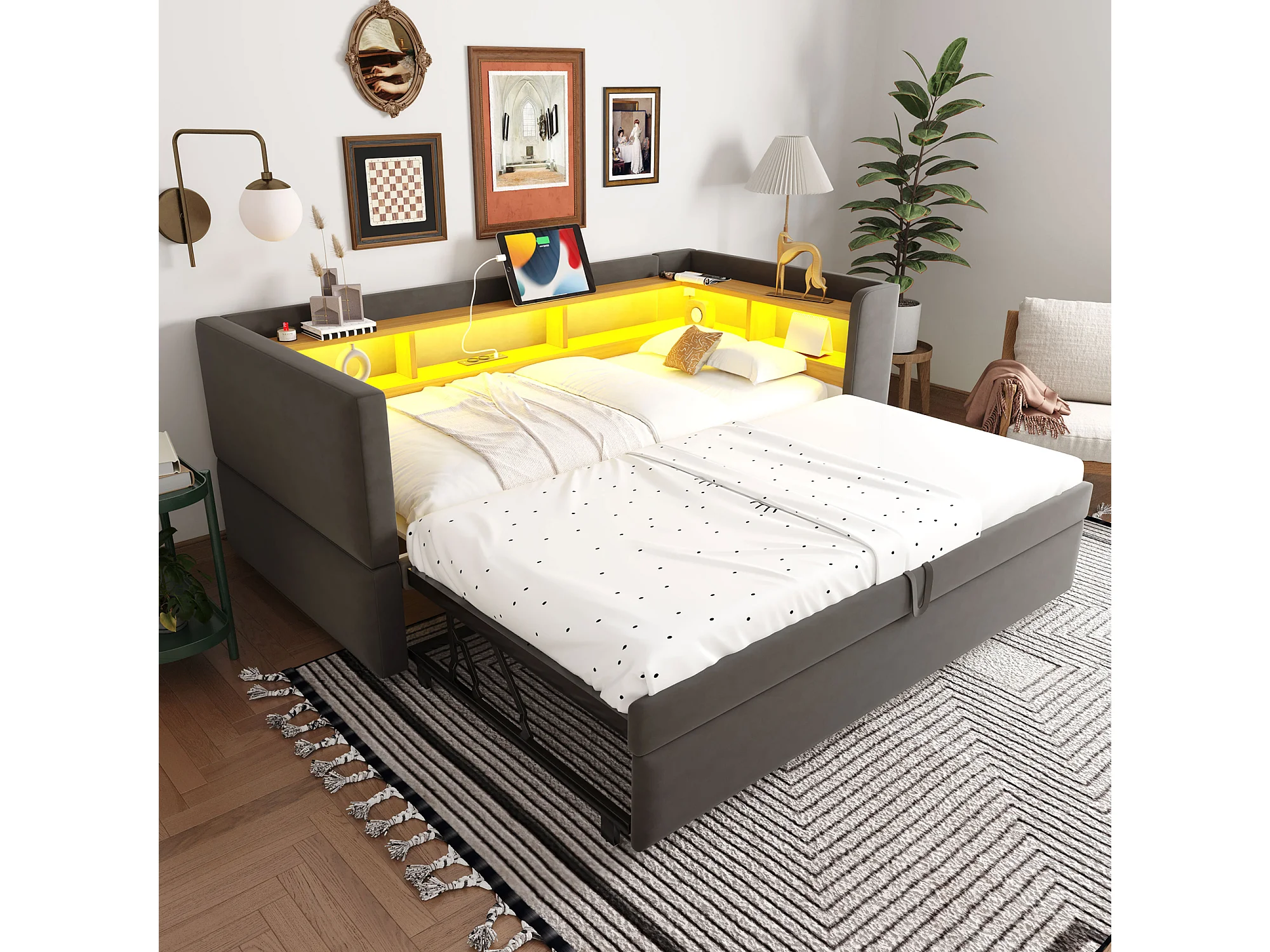 Lit rembourré extensible 90/180x190 cm avec LED, ports USB et rangements intégrés, canapé-lit multifonction, gris foncé