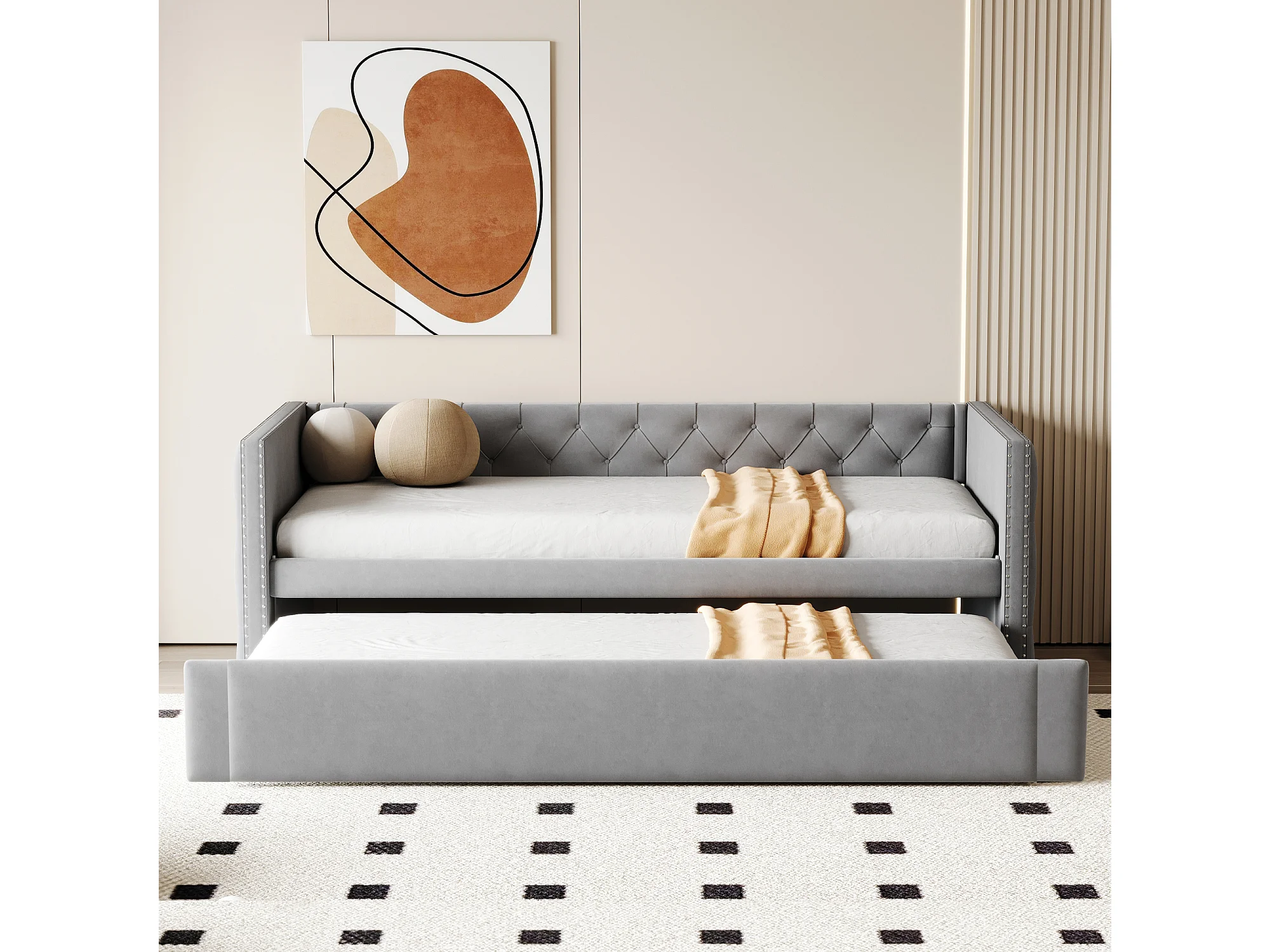 Lit rembourré extensible 90x200 cm avec boutons, velours gris clair, sommier inclus, lit d’appoint multifonction