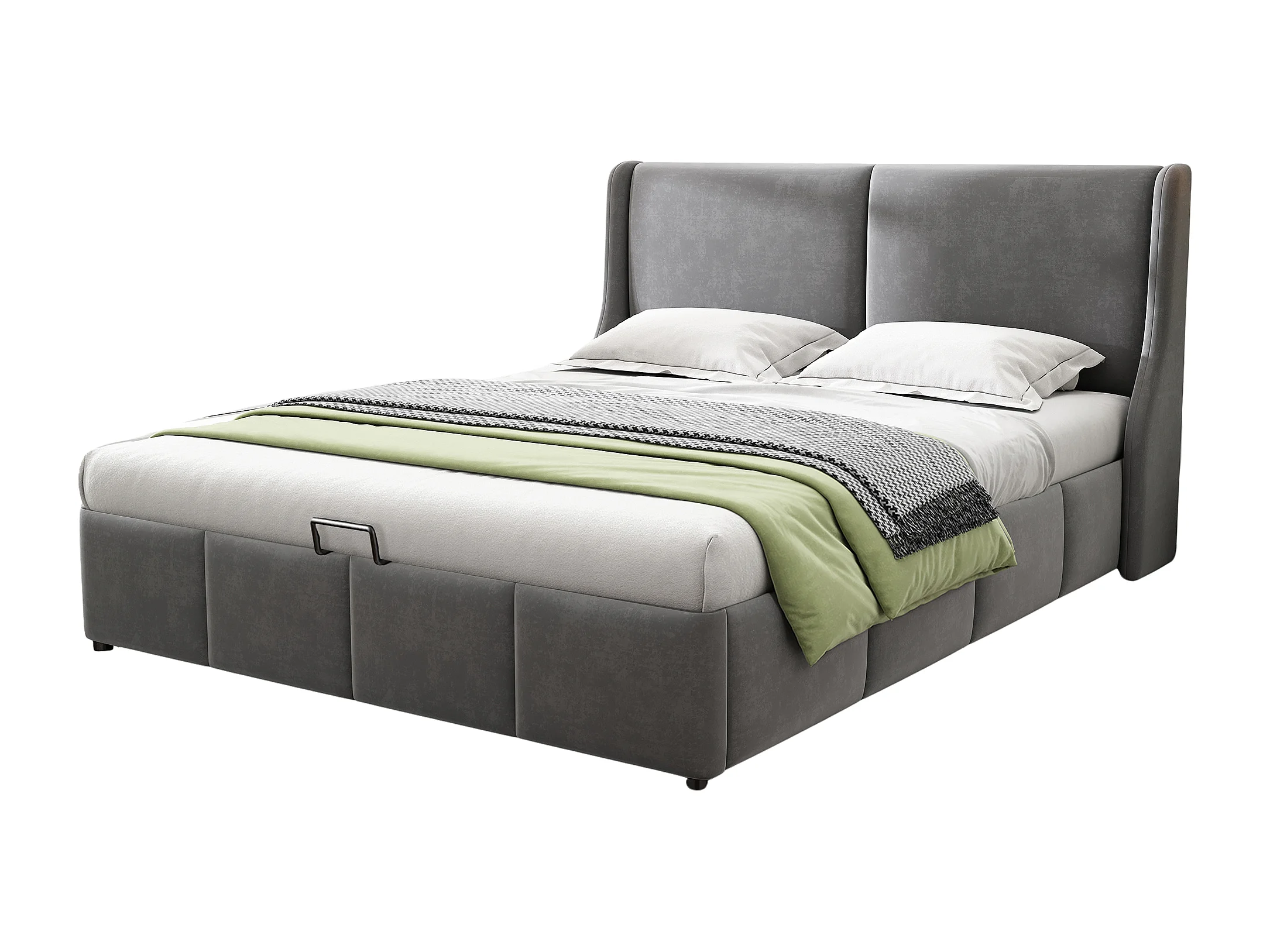 Lit rembourré gris 140x200 cm avec tête de lit en coussin et espace de rangement, sommier à lattes inclus