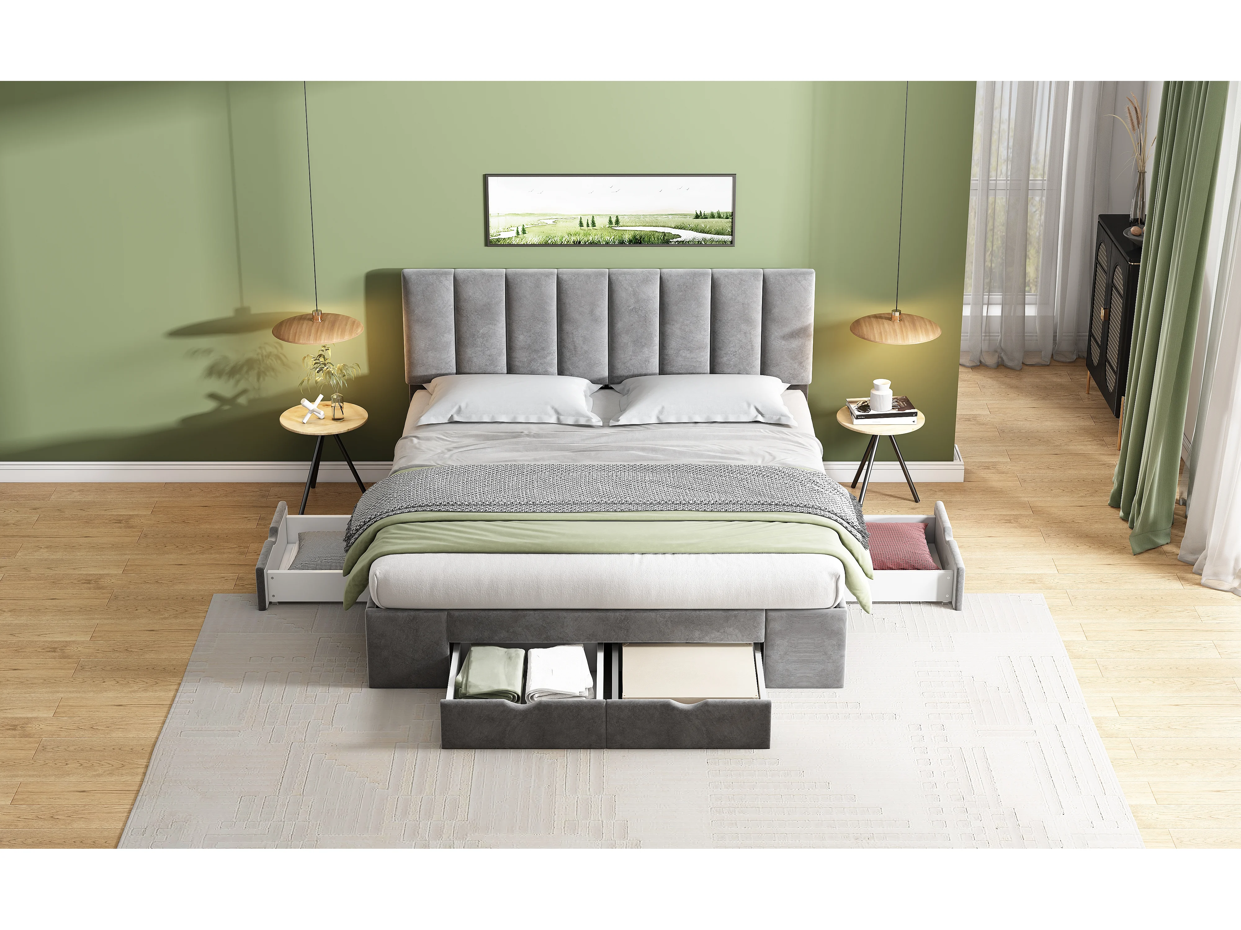 Lit rembourré gris 160x200 cm avec sommier à lattes et 4 tiroirs, design élégant et confort optimal