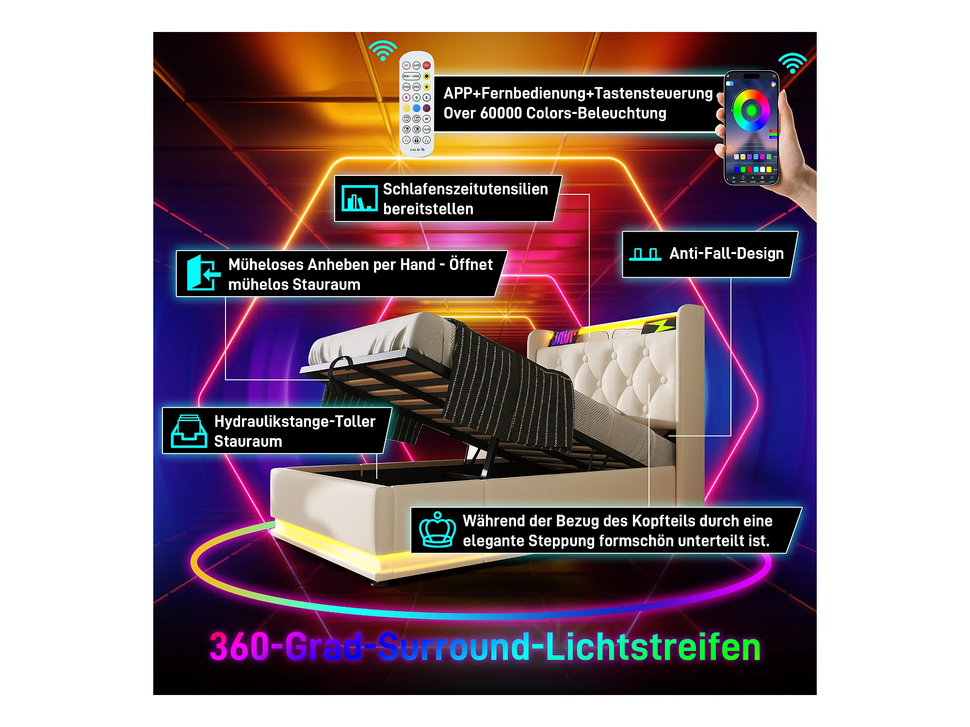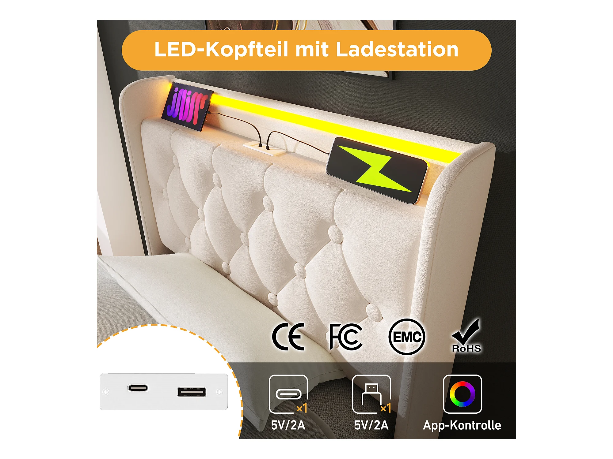 Lit rembourré simple,fonction LED à 360°,bouton-poussoir/application/télécommande,90x200cm