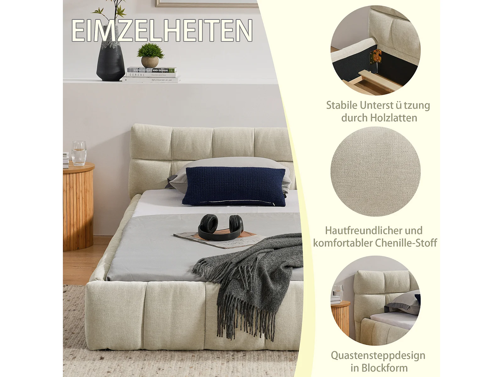 Lit simple 90×200 cm pour enfant, en chenille douce, design capitonné, cadre en eucalyptus écologique et métal, montage facile – Beige