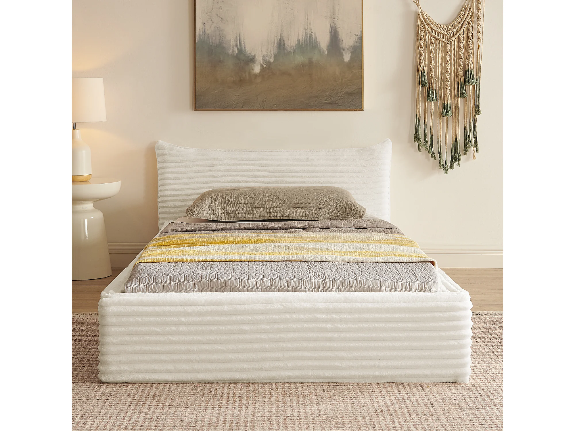 Lit simple 90×200 cm pour enfant, en velours côtelé, structure en eucalyptus écologique et métal, montage facile – Beige