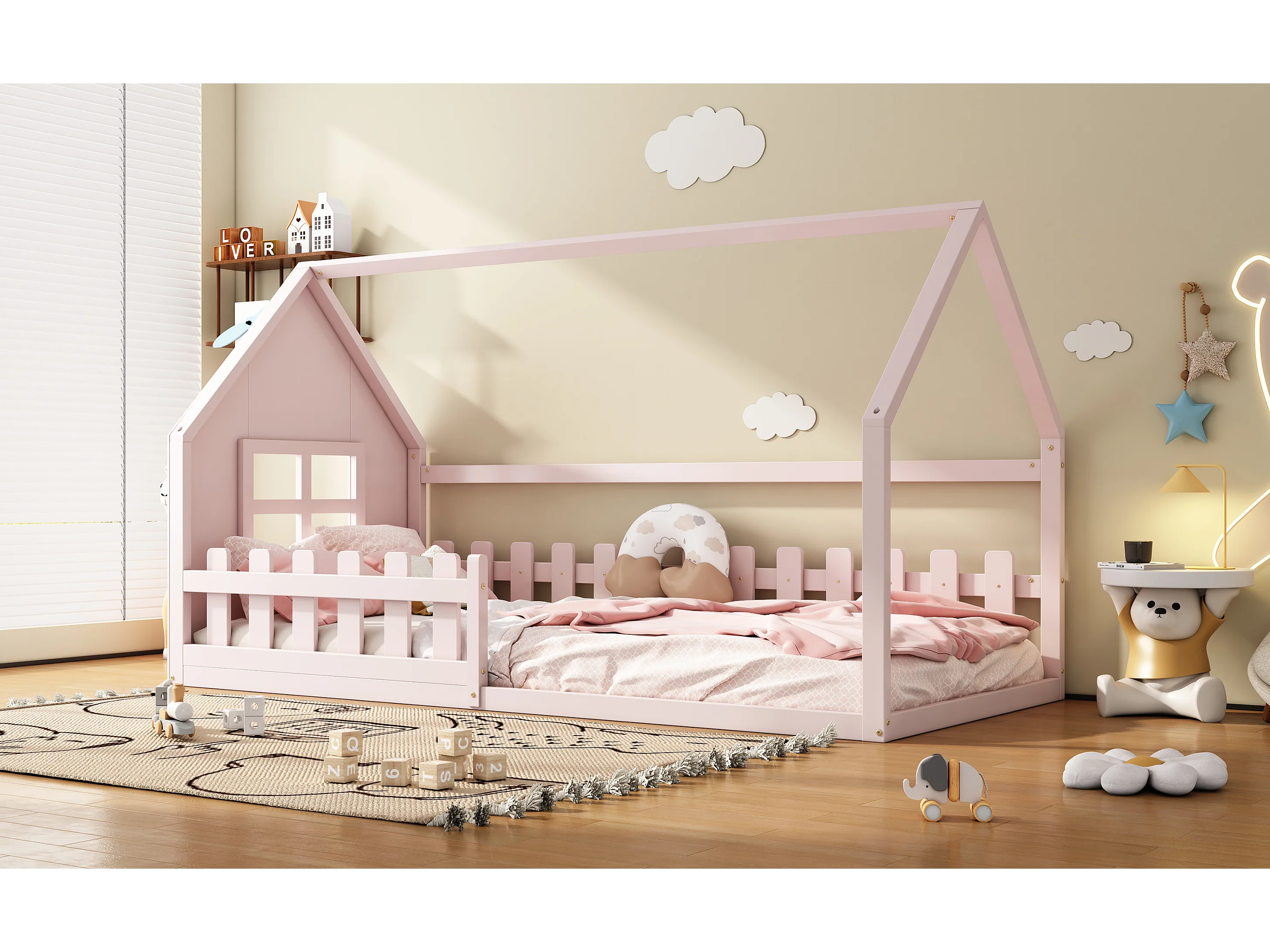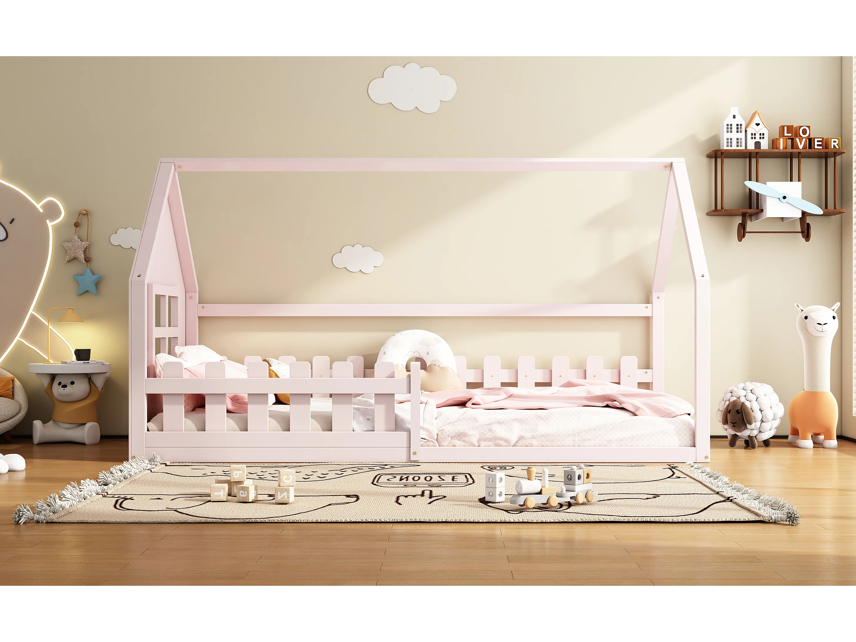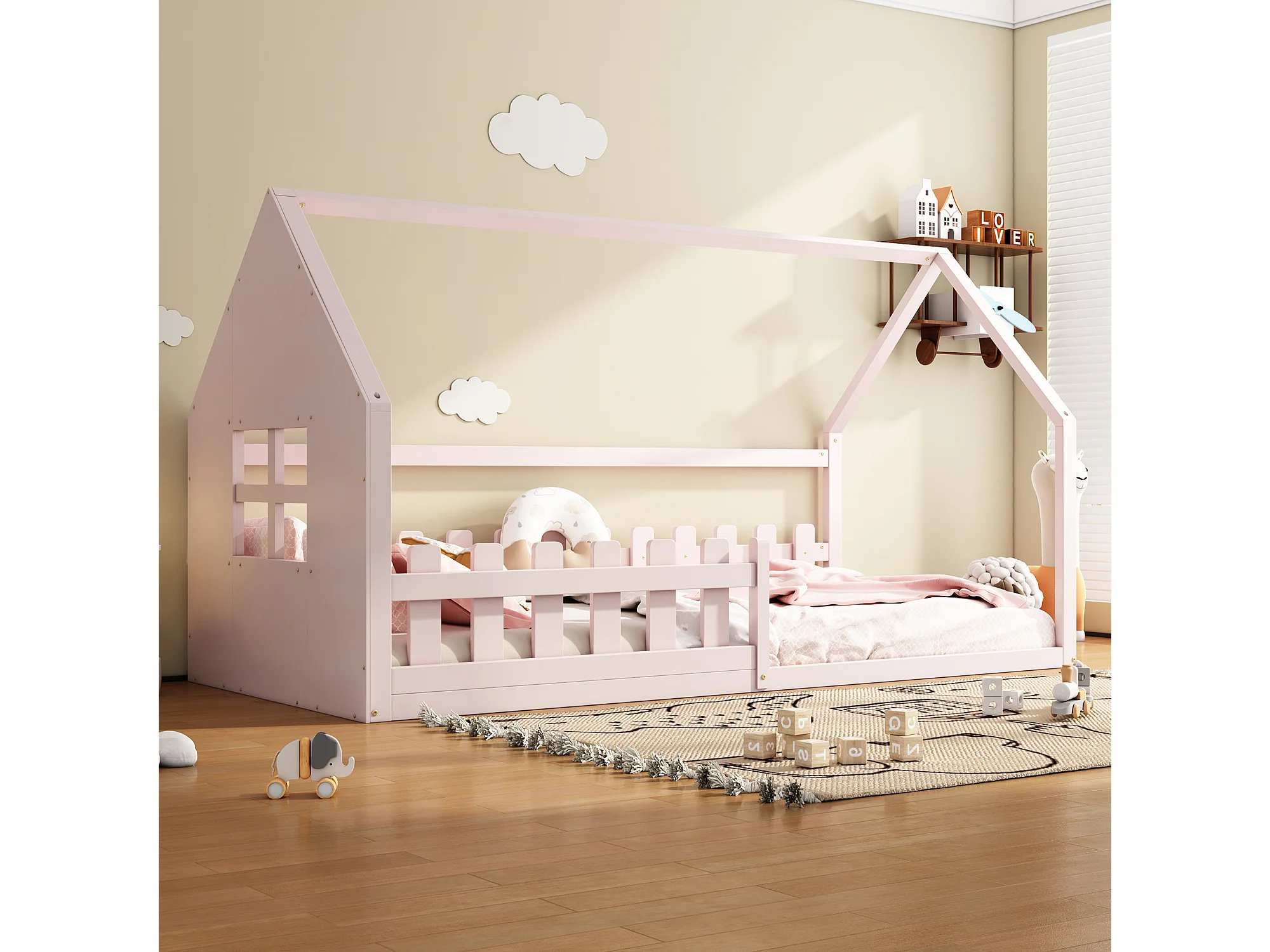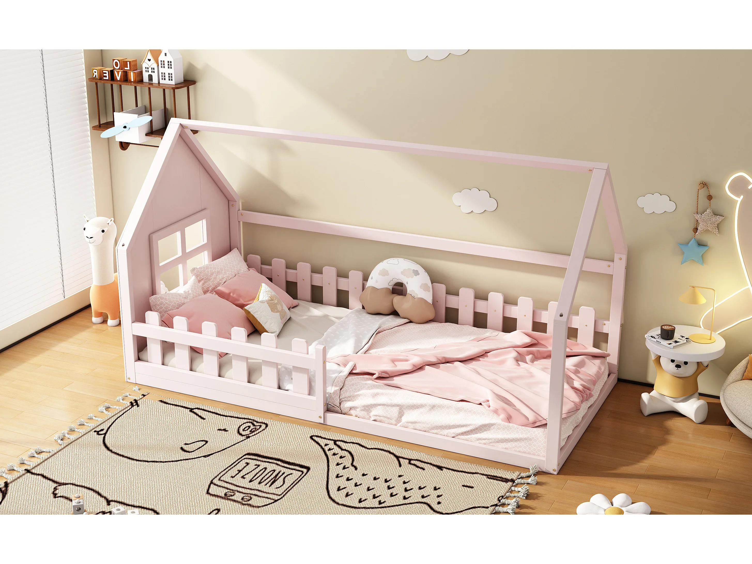 Lit simple 90x200 cm pour enfant, lit en forme de maison avec bordure décorative, Rose