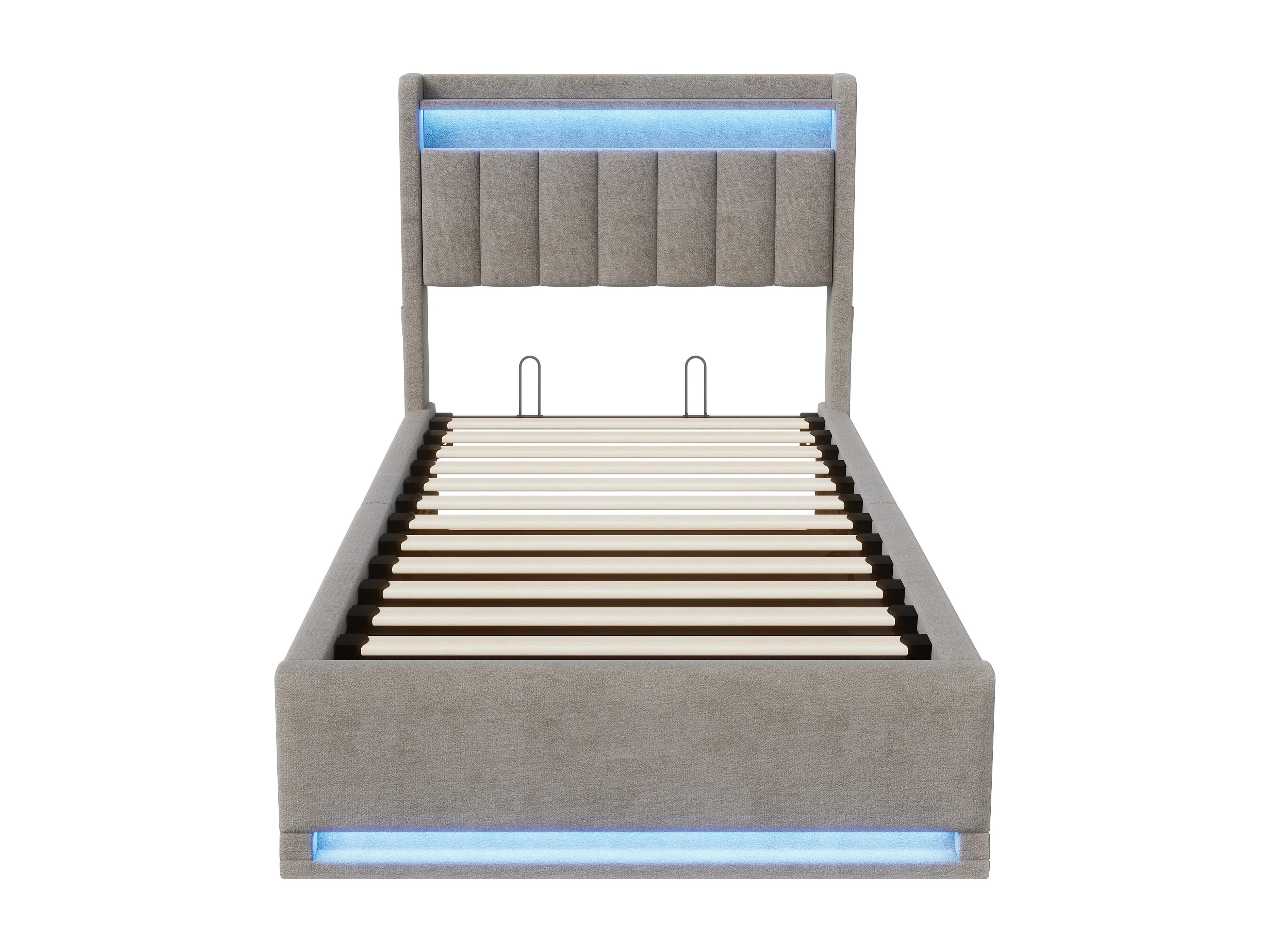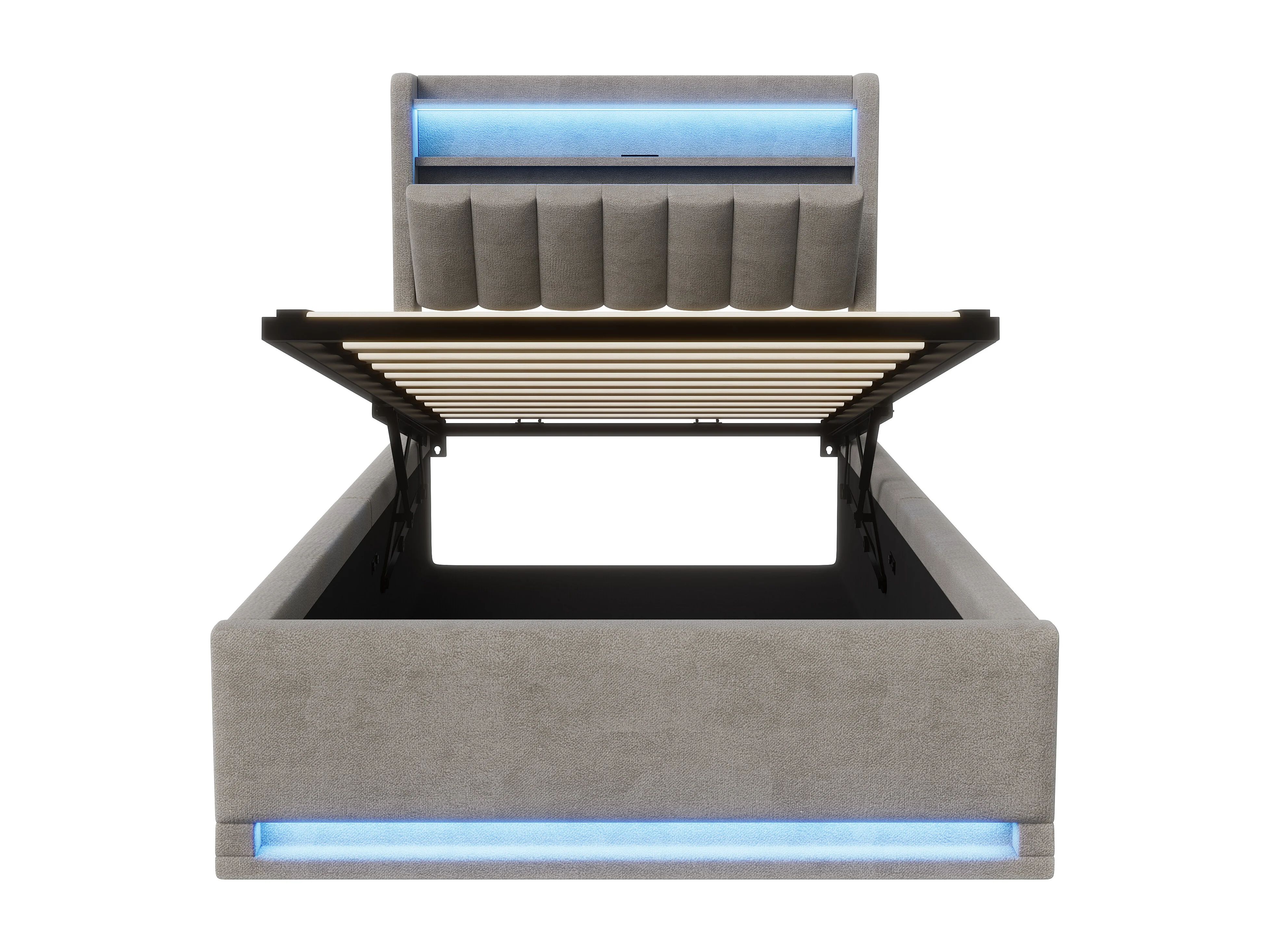 Lit simple 90x200cm avec LED et rangement hydraulique - tête de lit avec ports USB et compartiments de rangement - velours - gris