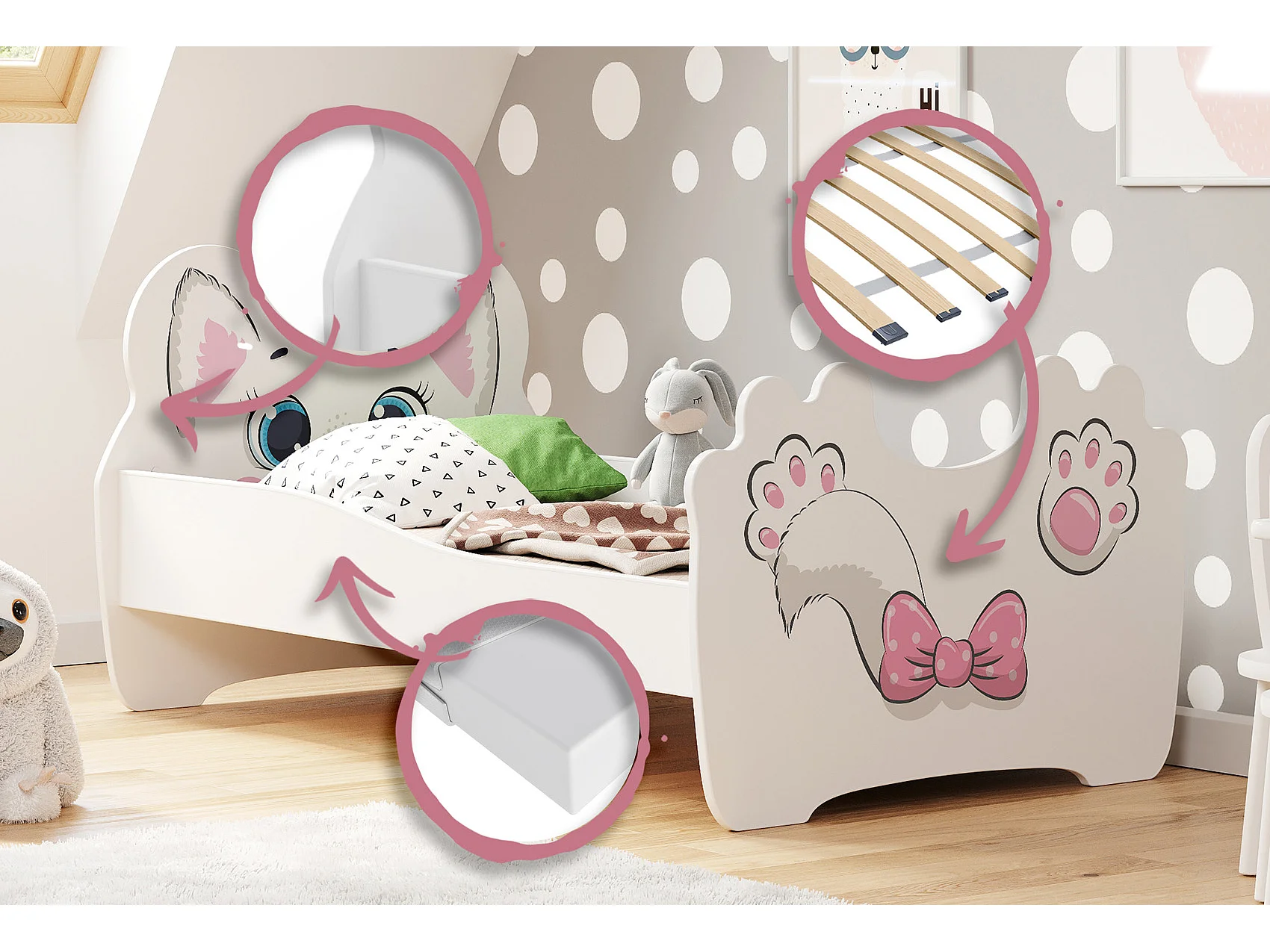 Lit simple chat rose 160x80 avec graphismes pour enfants, dans un ensemble avec un matelas et un cadre