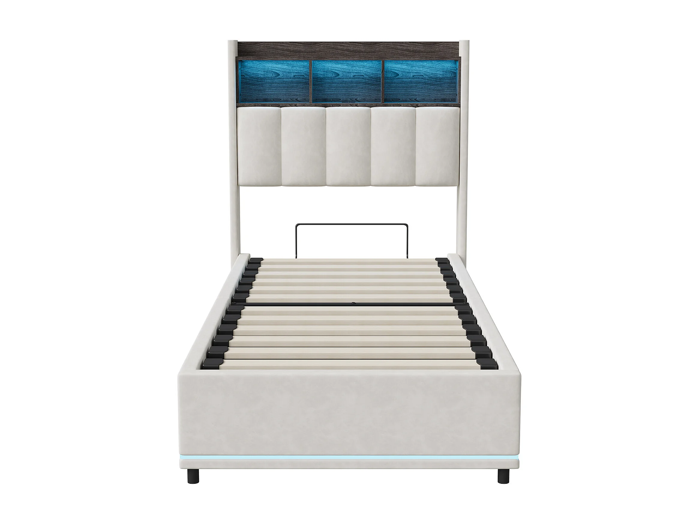 Lit simple coffre 90x200 cm avec éclairage LED et port USB - compartiment de rangement hydraulique - Velours - Blanc