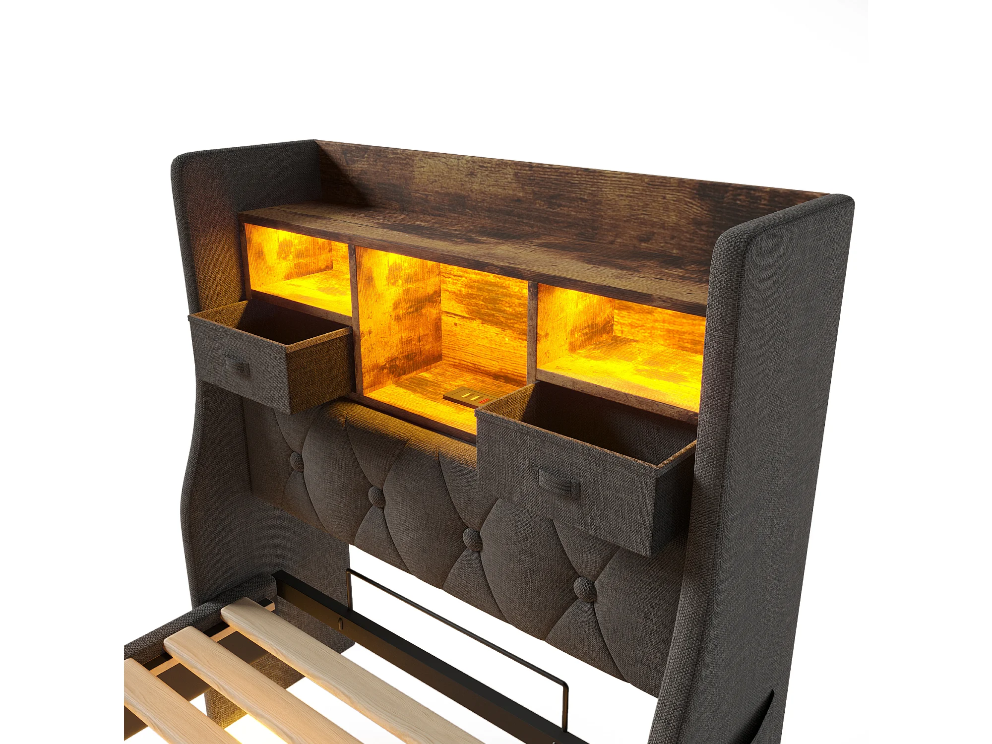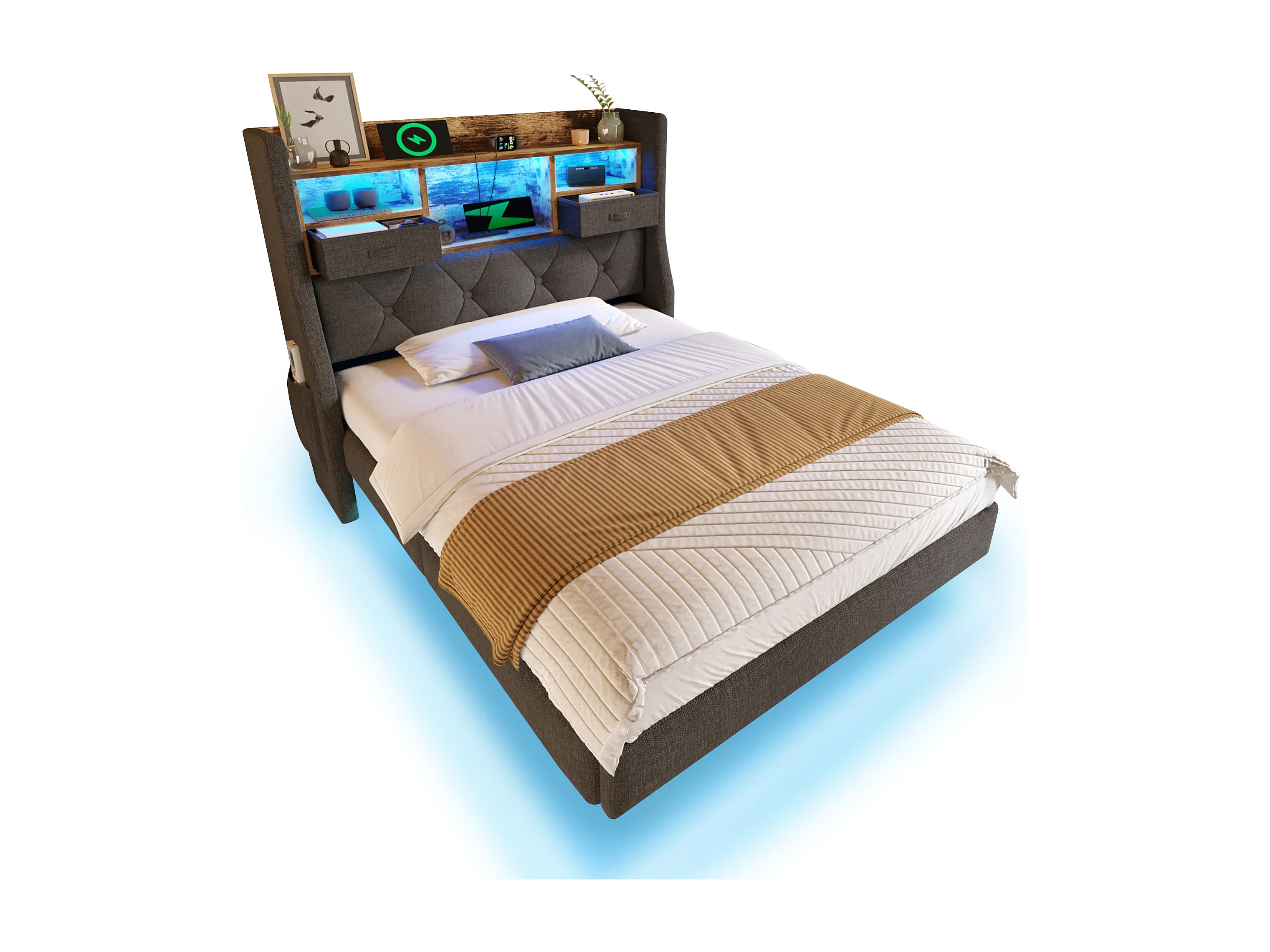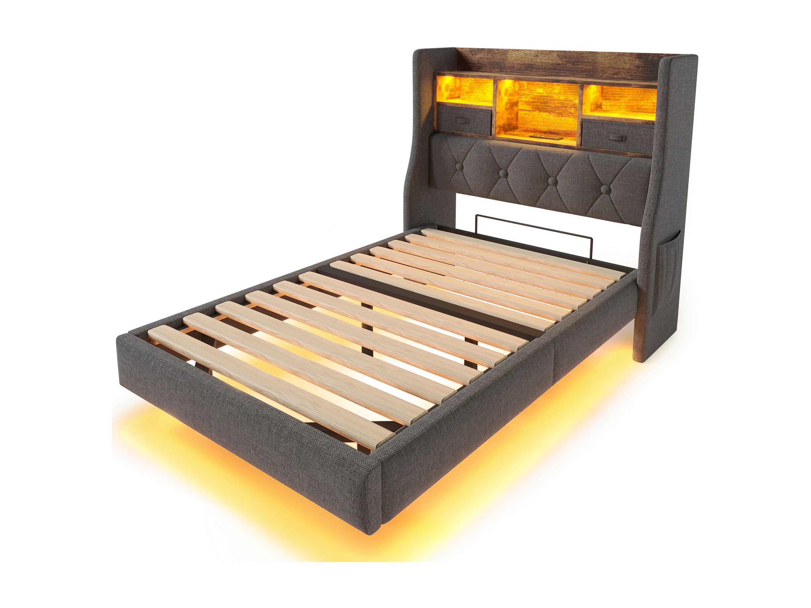 Lit simple moderne 90 x 200 cm, port USB et Type-C, rangement, LED, Lit flottant, Lin gris, sans matelas