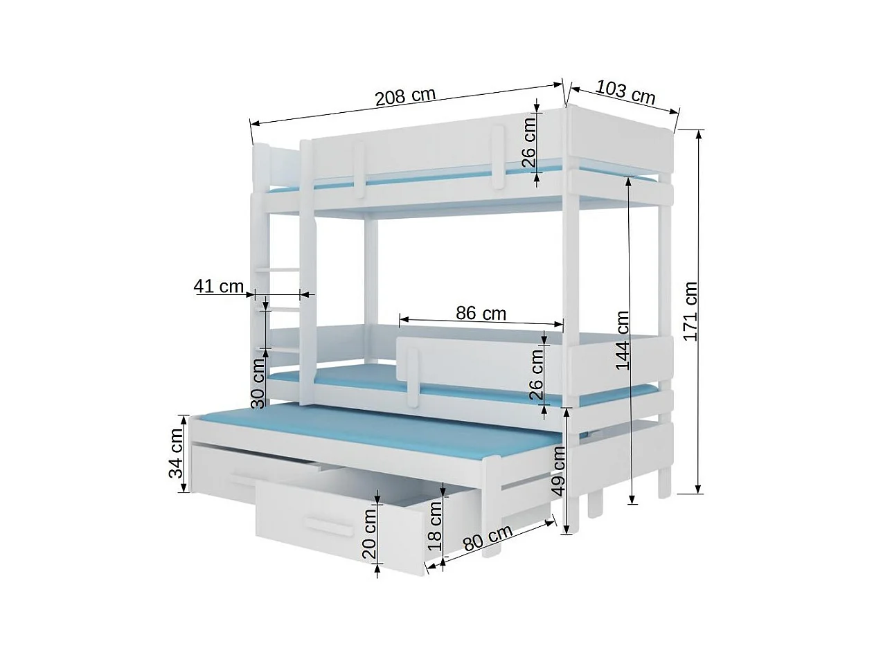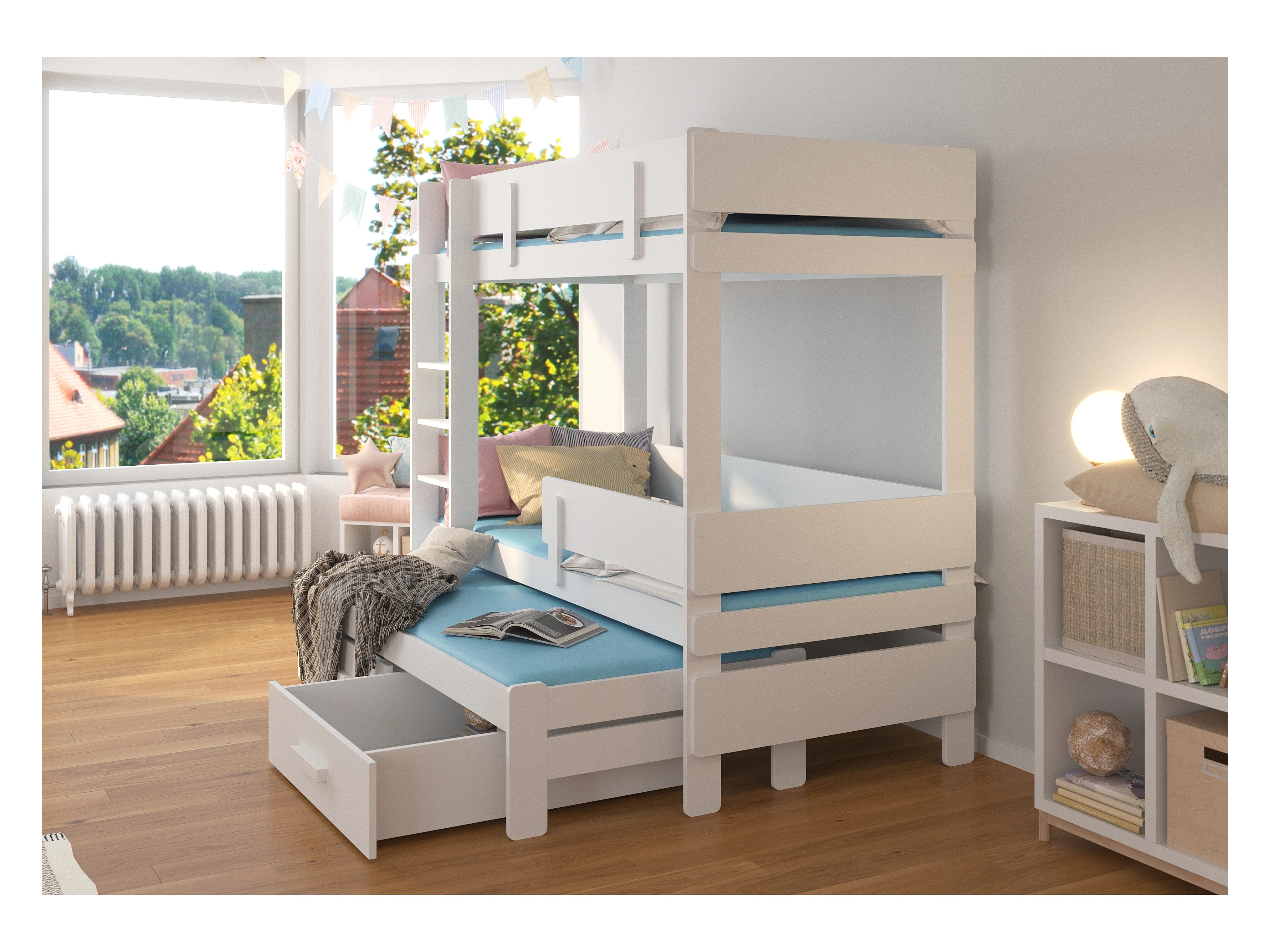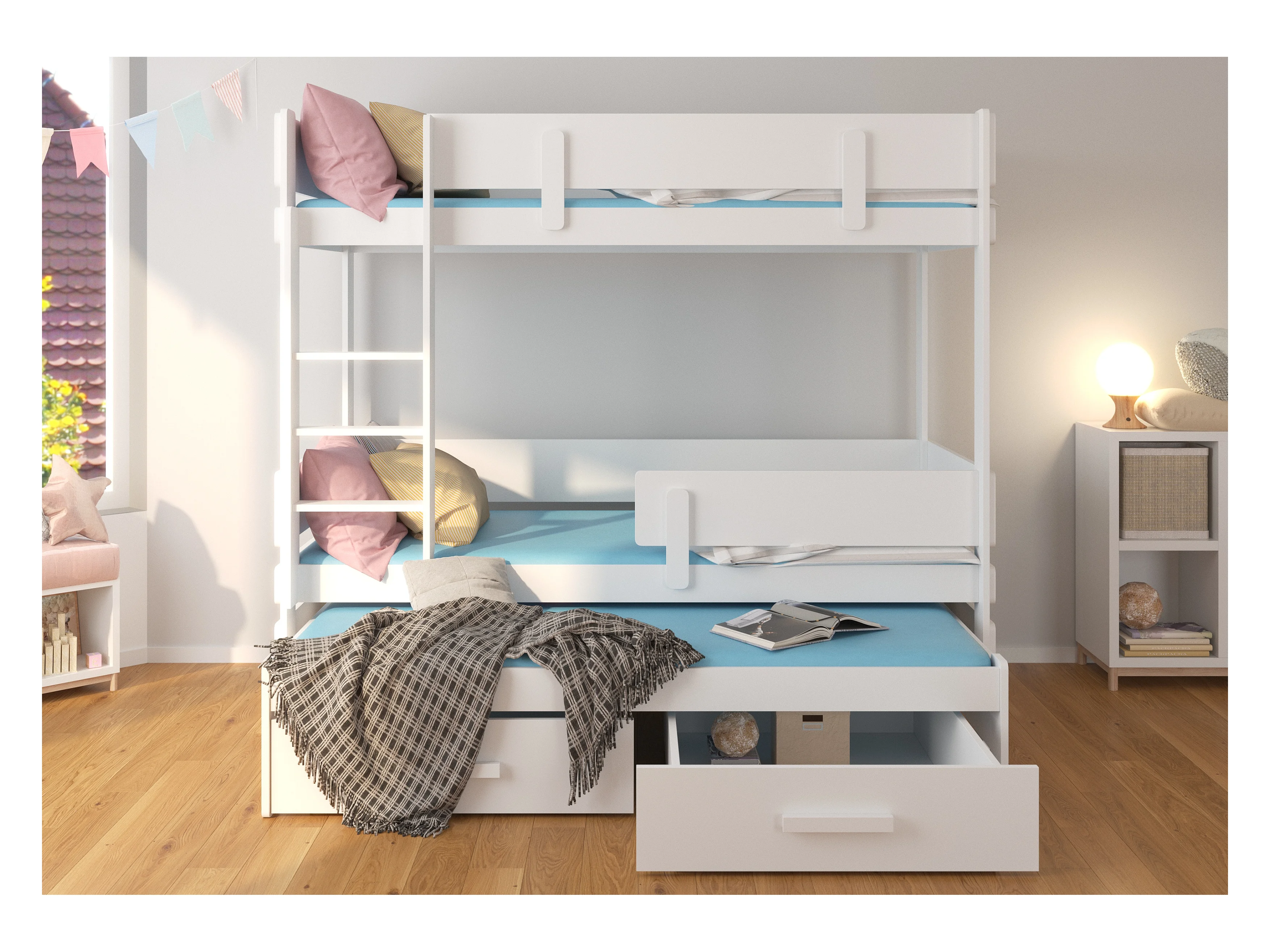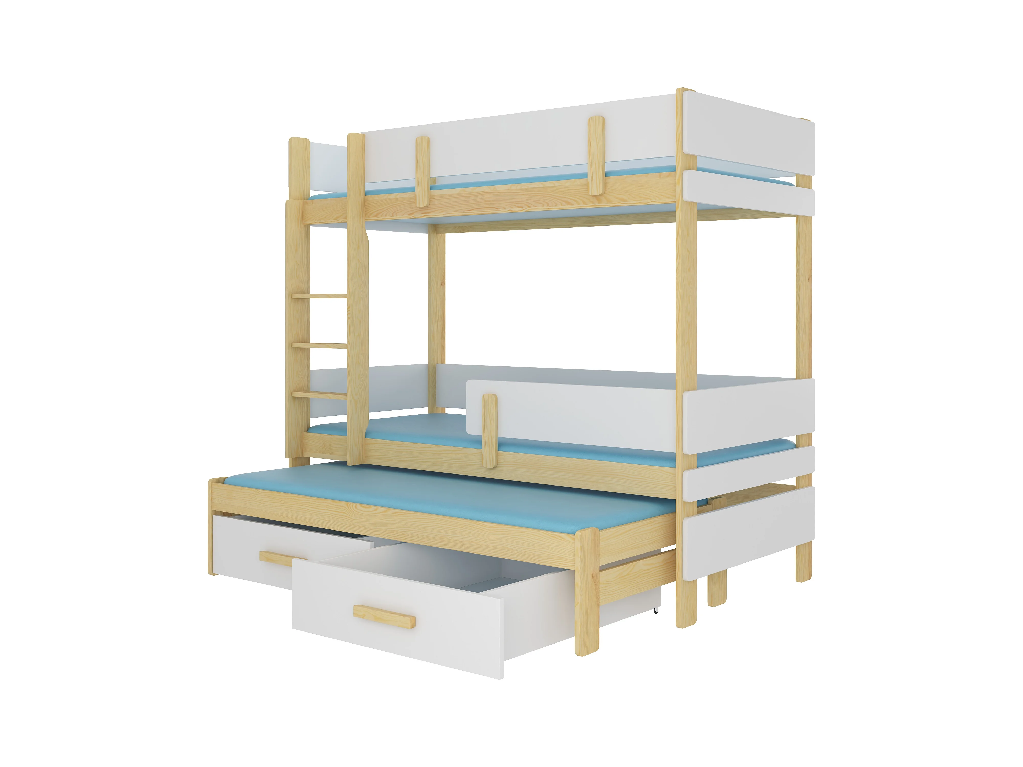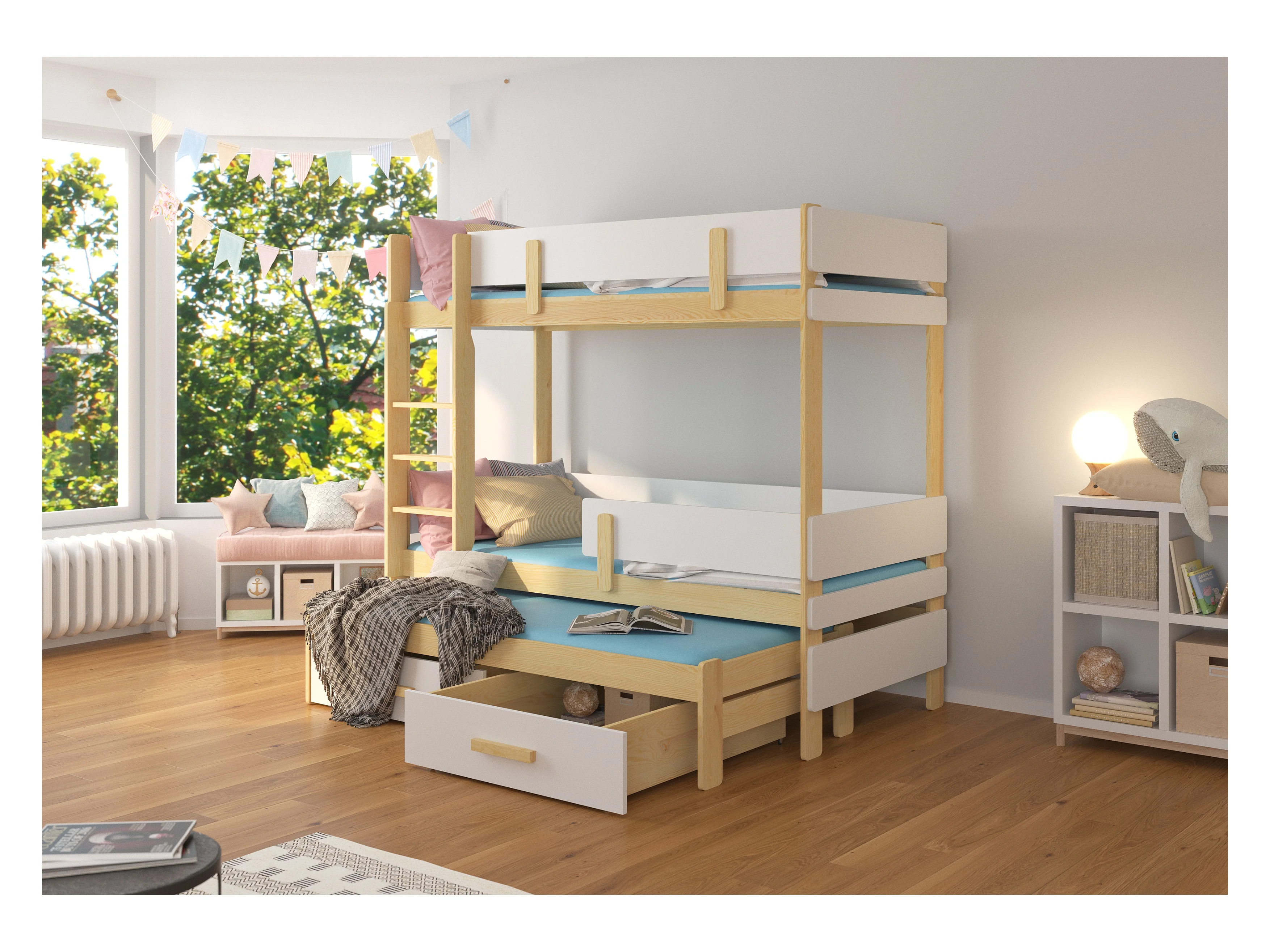 Lit superposé 3 niveaux avec 2 tiroirs de rangement pin naturel et blanc 90x200 Kopa