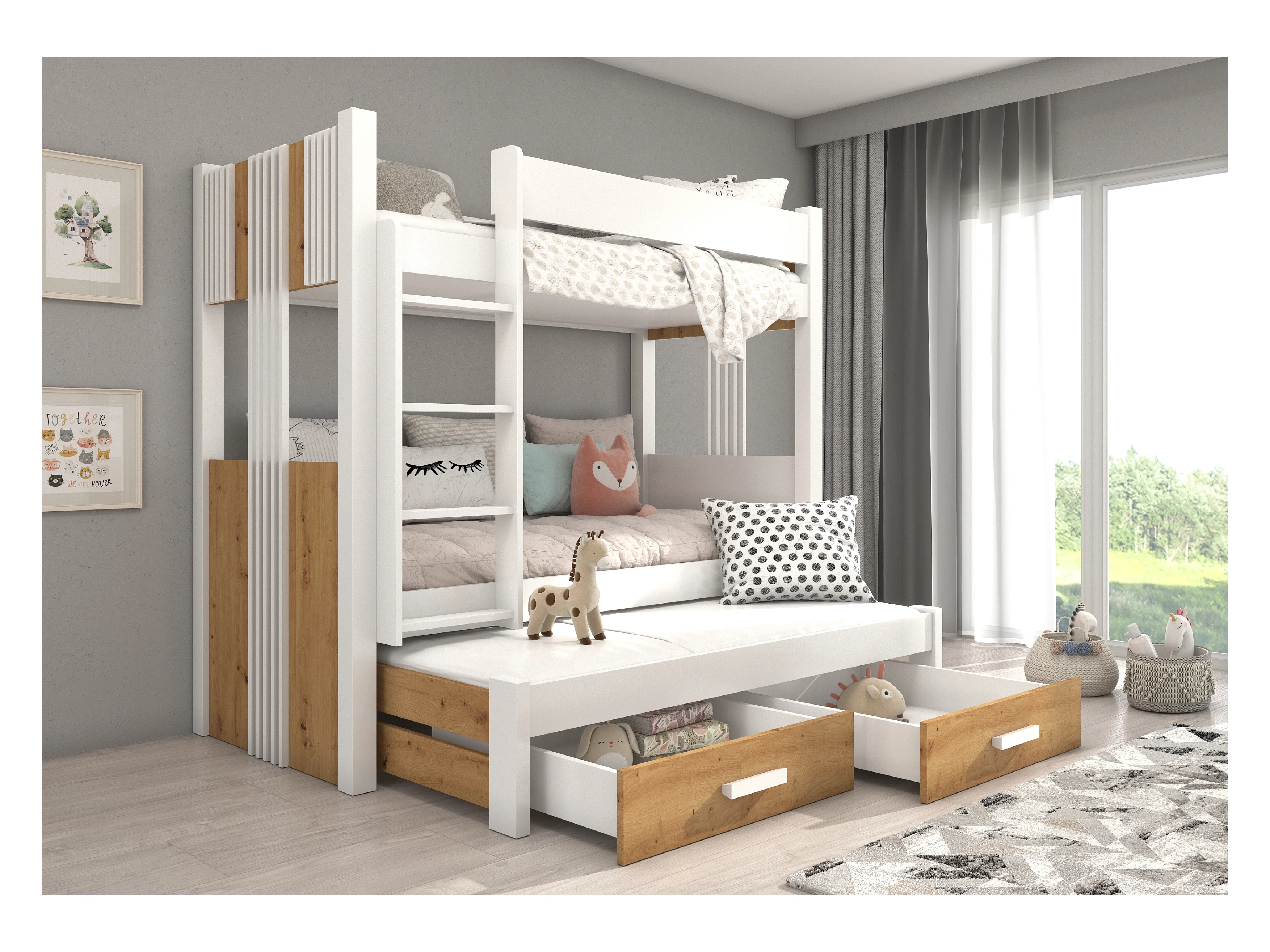 Lit superposé 3 places 90x200 ARKO - 2 tiroirs de rangement et 3 sommiers-Marron