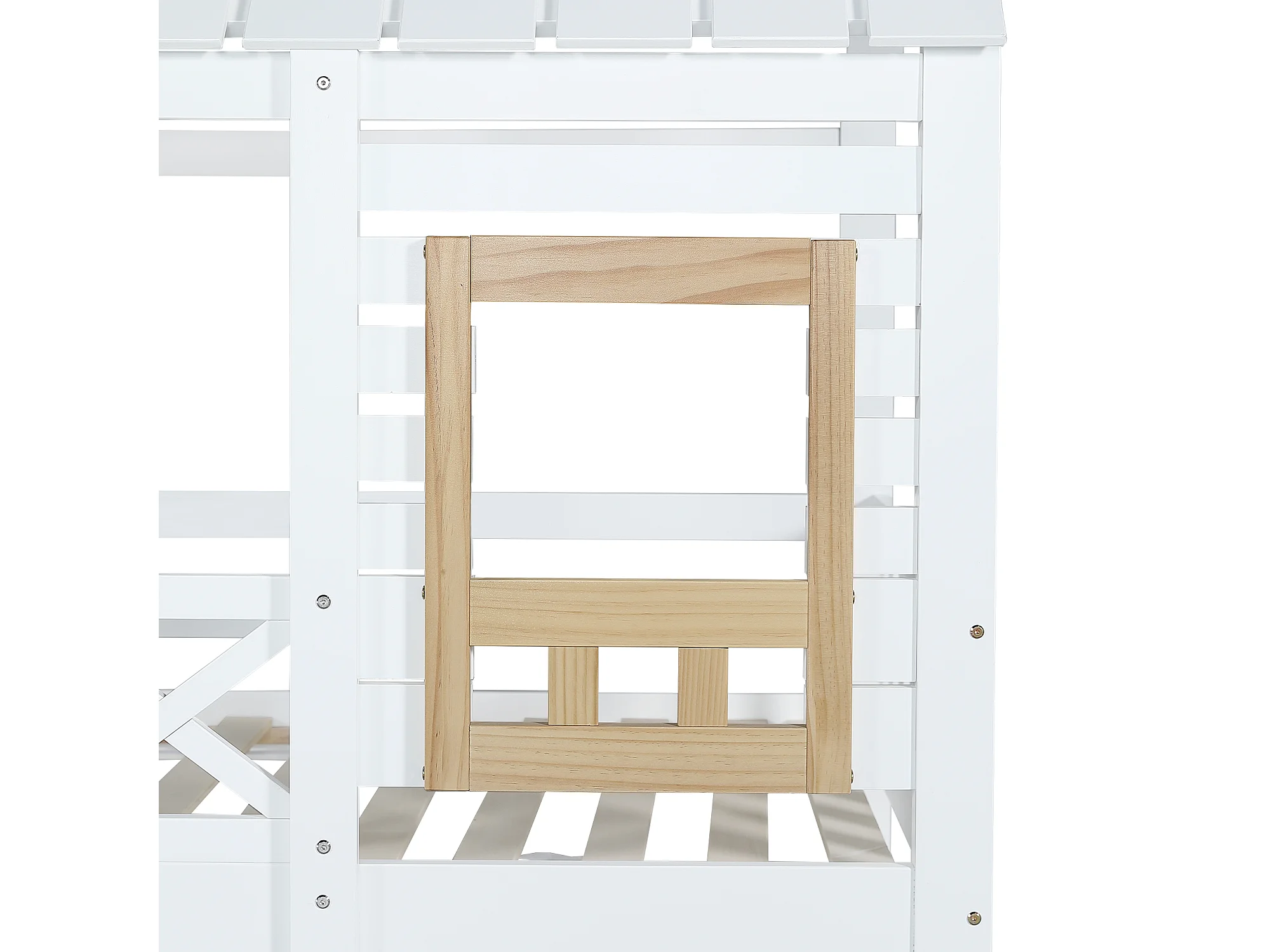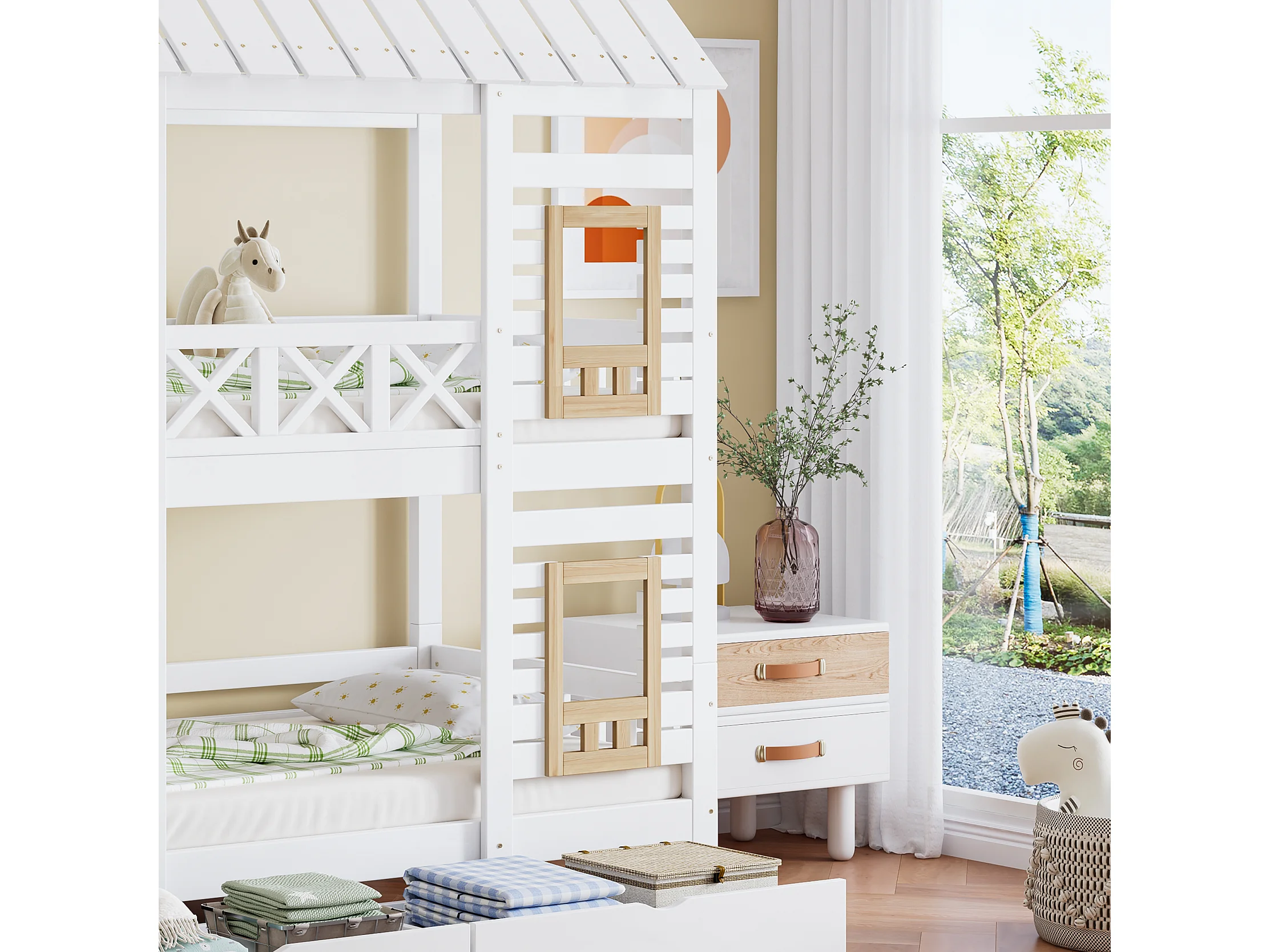 Lit superposé 90 x 200 cm, avec 2 tiroirs, 4 fenêtres, échelle de rangement, bois, blanc