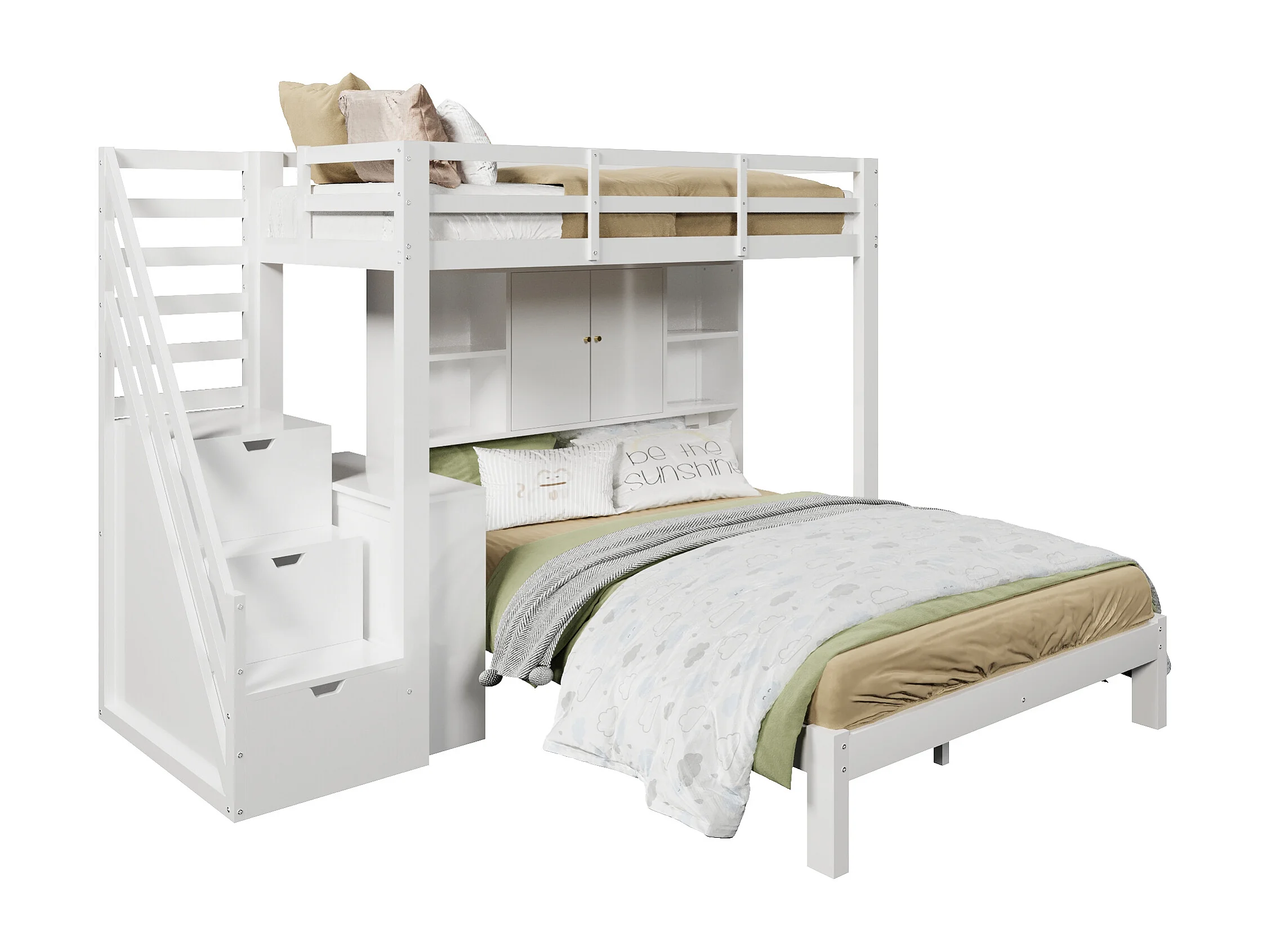 Lit superposé 90×200 cm + 140×200 cm blanc, avec escalier rangement, table d’appoint mobile et grandes niches