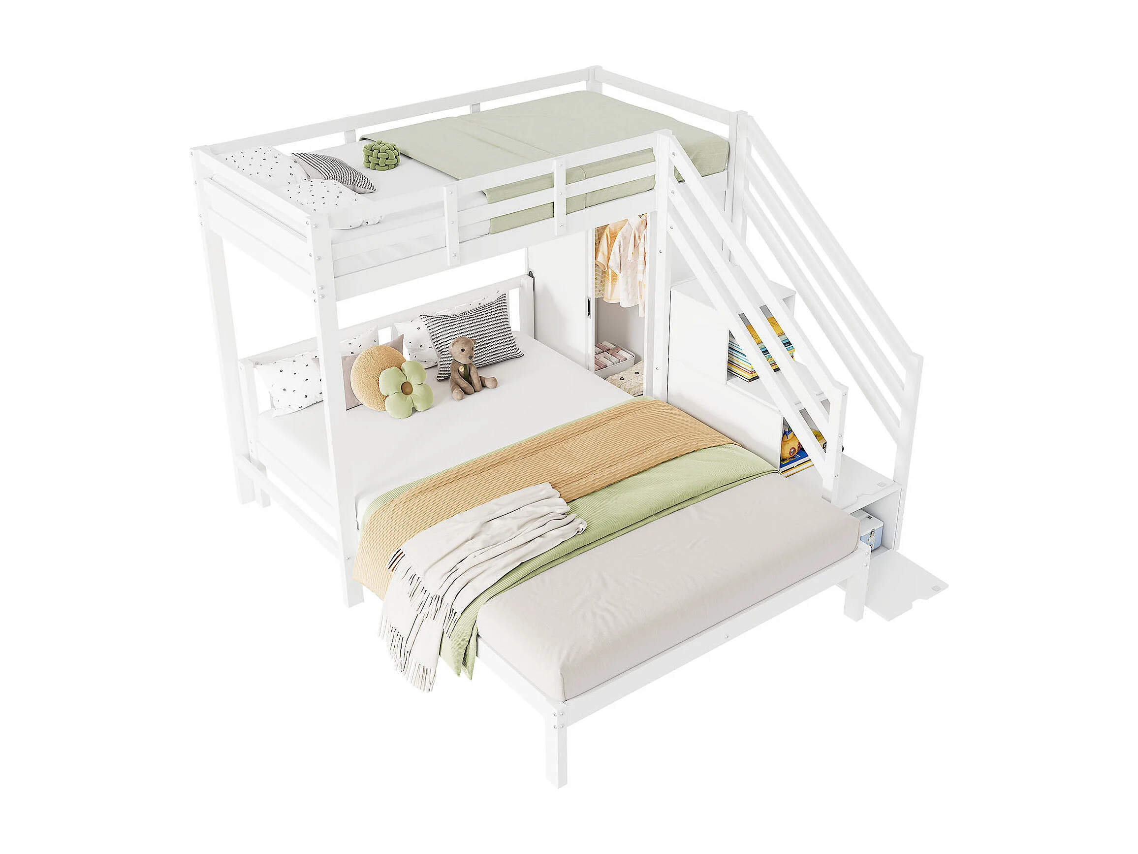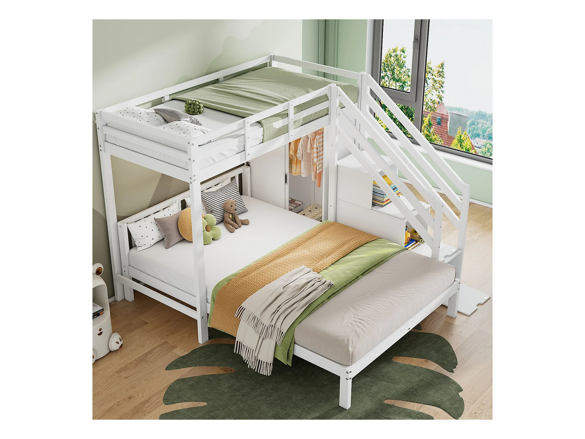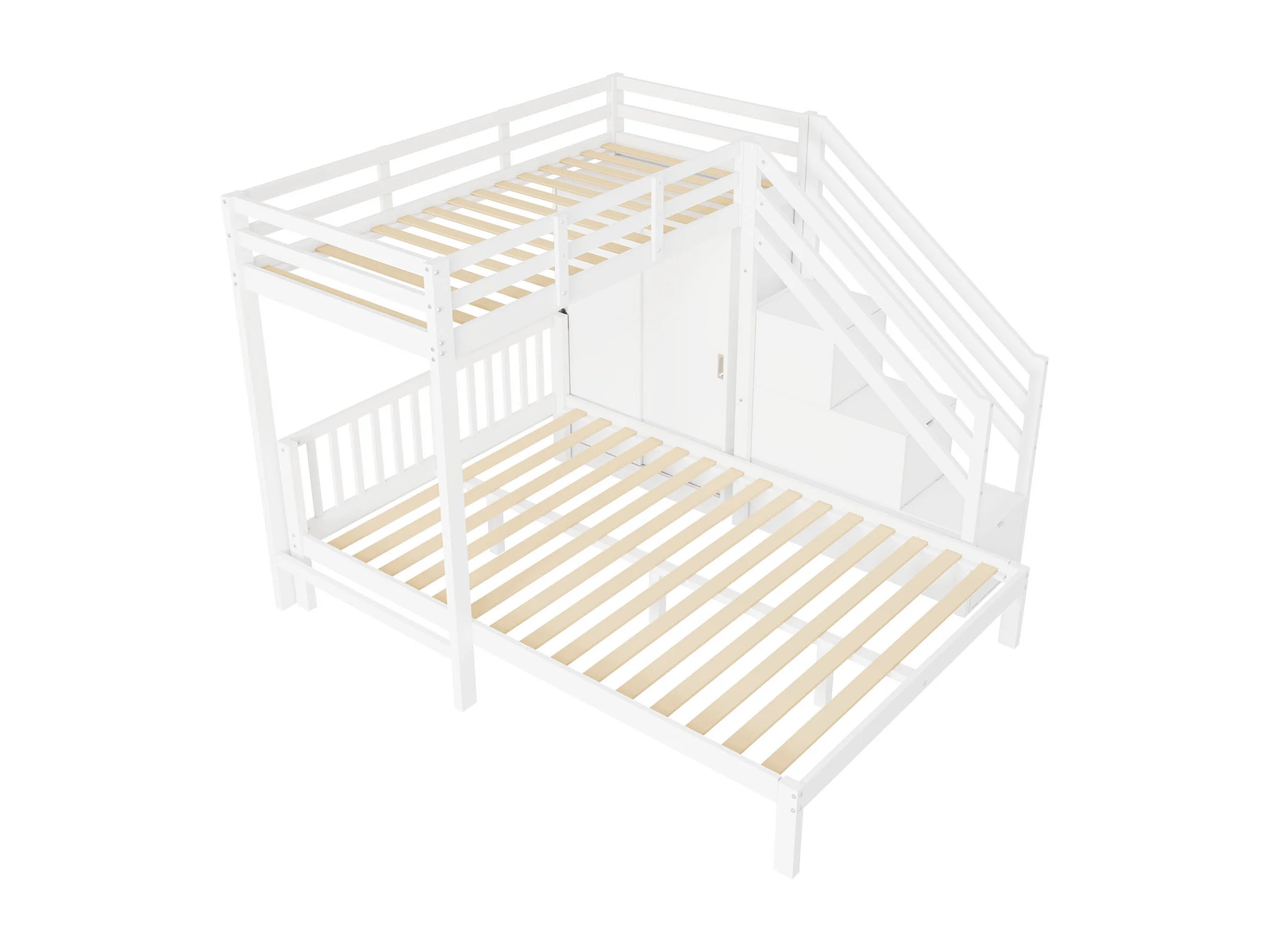 Lit superposé 90×200 cm + 140×200 cm blanc, bois massif + MDF, avec escalier de rangement et penderie intégrée