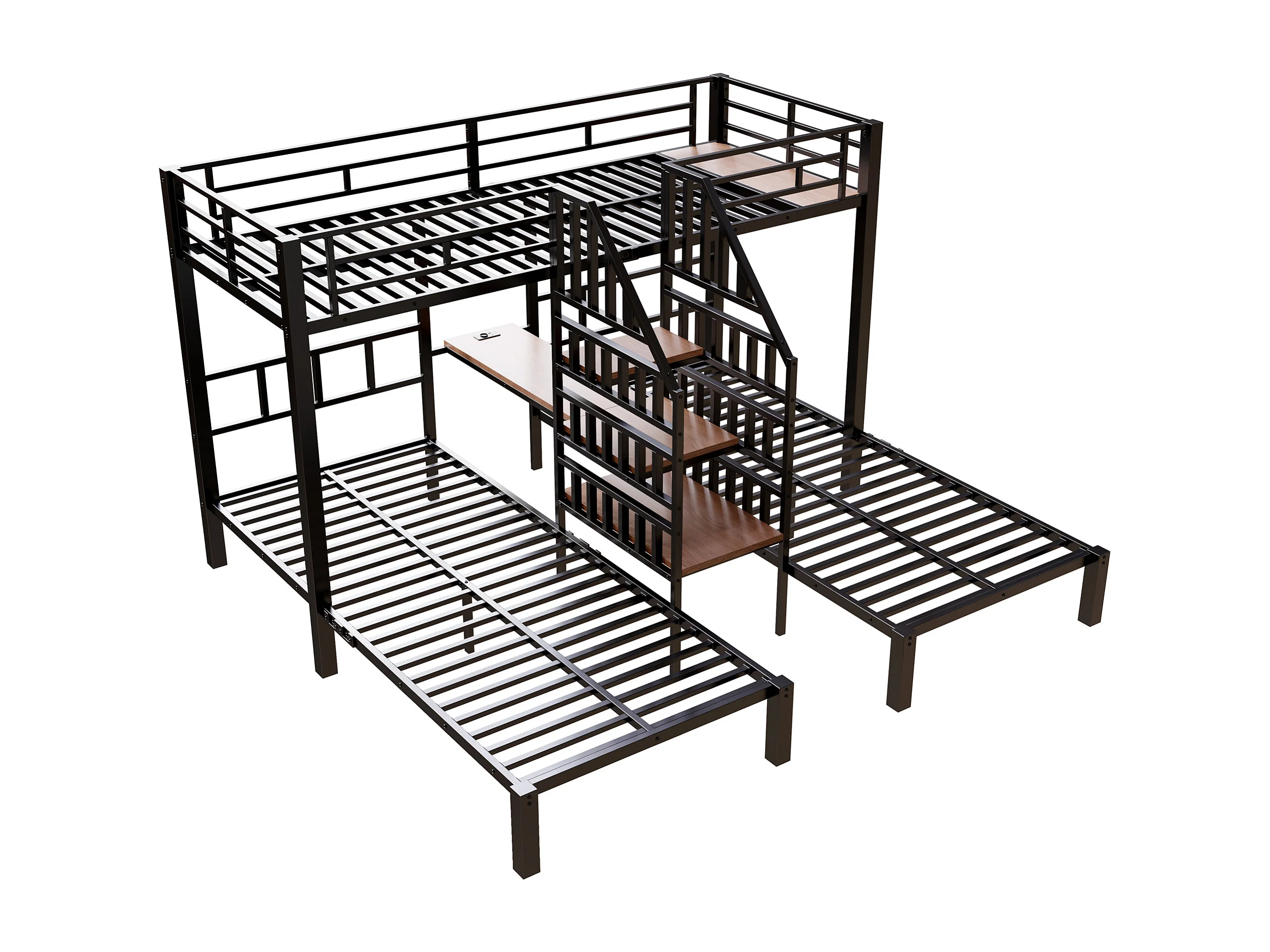 Lit superposé 90x200 cm - 3 couchages - avec bande lumineuse LED - équipé de 2 ports USB + 1 prise électrique - avec bureau - noir (matelas non inclus)