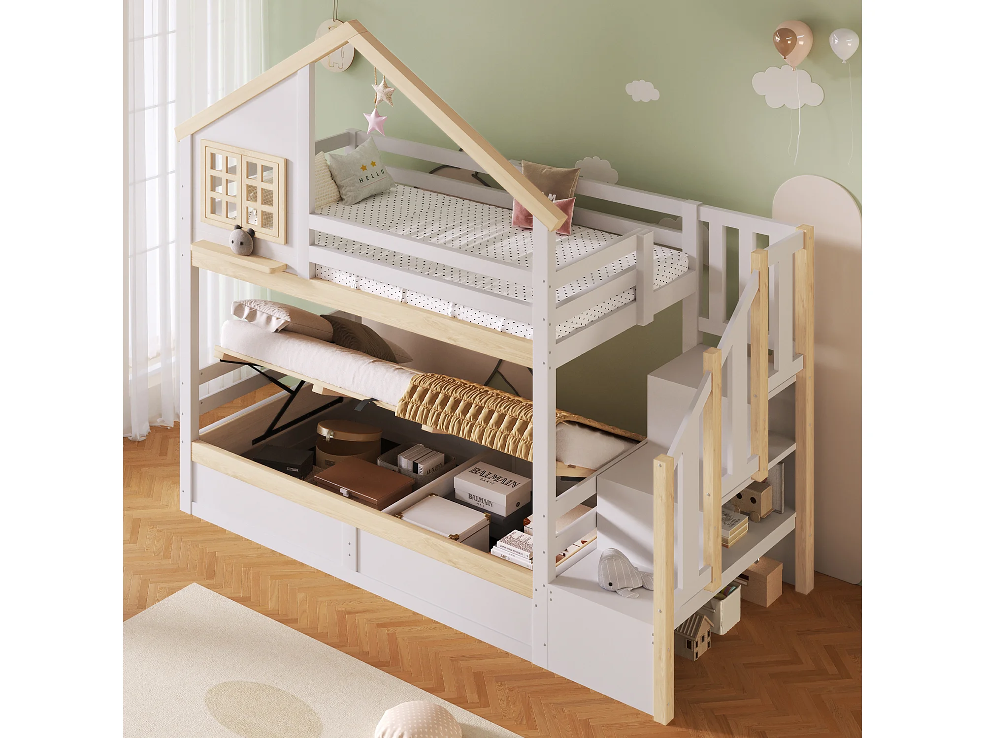 Lit superposé 90x200 cm - avec barrières de lit - avec échelle de rangement - blanc + naturel (matelas non inclus)