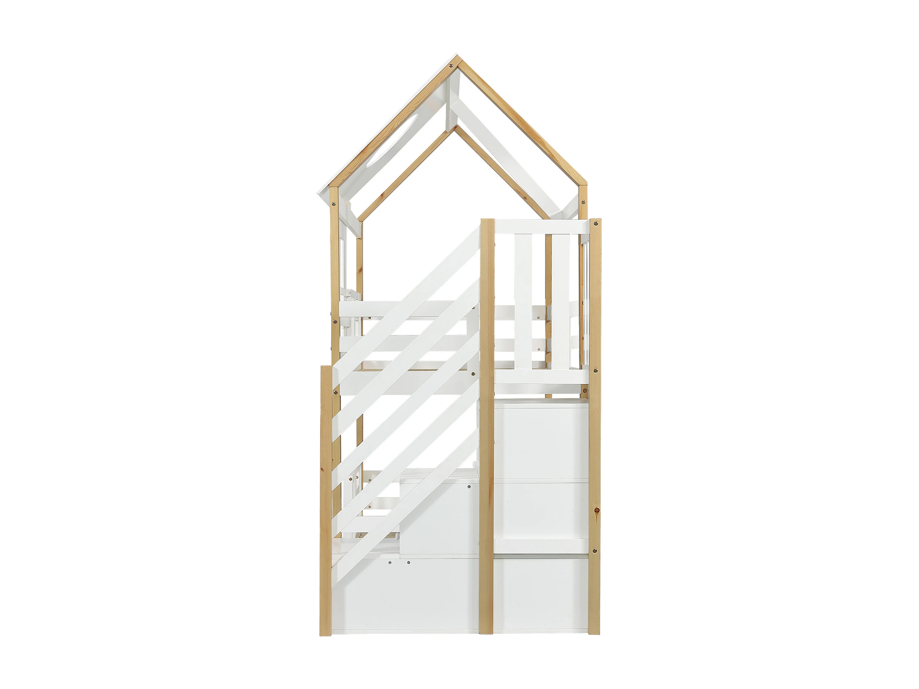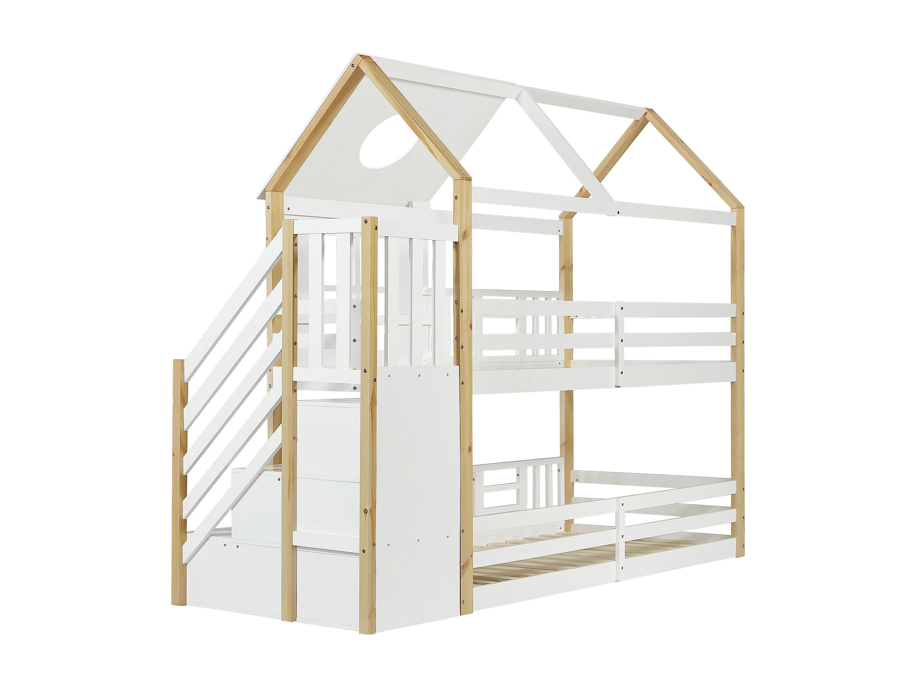 Lit superposé 90x200 cm avec rangement, lit cabane, pin, contreplaqué, MDF, blanc et naturel , sans matelas