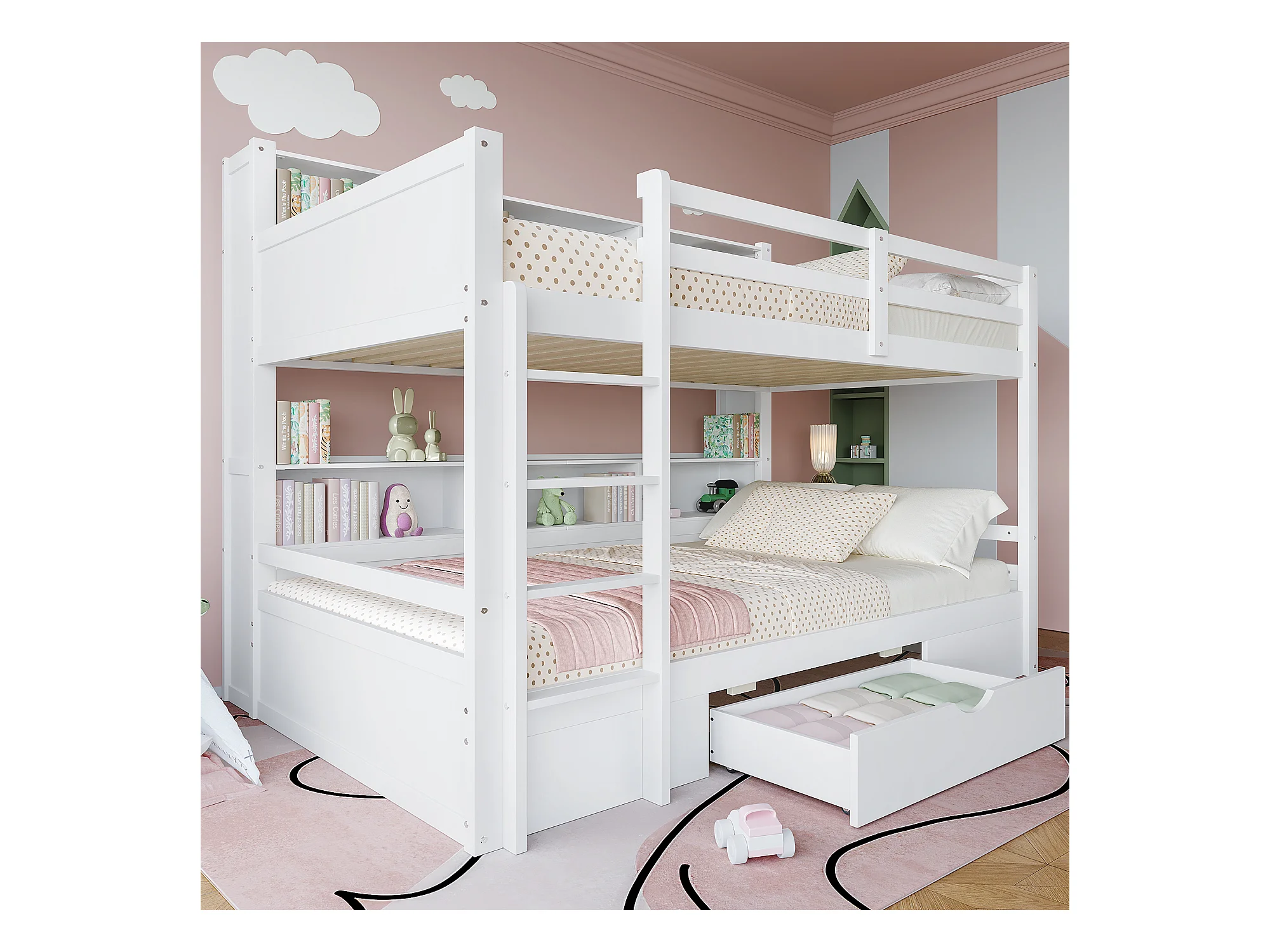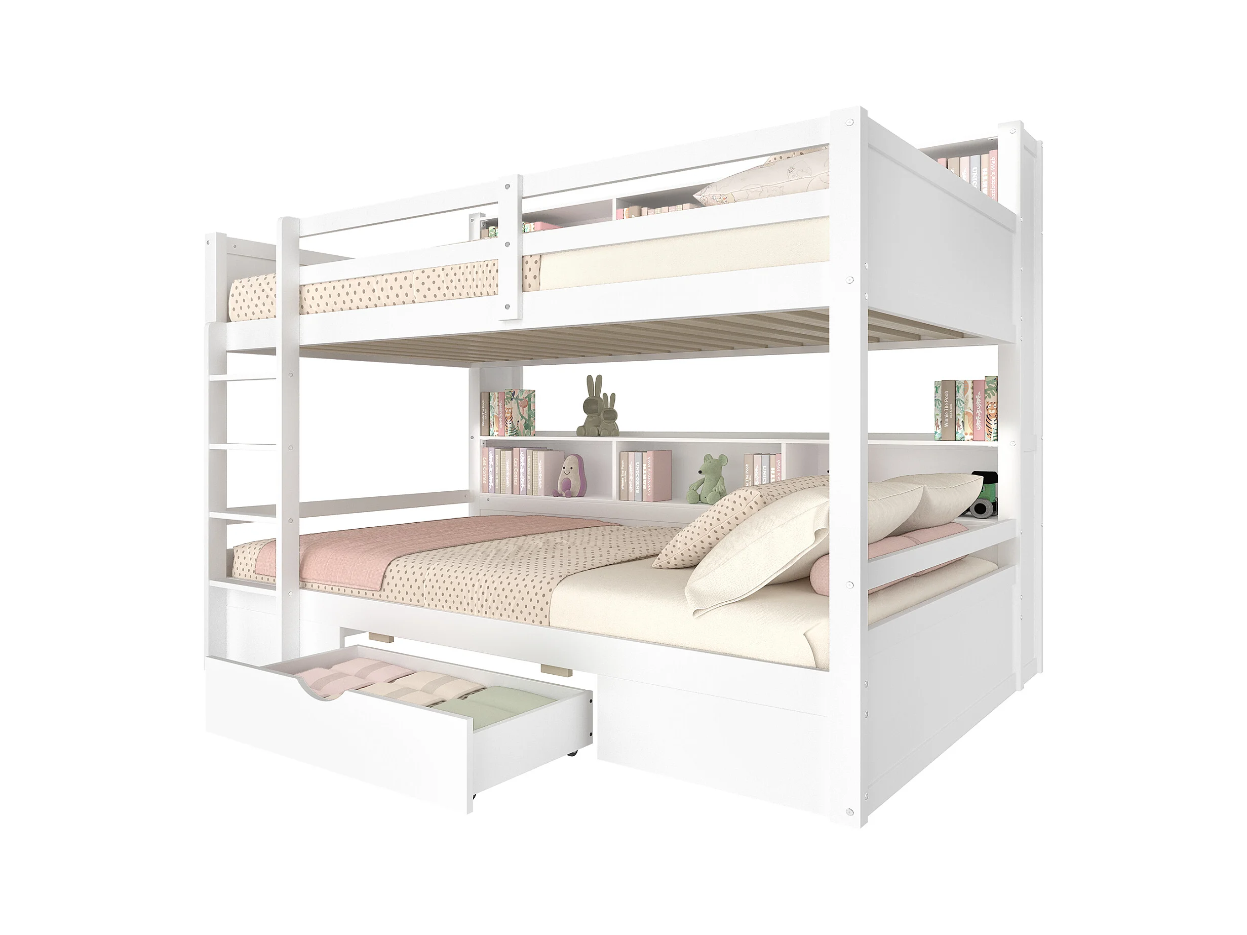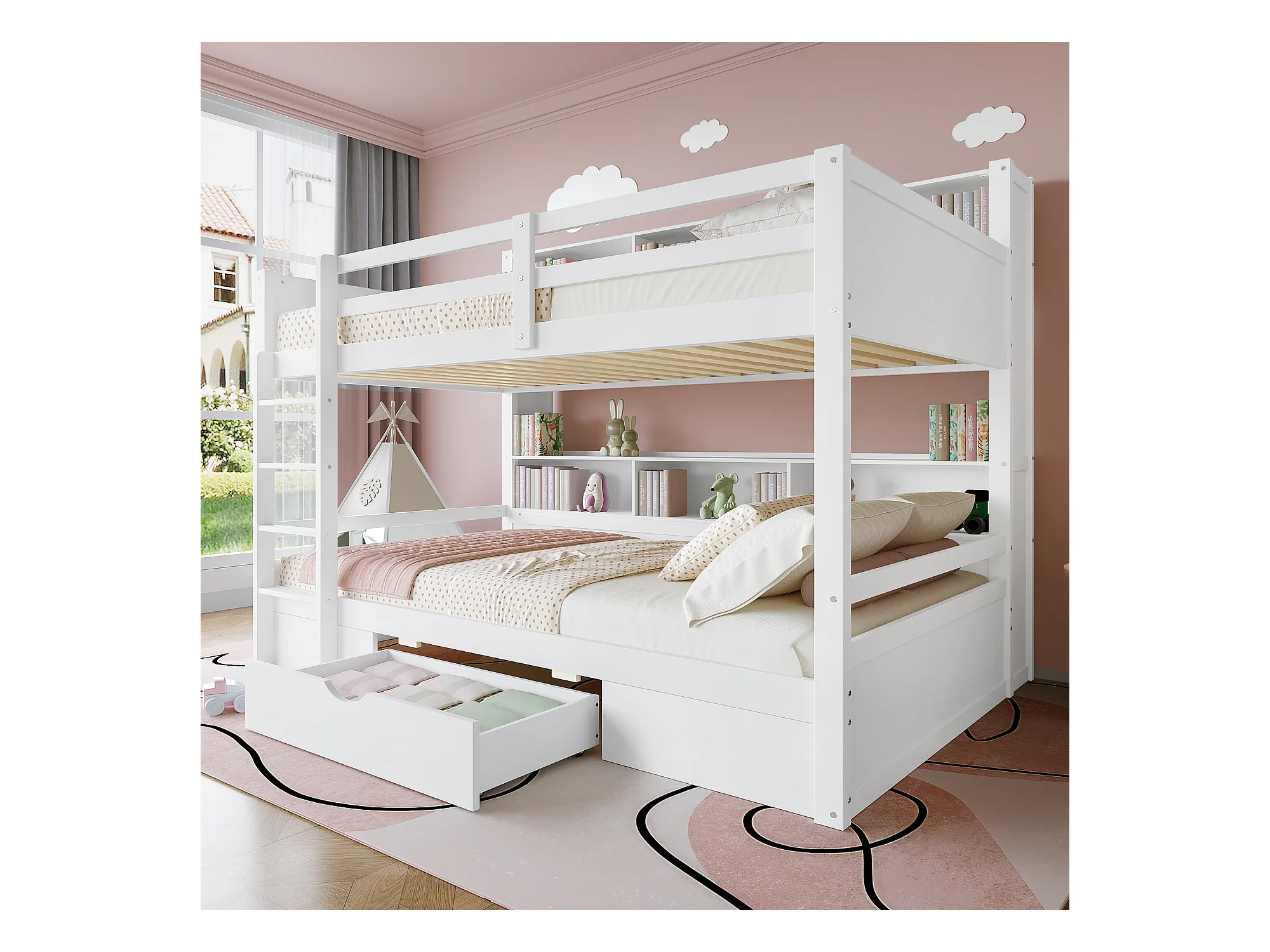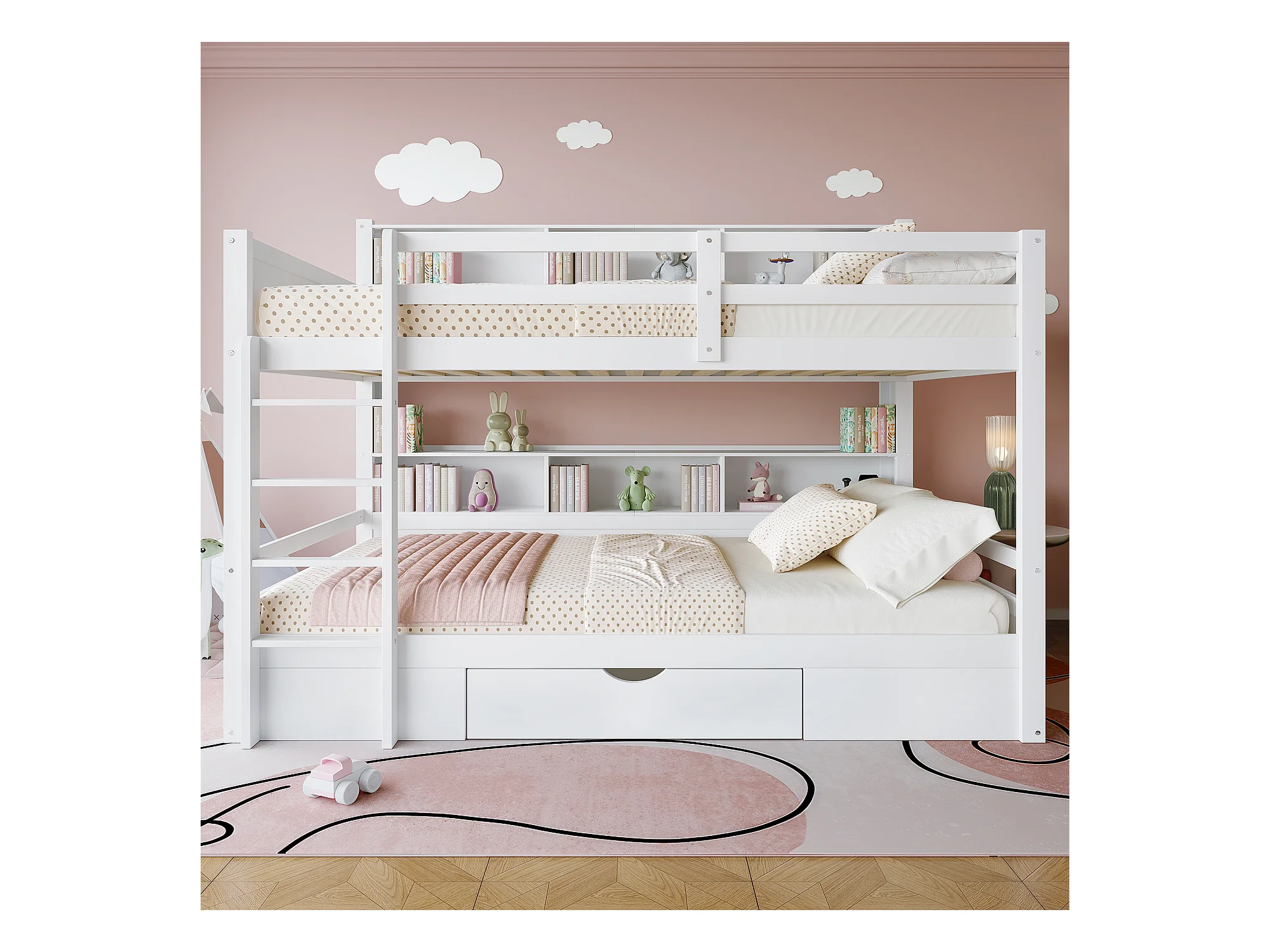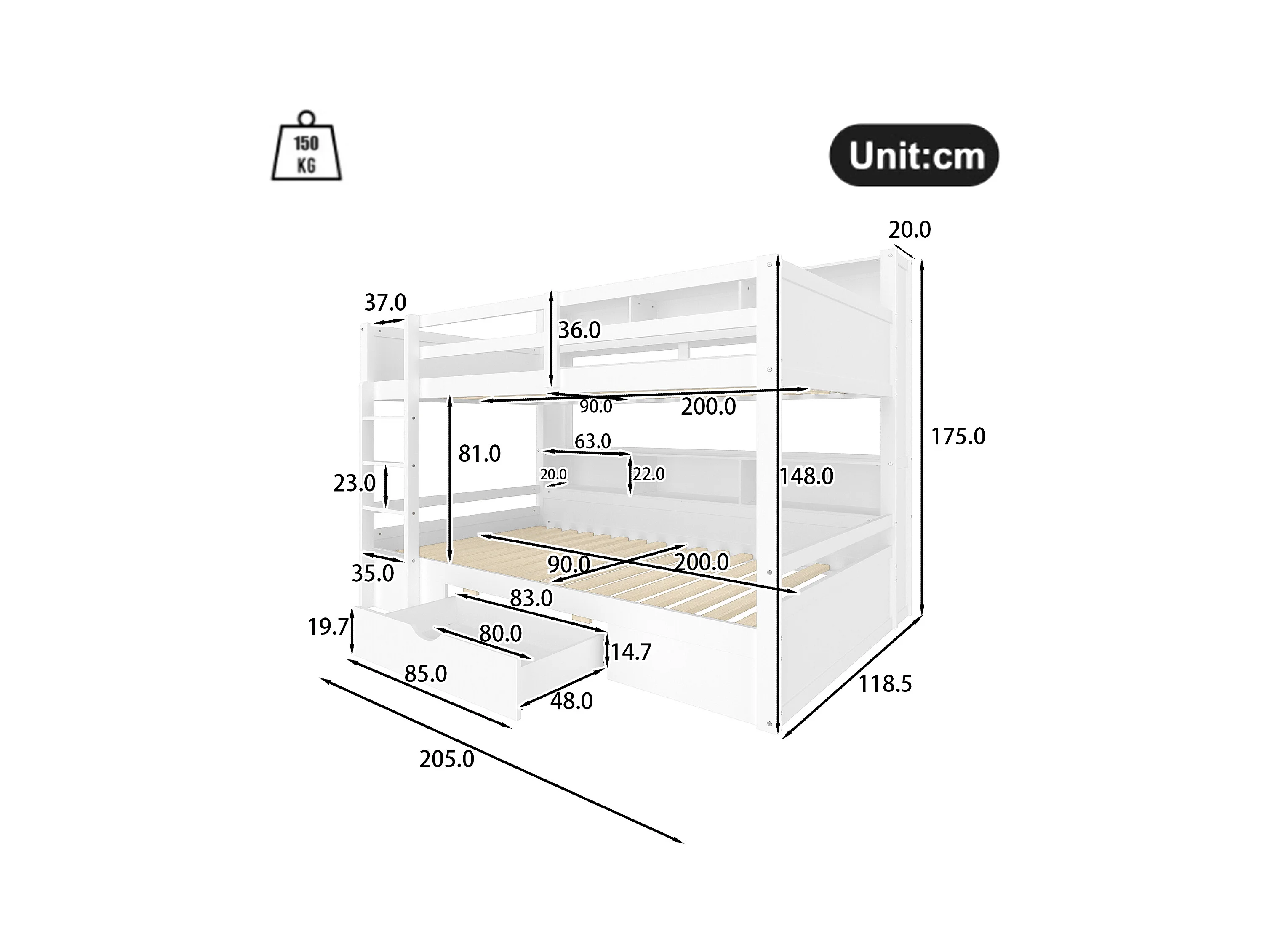 Lit superposé 90x200 cm, lit simple pour enfant avec tiroirs et compartiments de rangement, sans matelas, Blanc