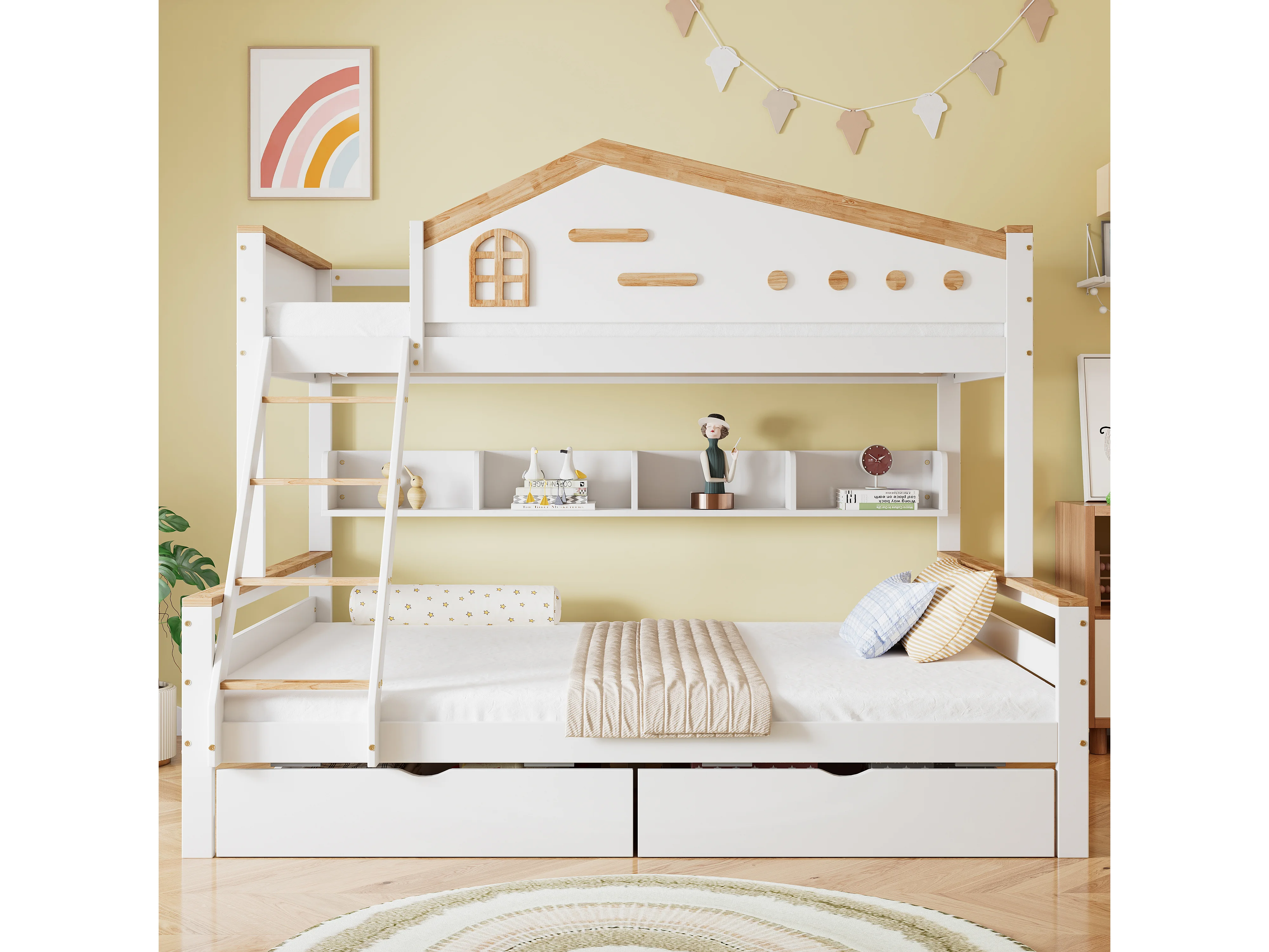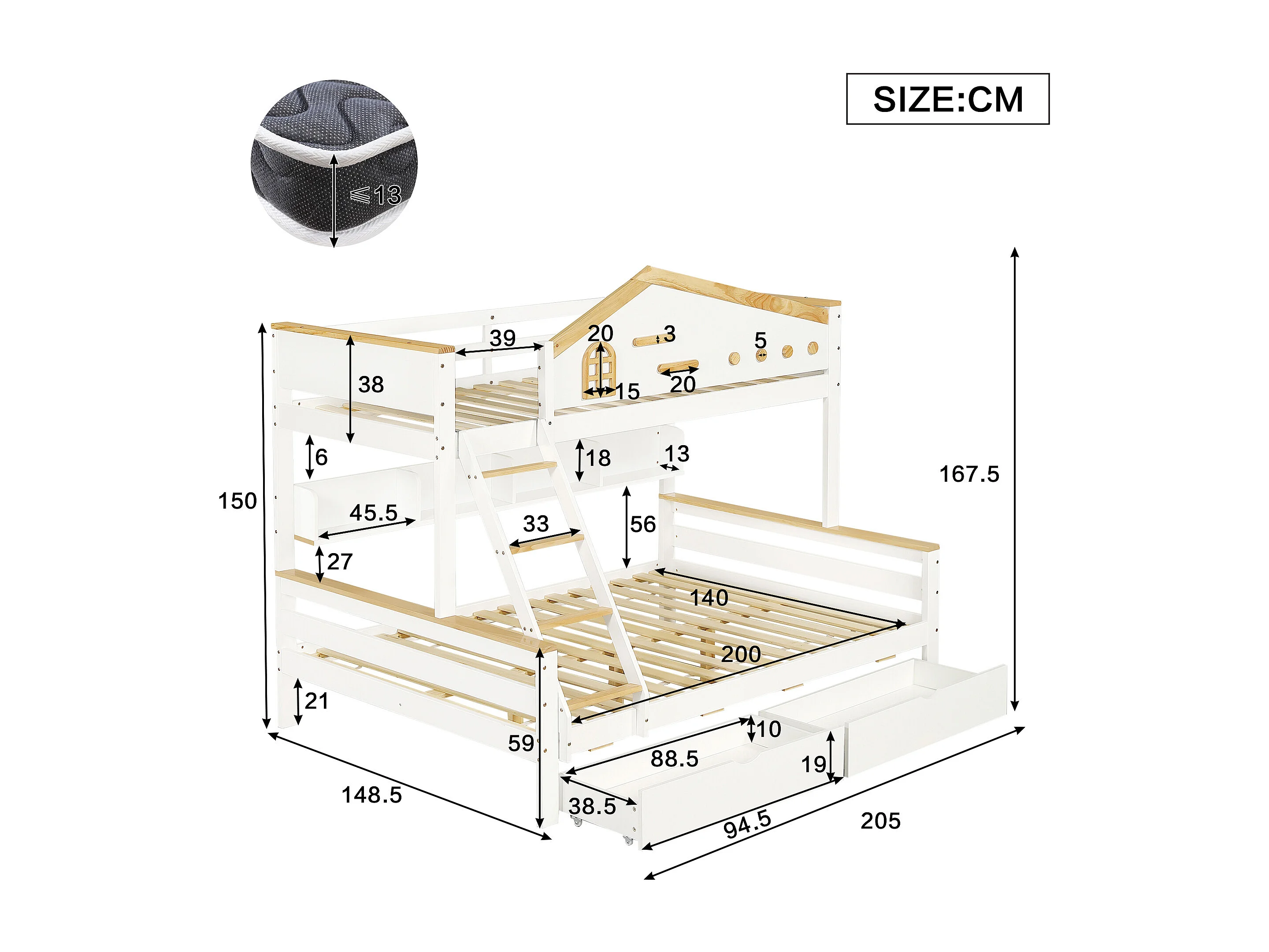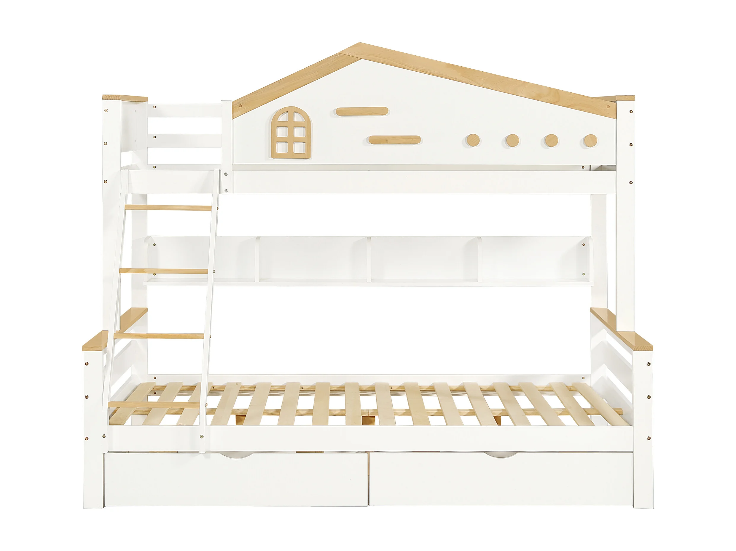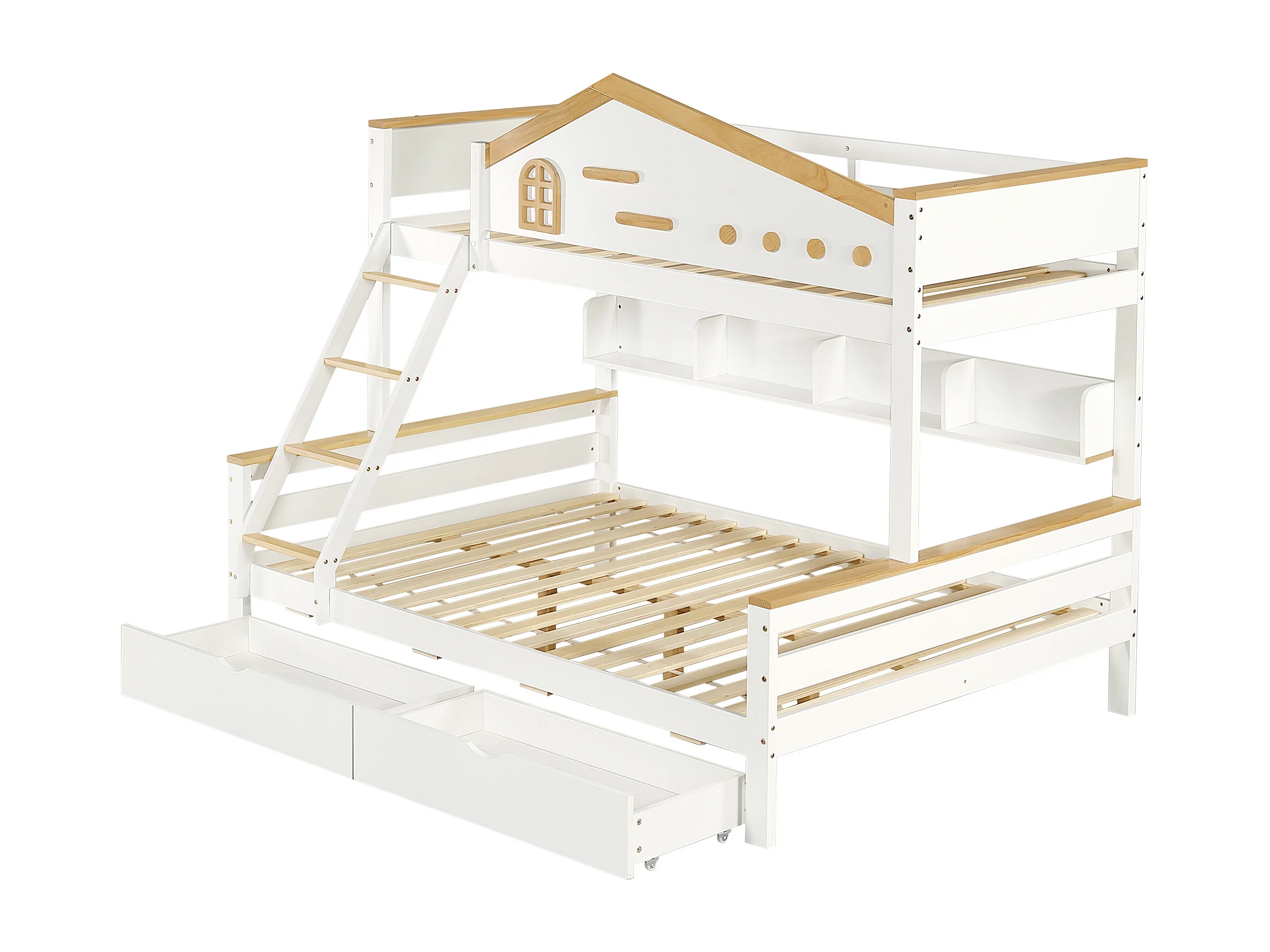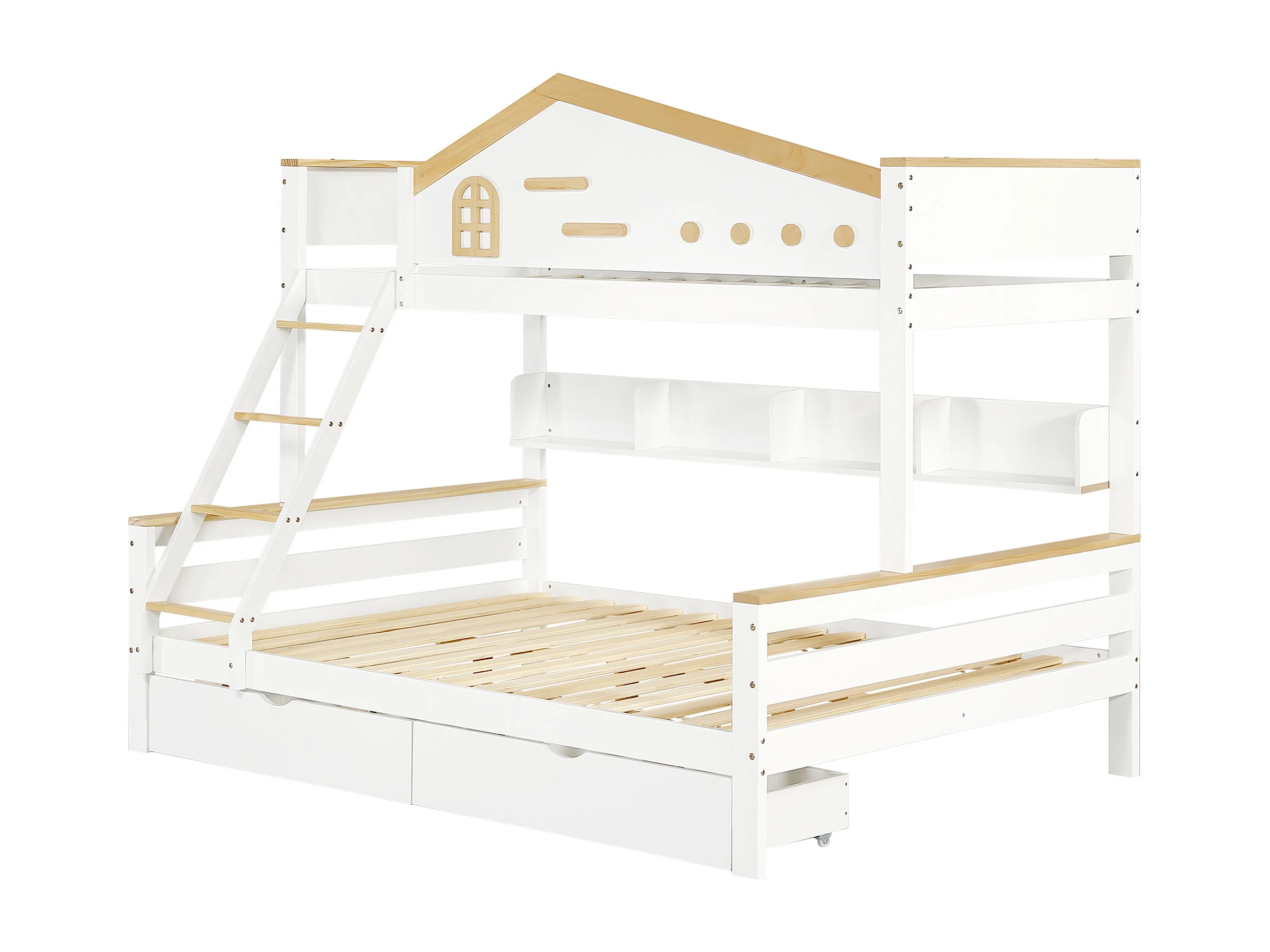 Lit superposé enfant 90x200 cm et 140x200 cm avec 2 tiroirs et étagère, bois et MDF, blanc et naturel (Sans matelas)