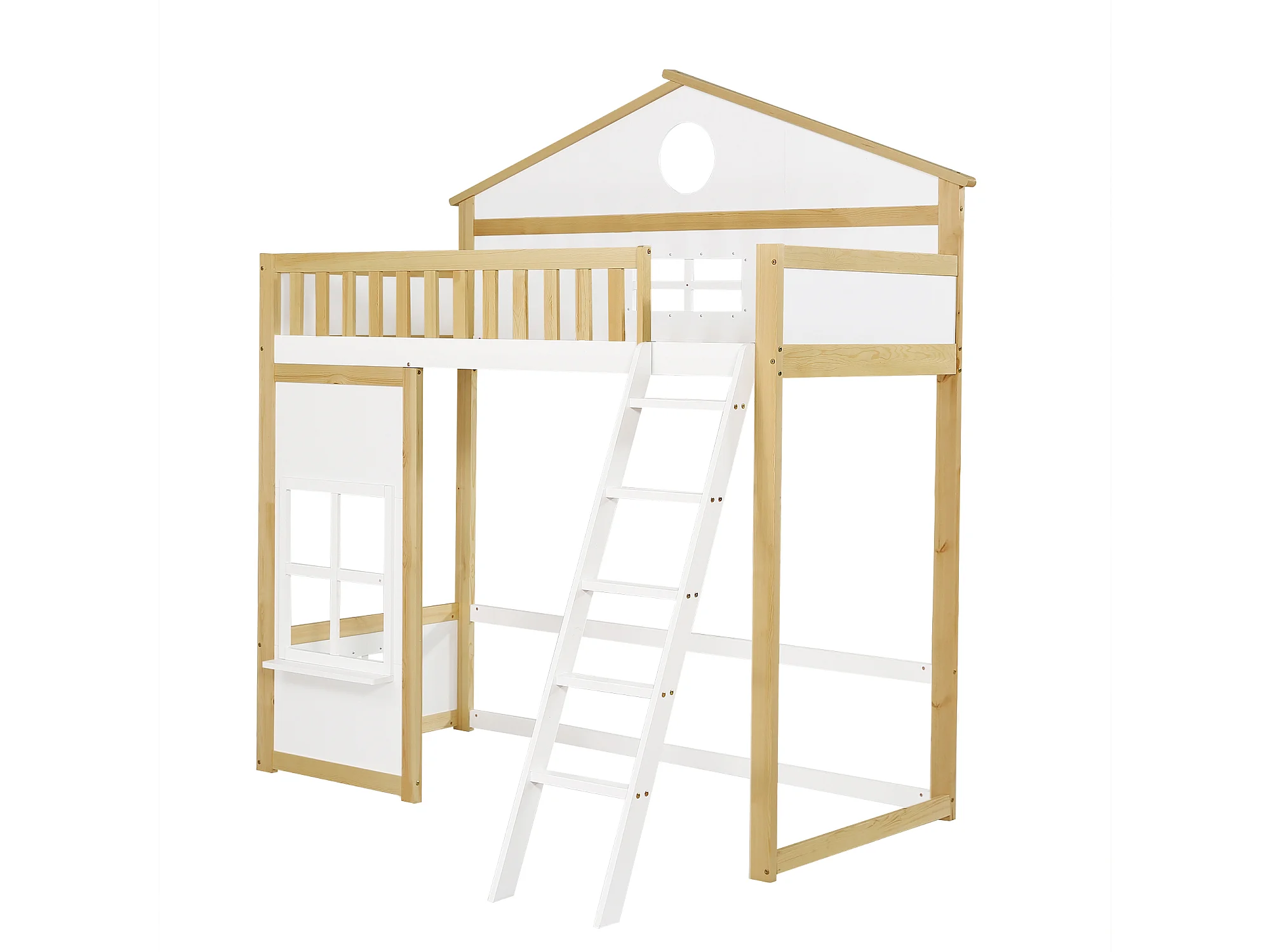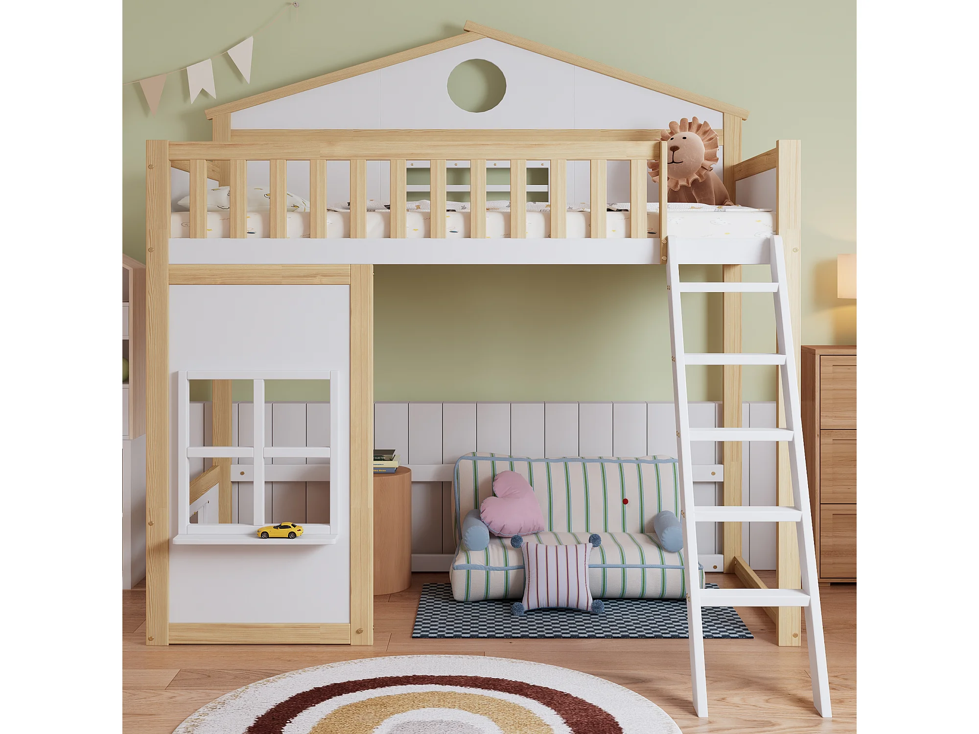 Lit superposé 90x200cm avec échelle et rambarde Matériau MDF en blanc pour enfants et adolescents