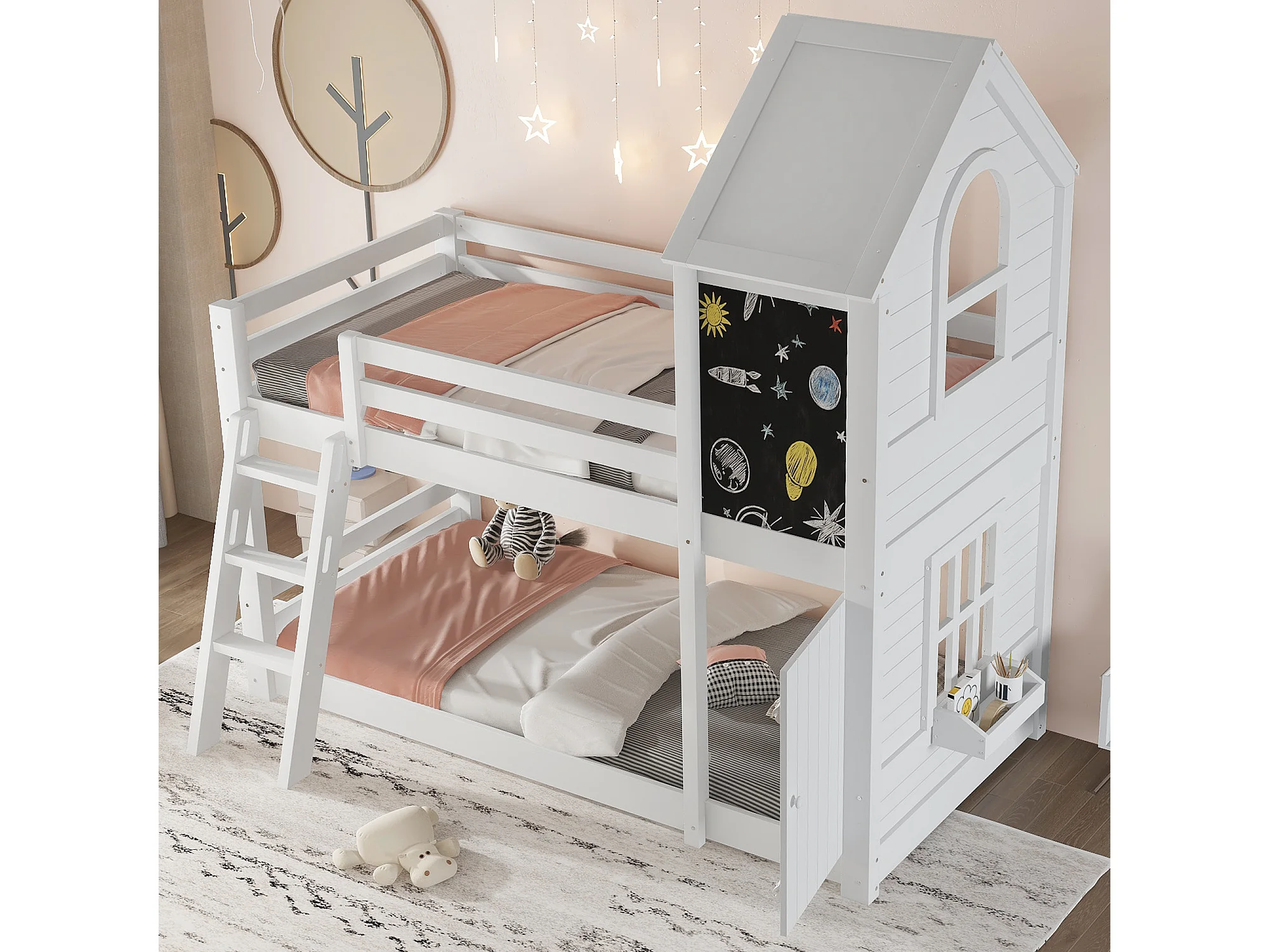 Lit superposé 90x200cm avec Échelle etpetite porte et tableau noir Panneaux de particules en blanc pour enfants et adolescents