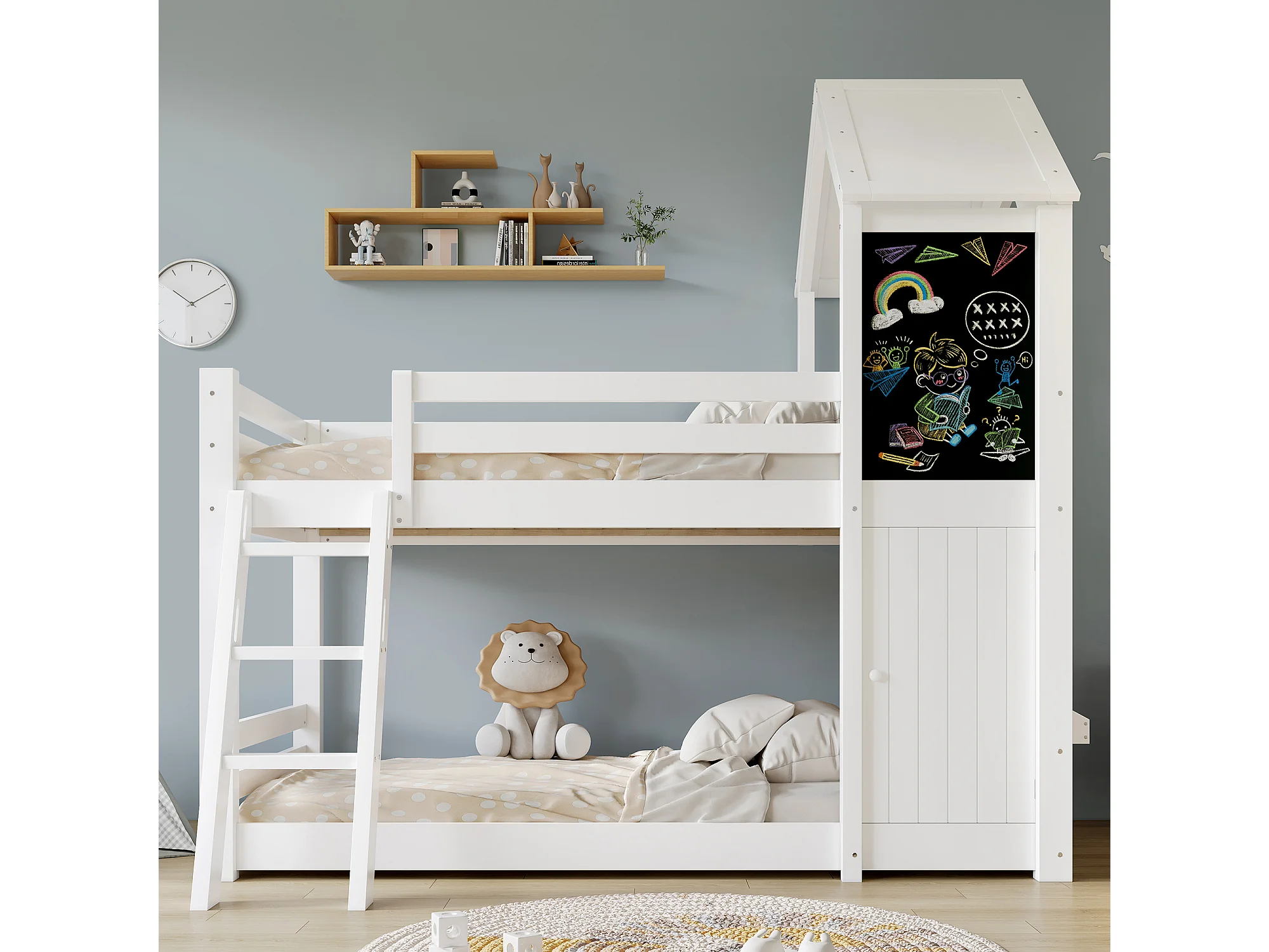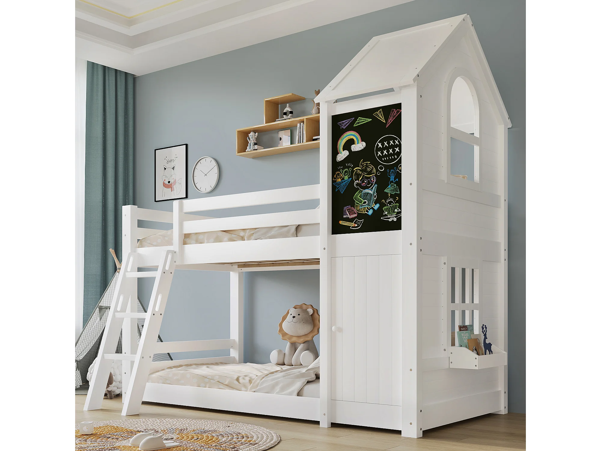 Lit superposé enfant 90x200 cm avec petite porte et tableau, fenêtres et toit, bois et MDF blanc (Sans matelas)