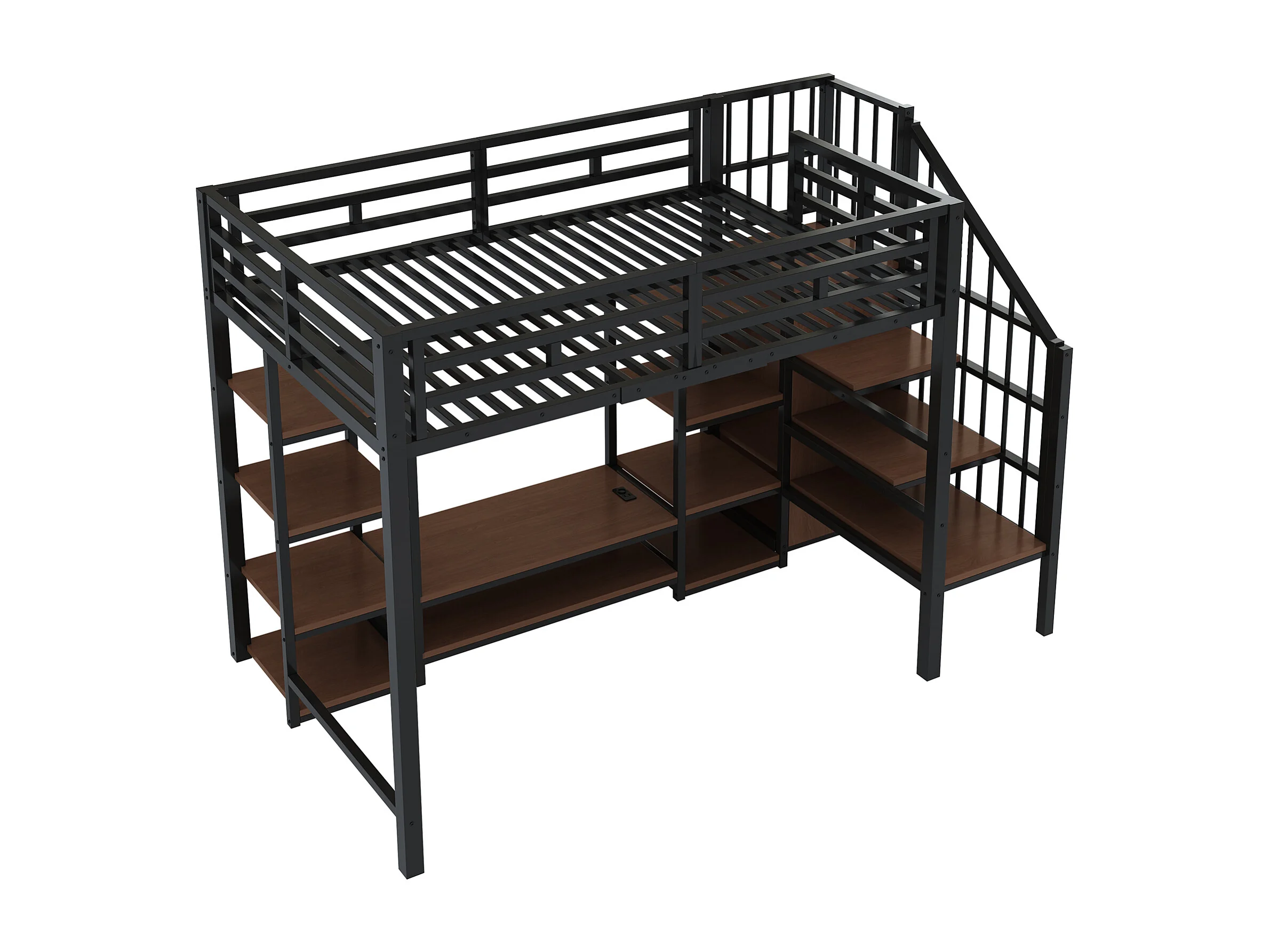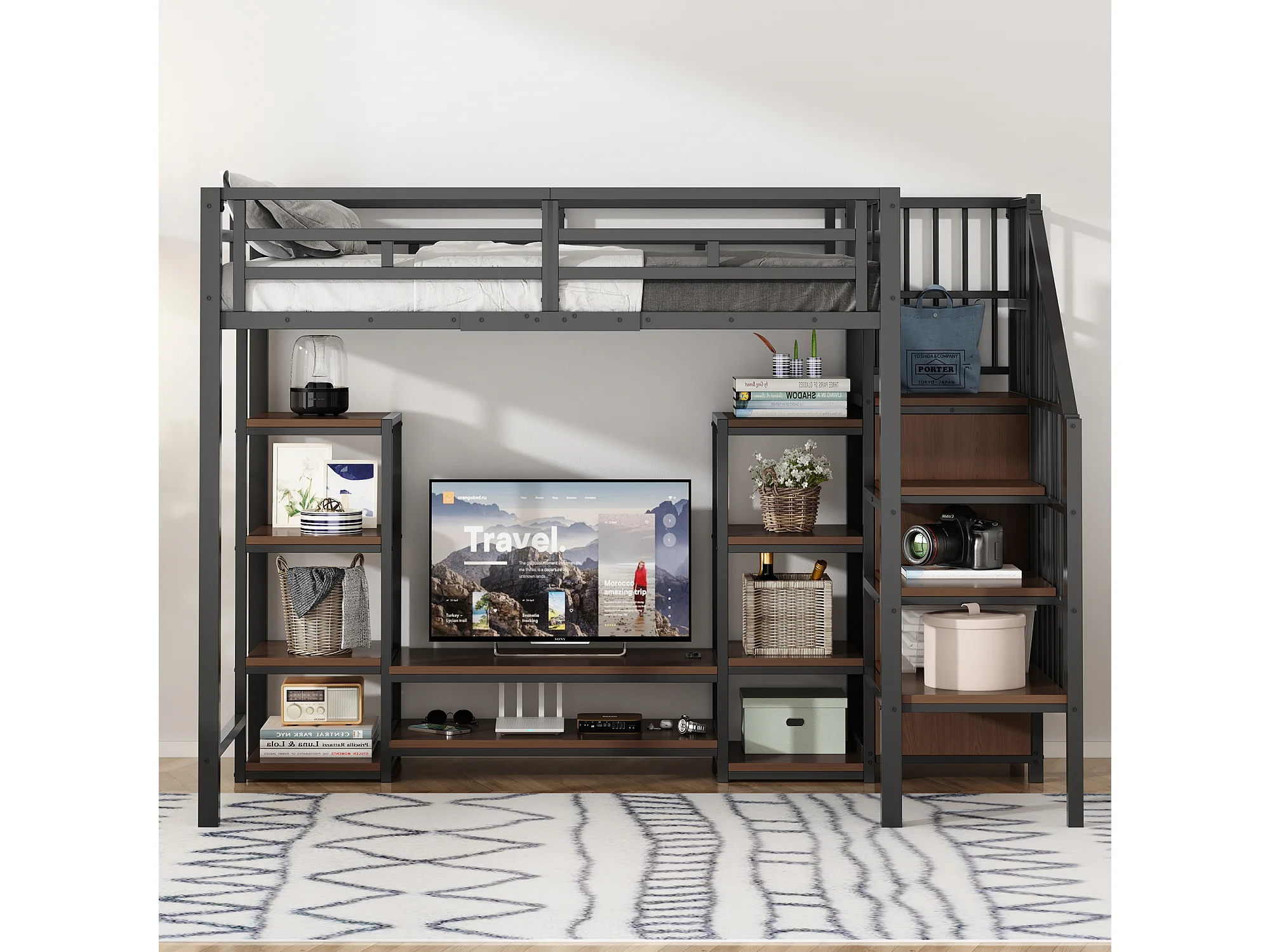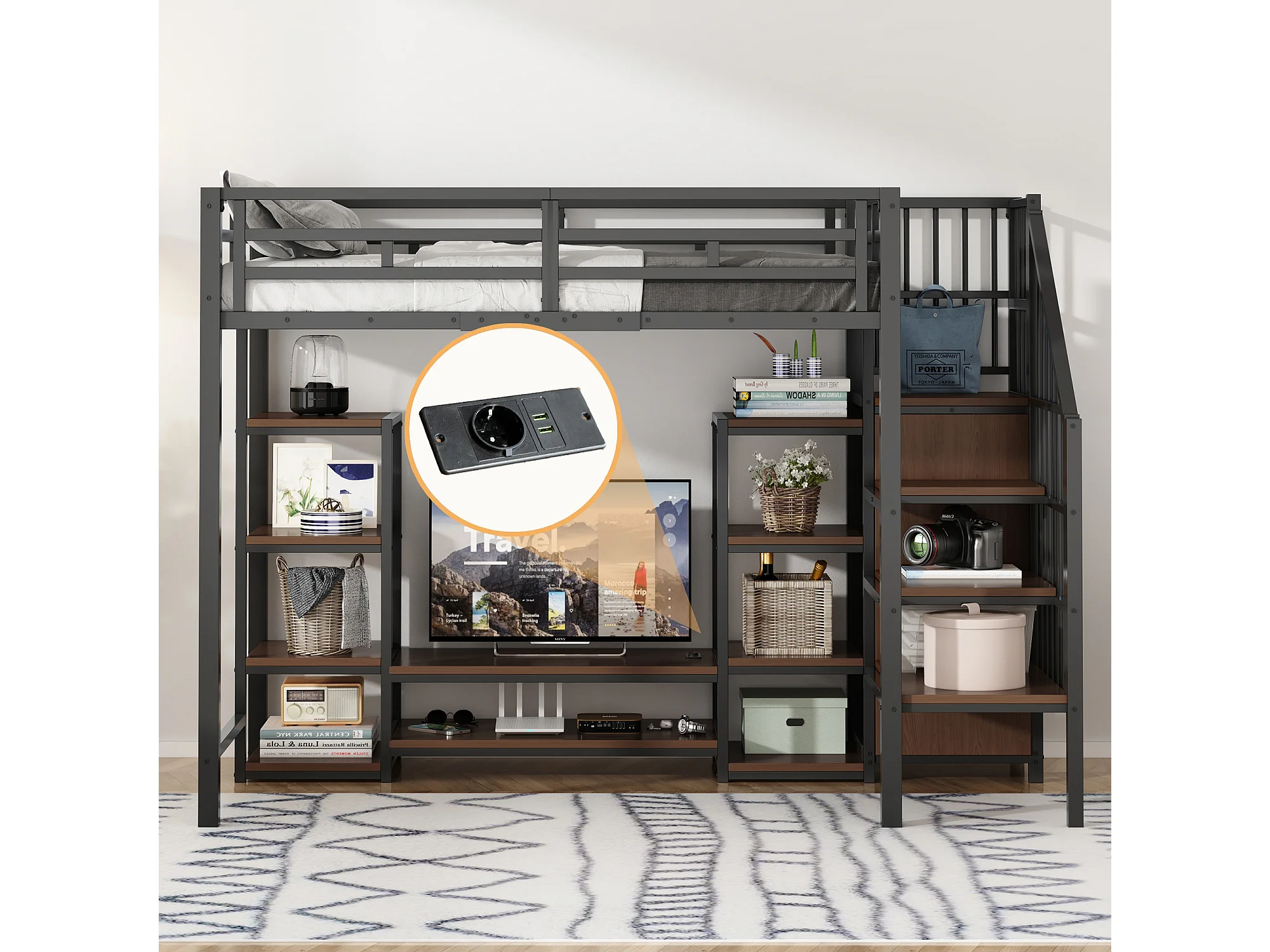 Lit mezzanine 90x200 cm avec support TV, prise et échelle de rangement en métal noir (Sans matelas)