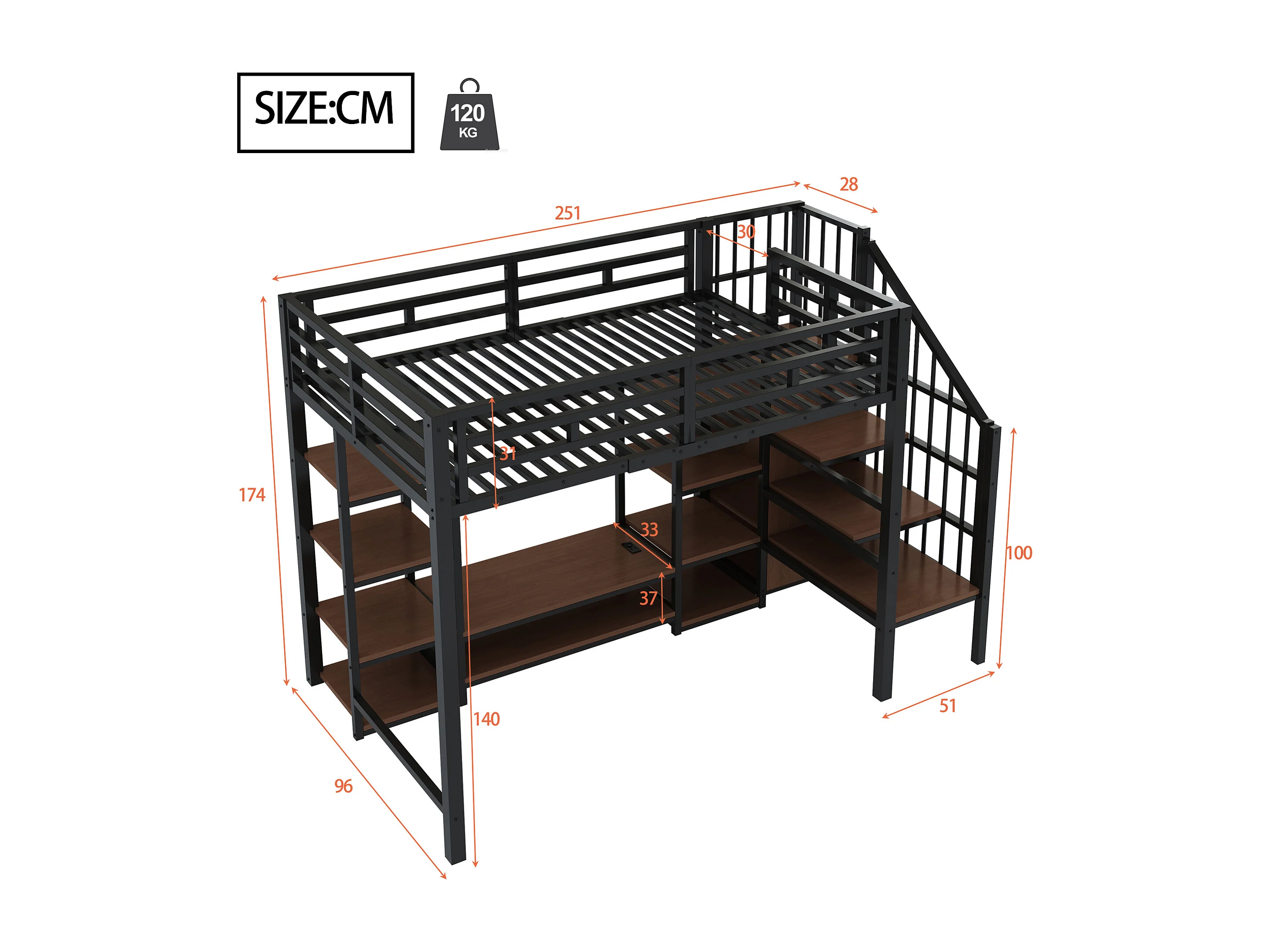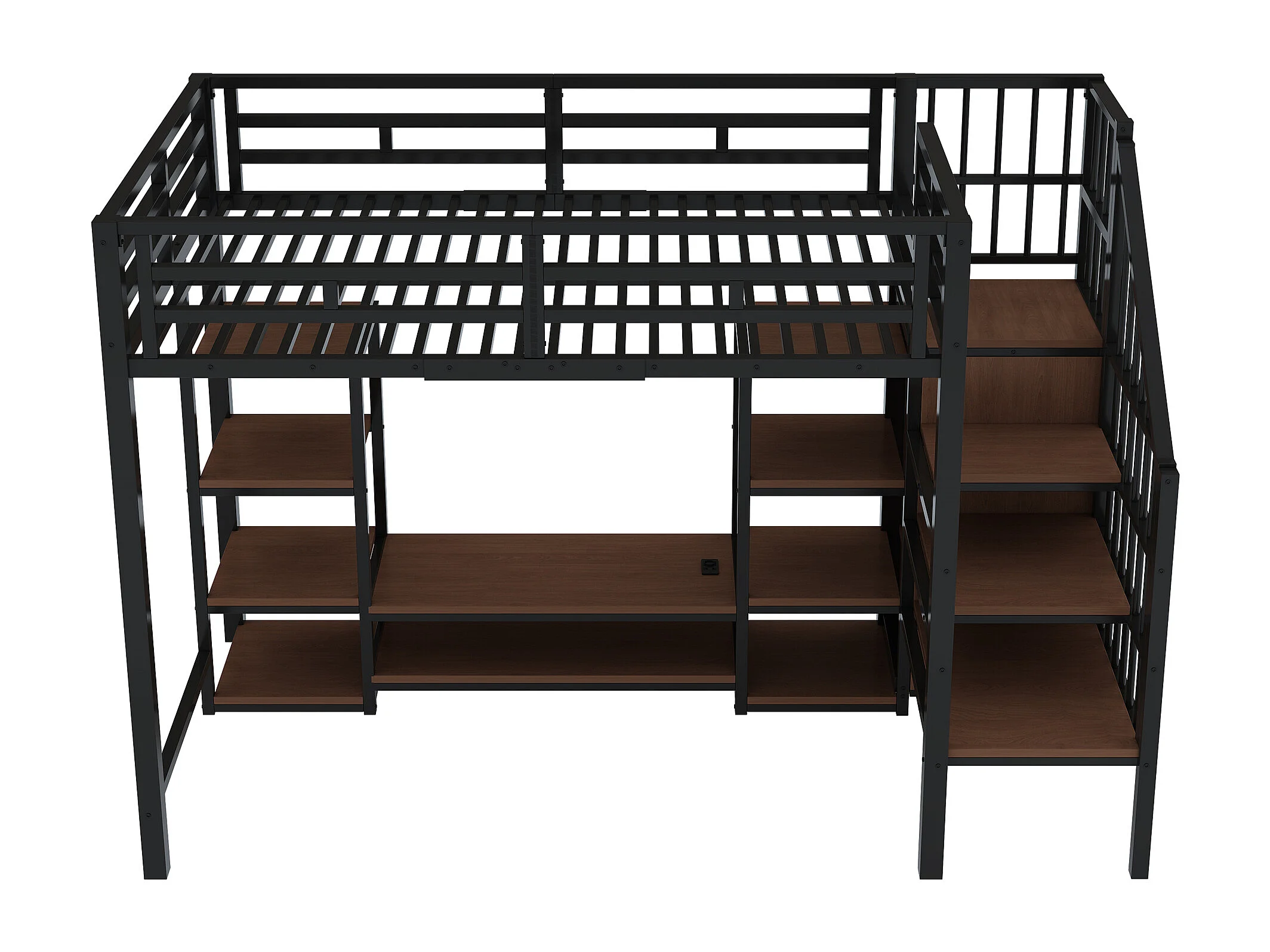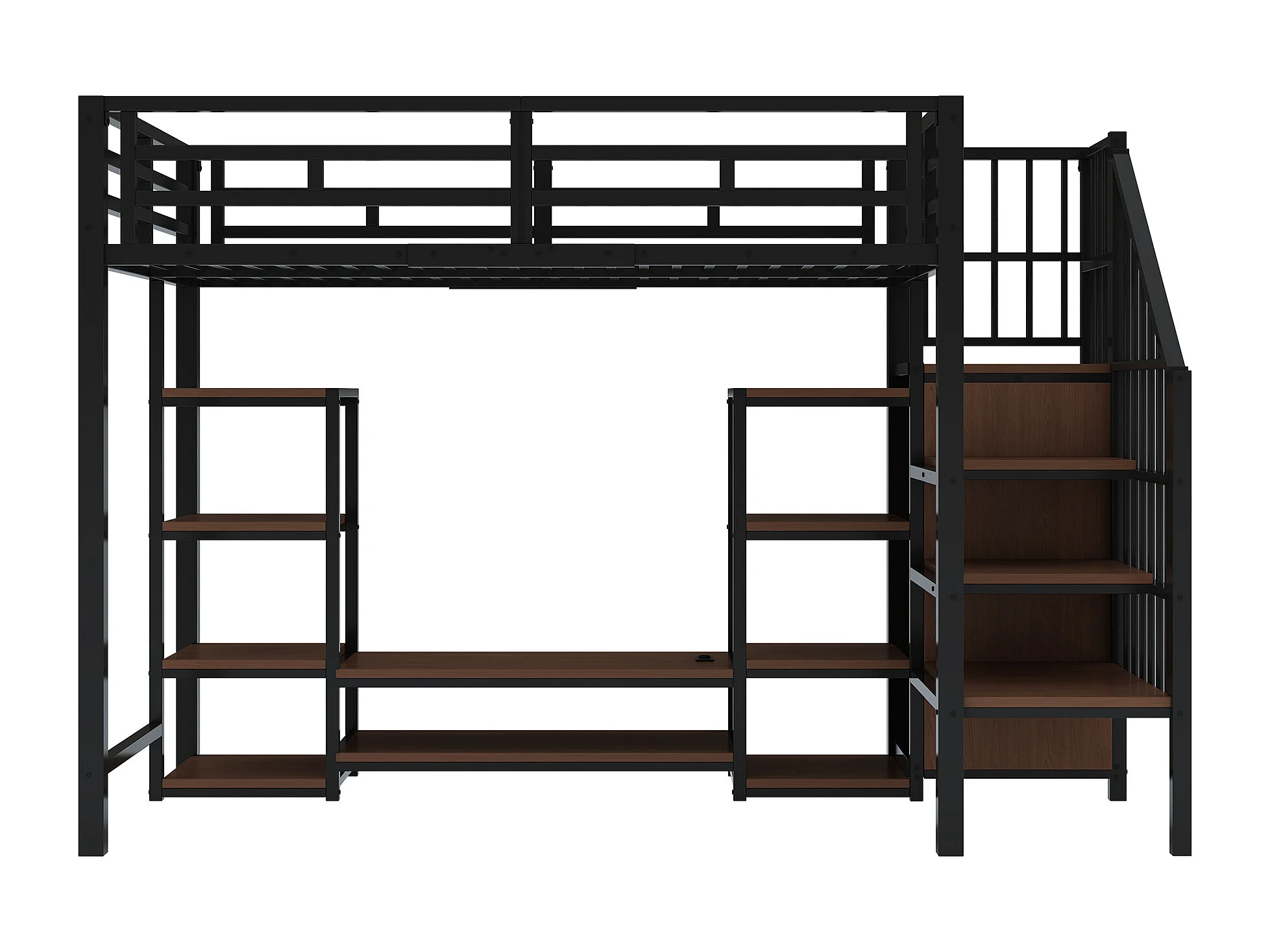 Lit mezzanine 90x200 cm avec support TV, prise et échelle de rangement en métal noir (Sans matelas)