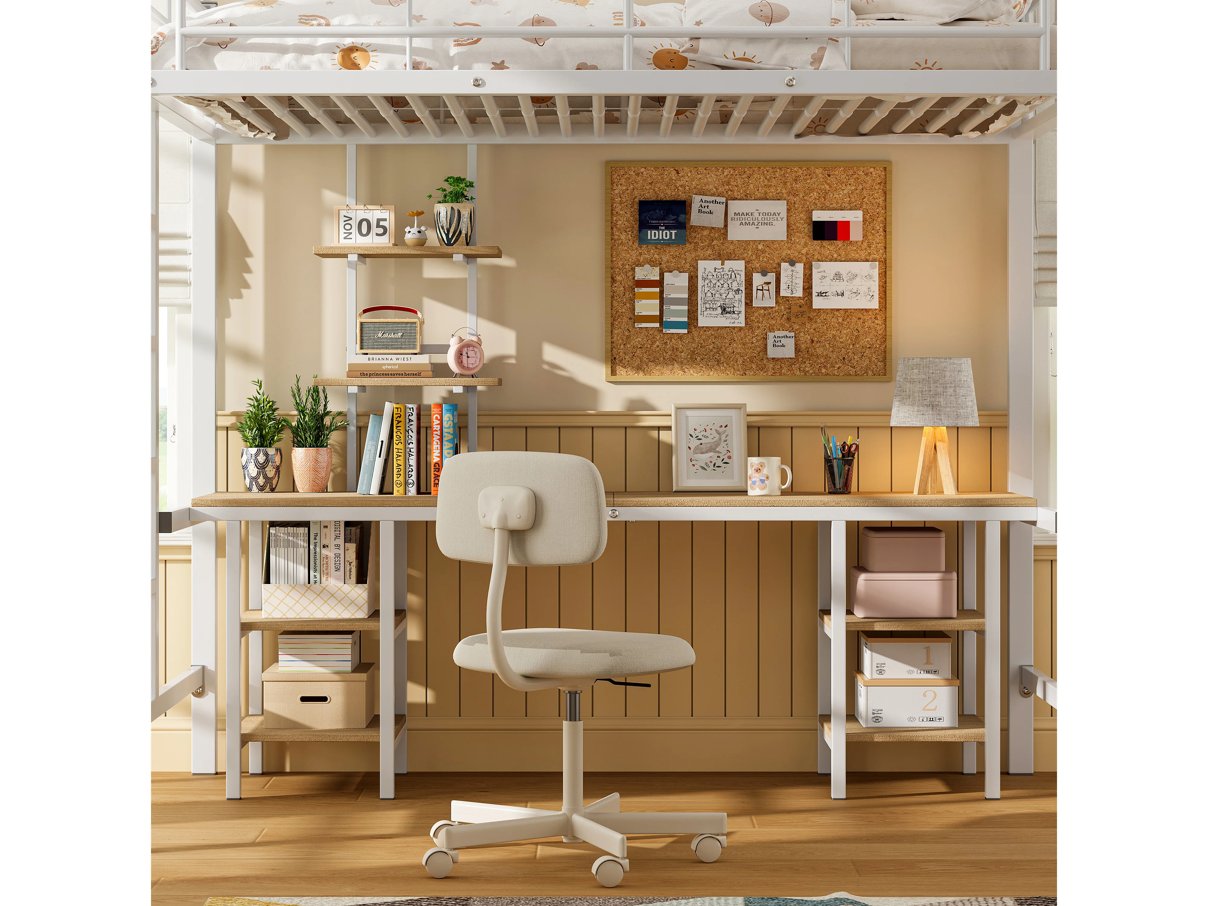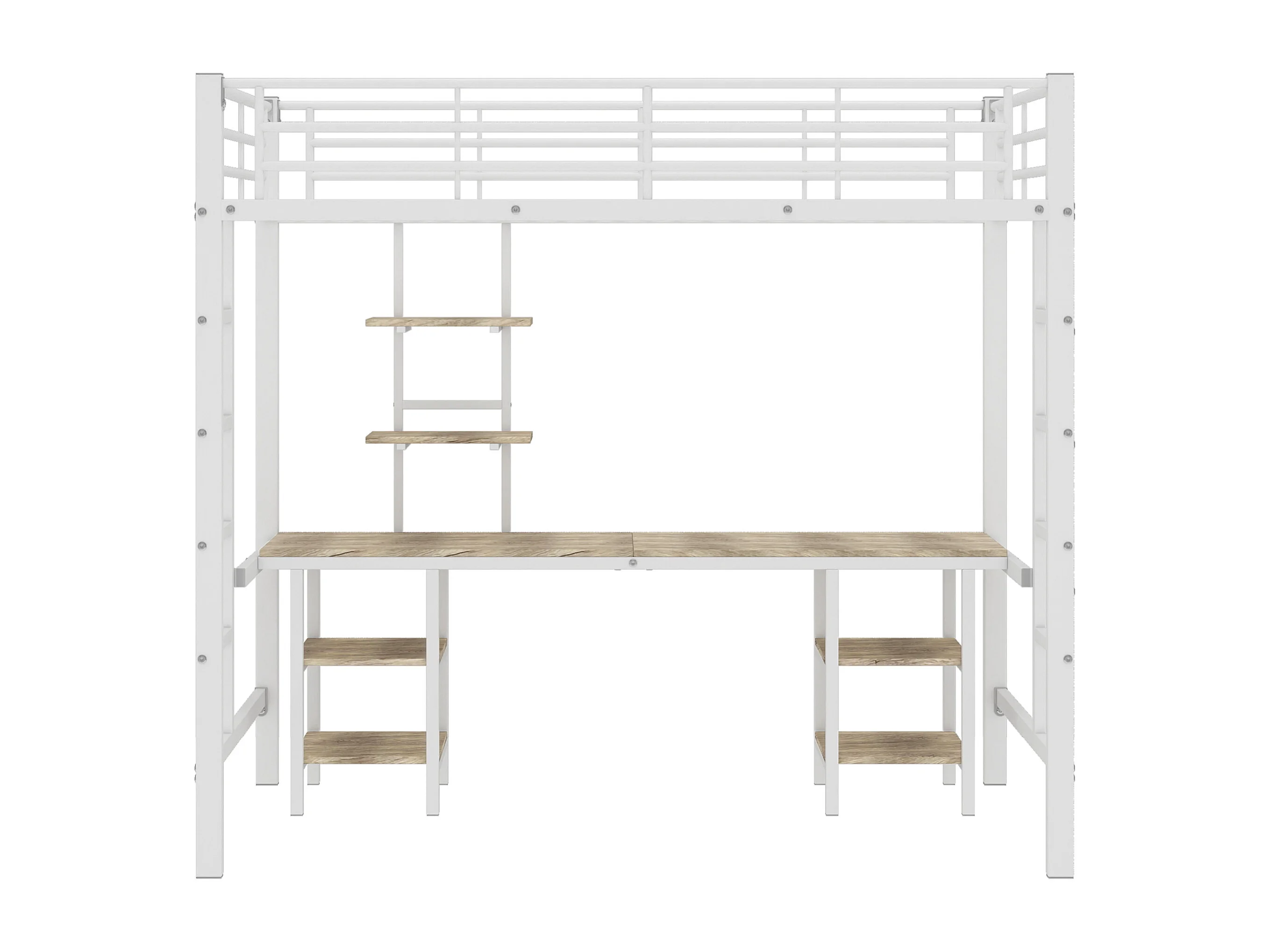 Lit mezzanine 90x200 cm avec bureau et étagères, avec échelle latérale, métal et MDF blanc (Sans matelas)