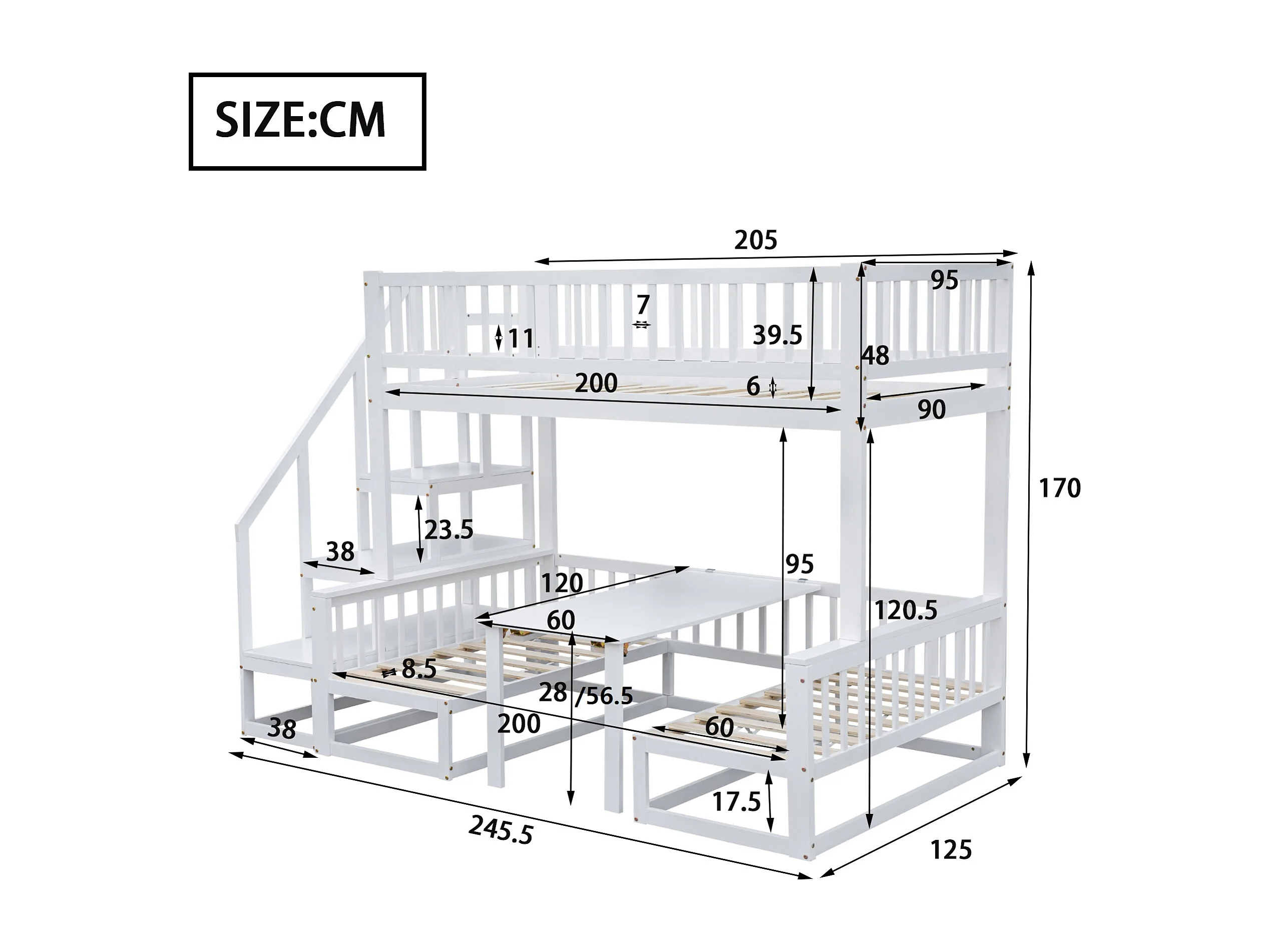 Lit superposé 90x200cm avec table réglable et échelle et espace de rangement en blanc pour enfants et adolescents