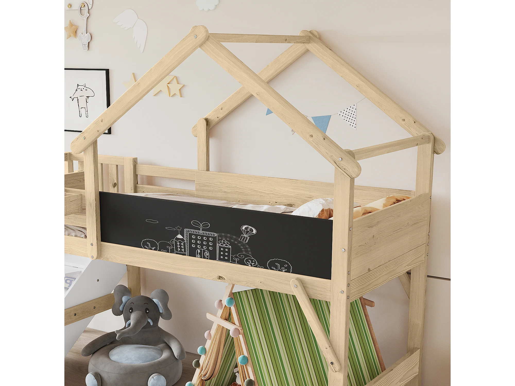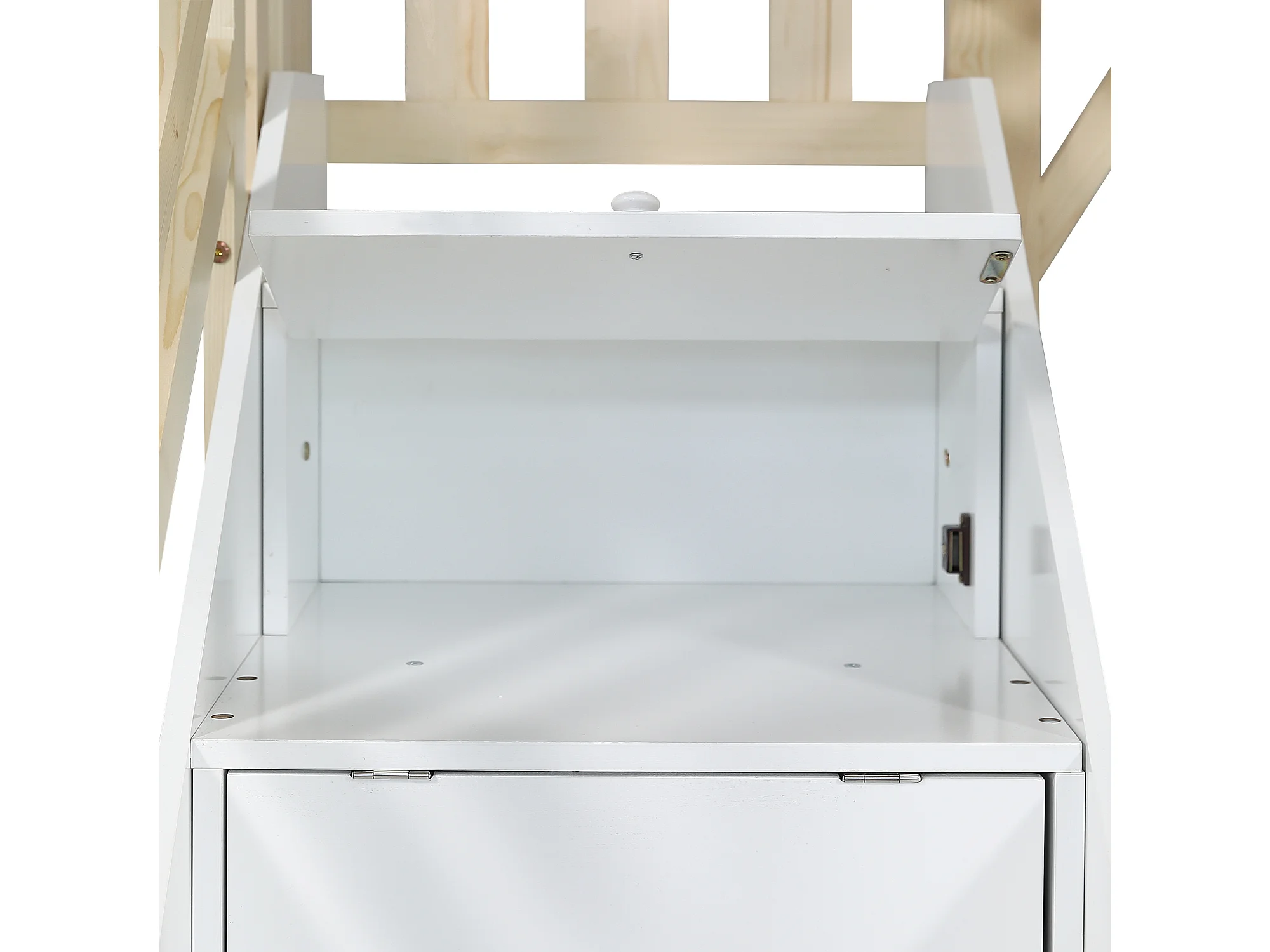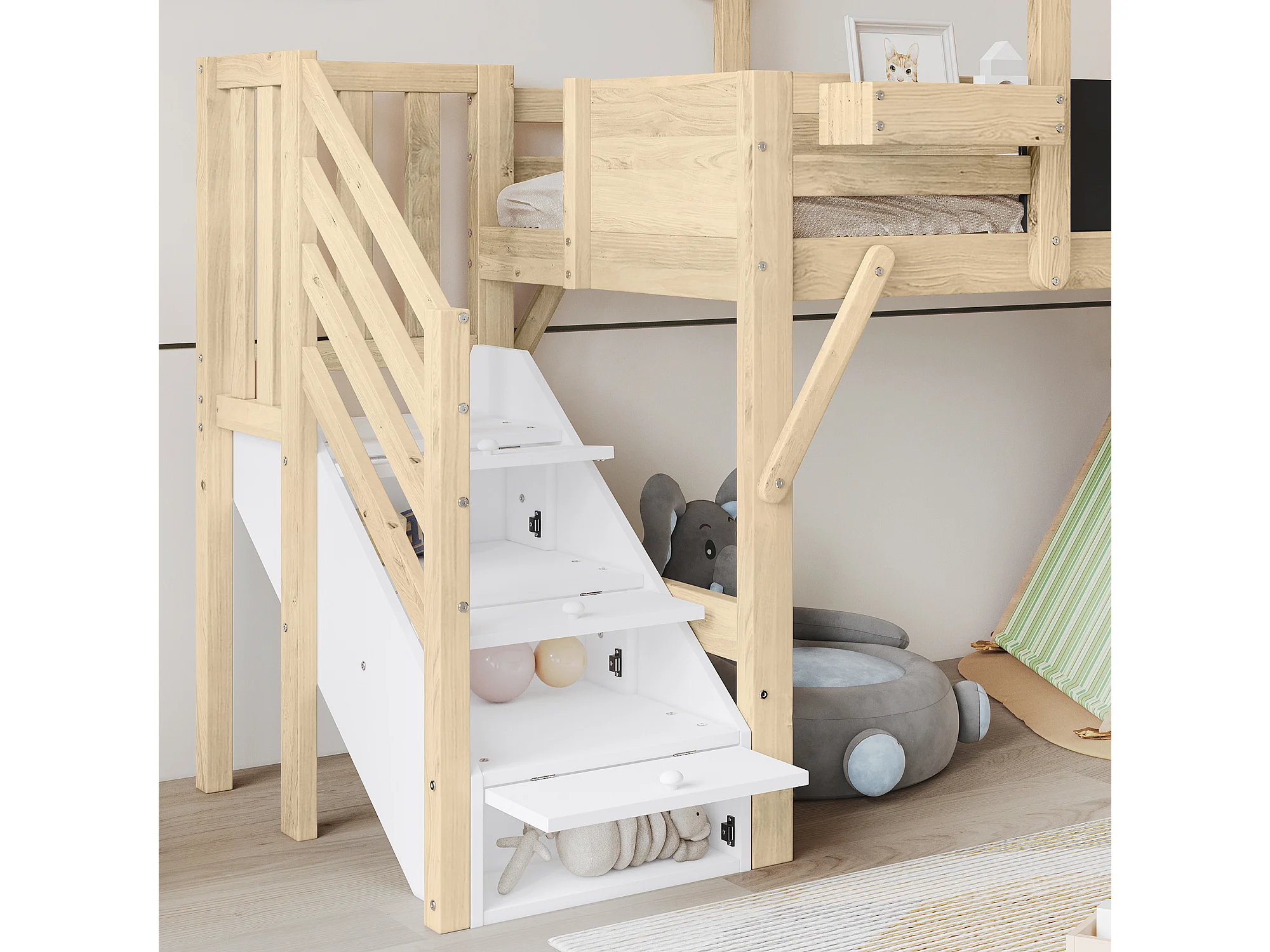 Lit superposé 90x200cm espace inférieur modulable bois escalier 3 rangements finition Blanc et naturel fonctionnel (Sans matelas)