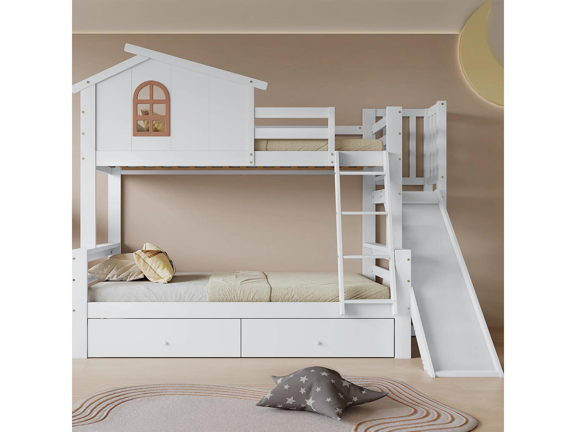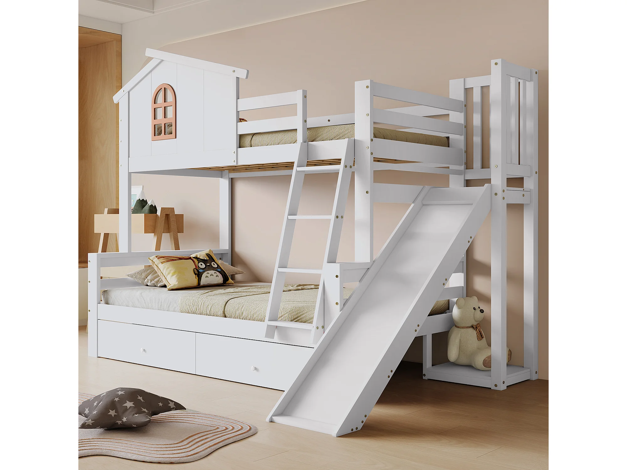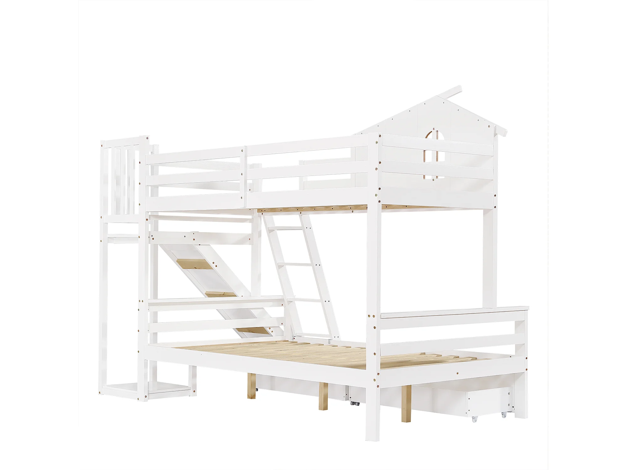 Lit superposé avec fenêtres, avec diapositiva, 90x200 et 120x200 cm, 2 tiroirs, en bois, blanc, sans matelas