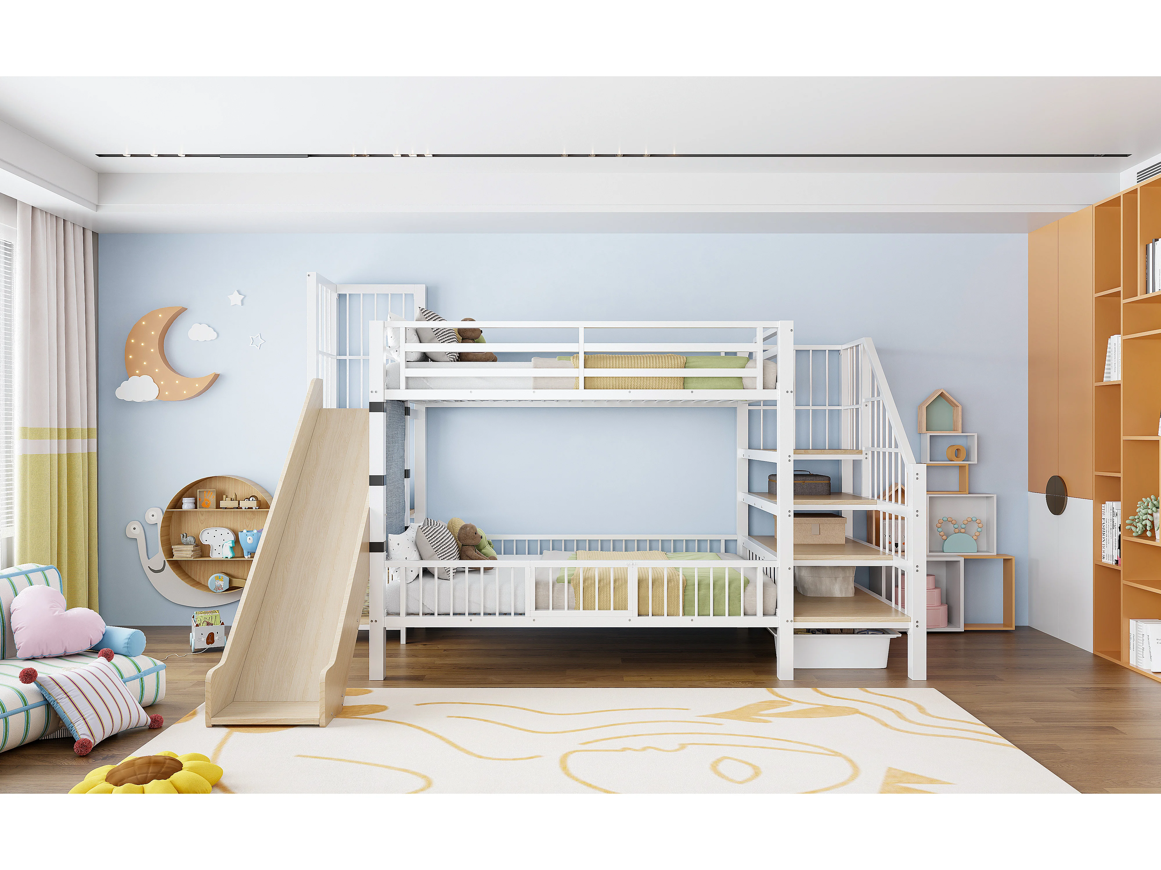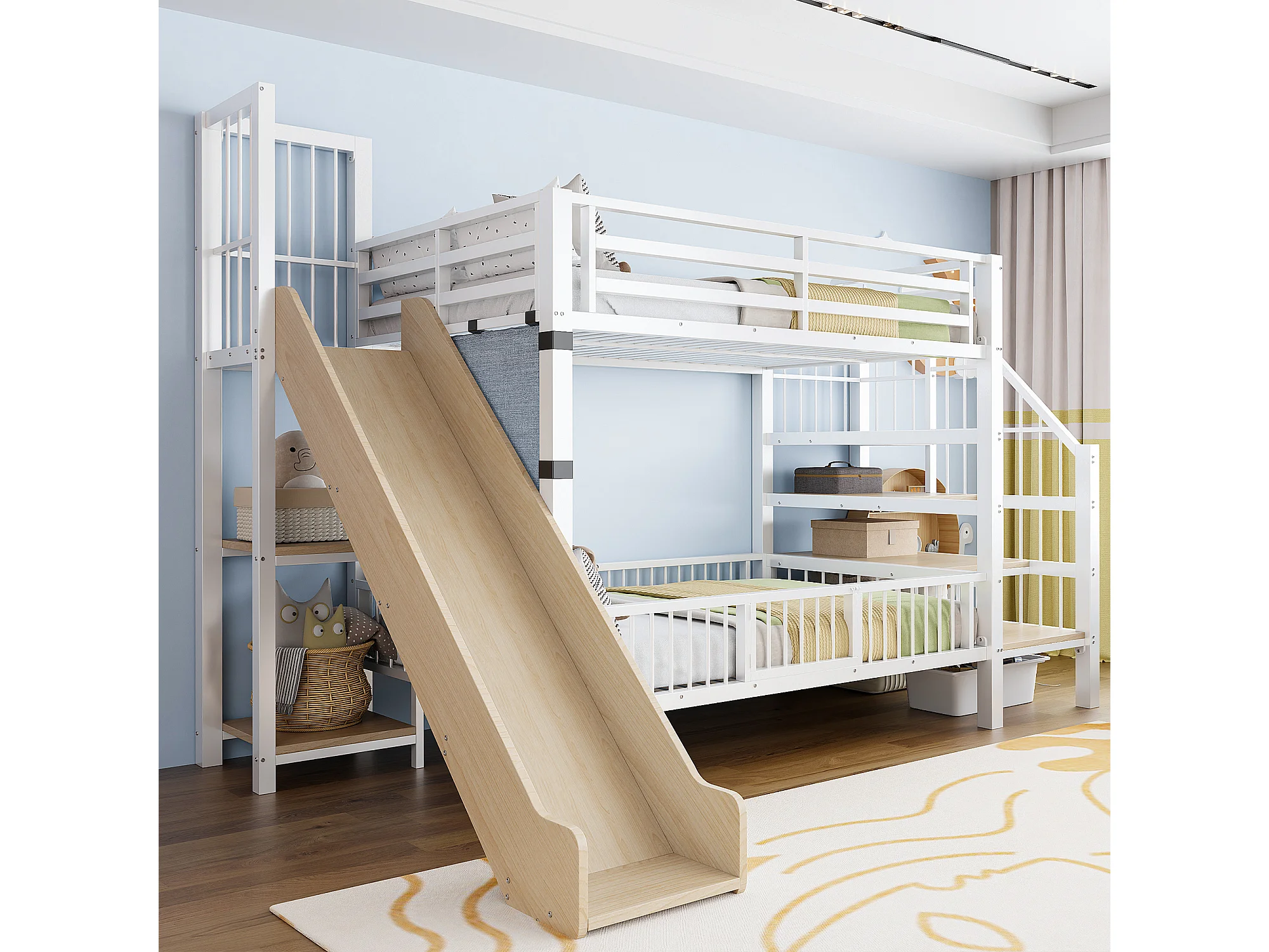 Lit superposé en métal pour enfant - 2 x 90 x 200 cm - avec toboggan + escalier de rangement + étagères intégrées - blanc
