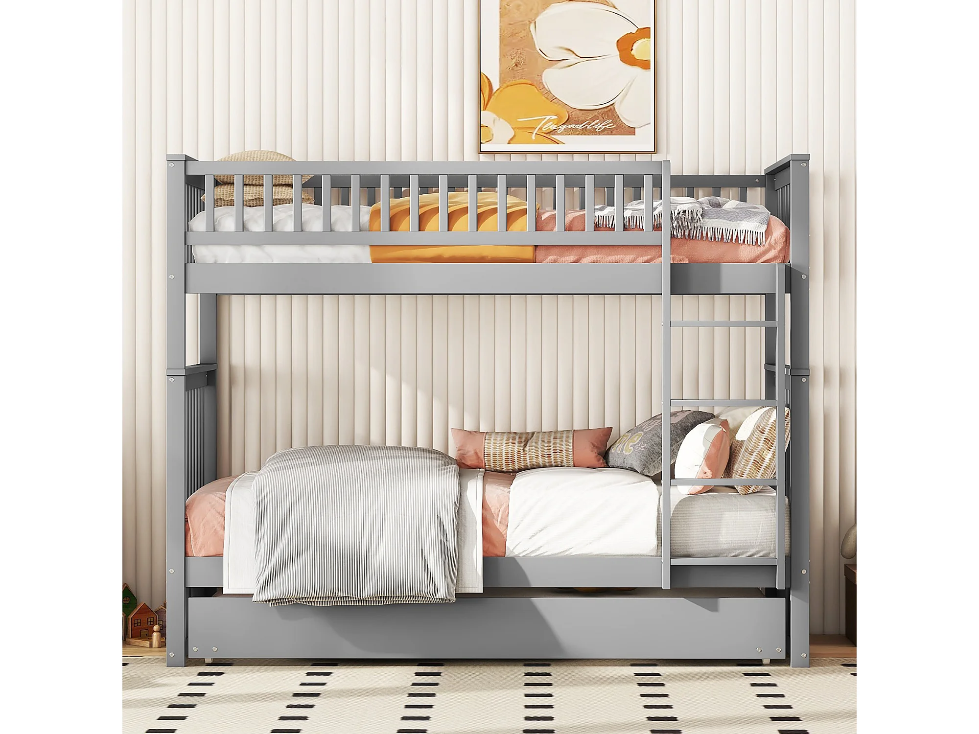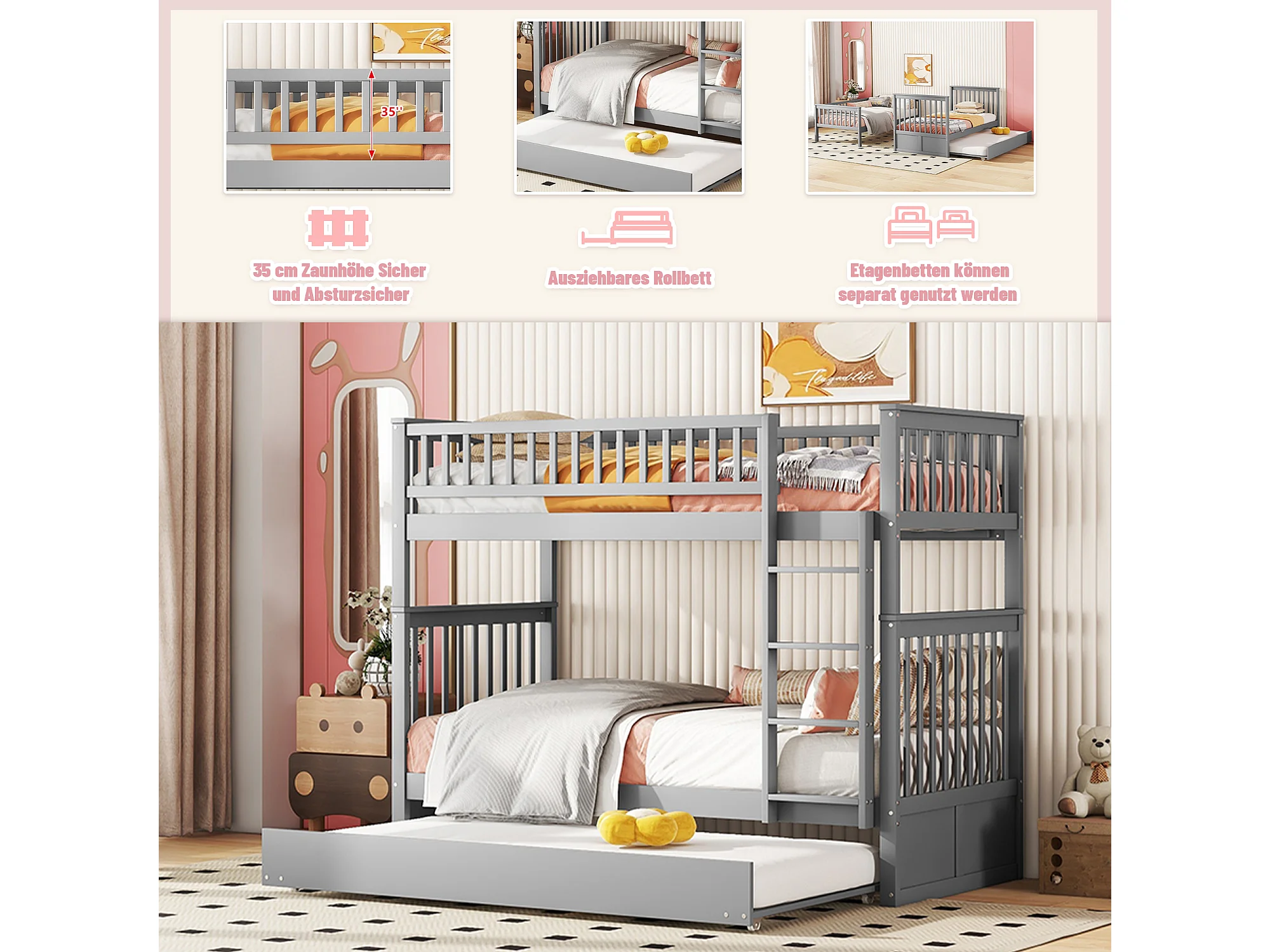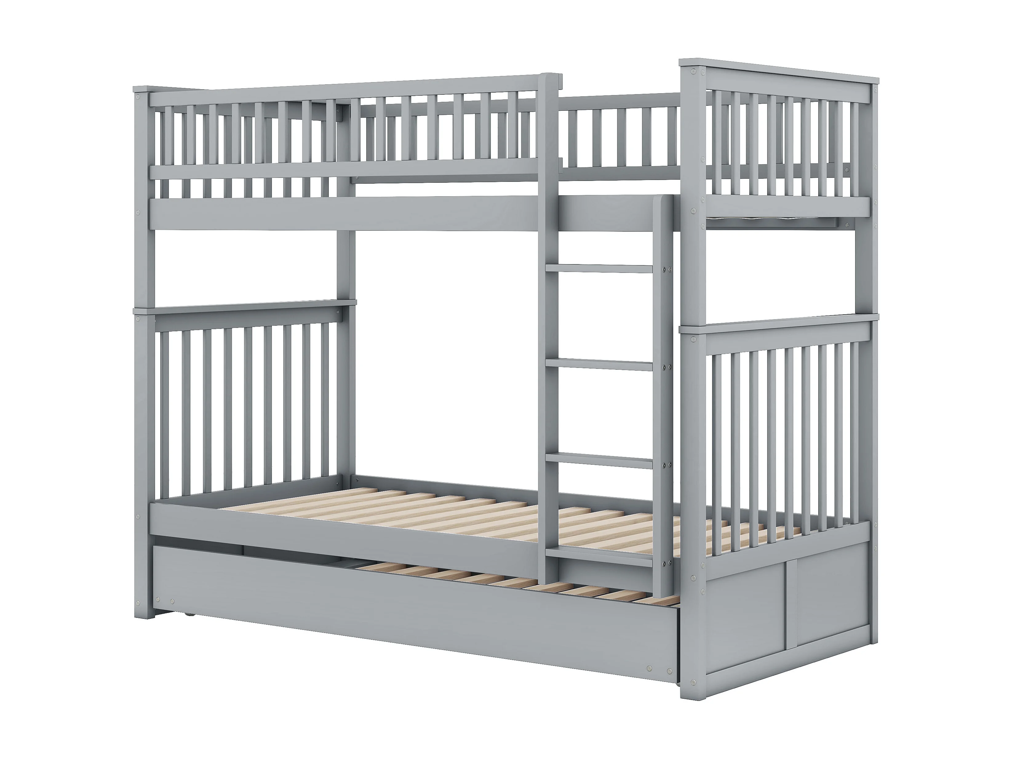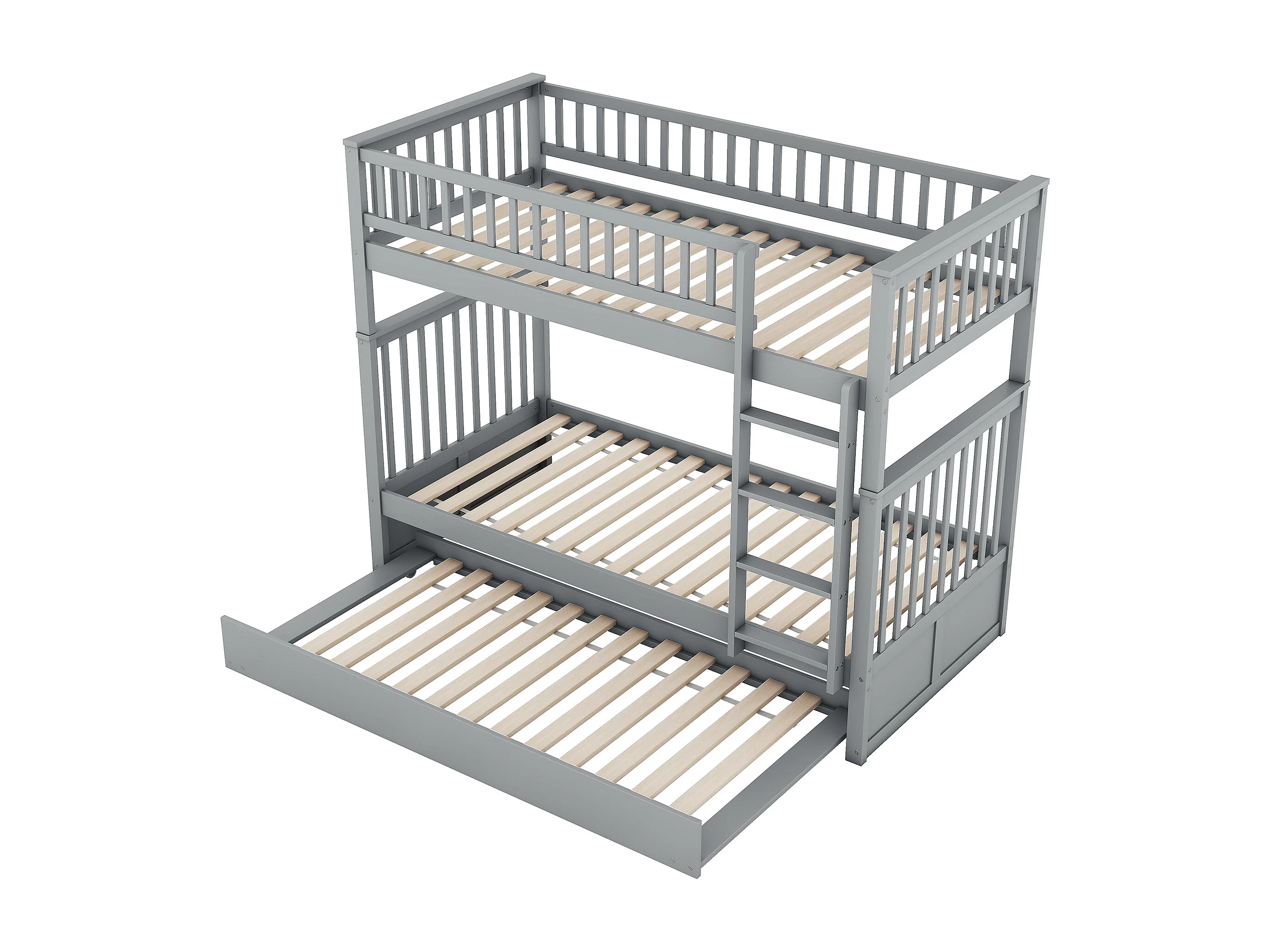 Lit superposé 90 x 200 cm - 3 couchages modulable avec lit gigogne amovible - En Pin; MDF - Escalier Stable et Garde-corps - Sans matelas - Gris