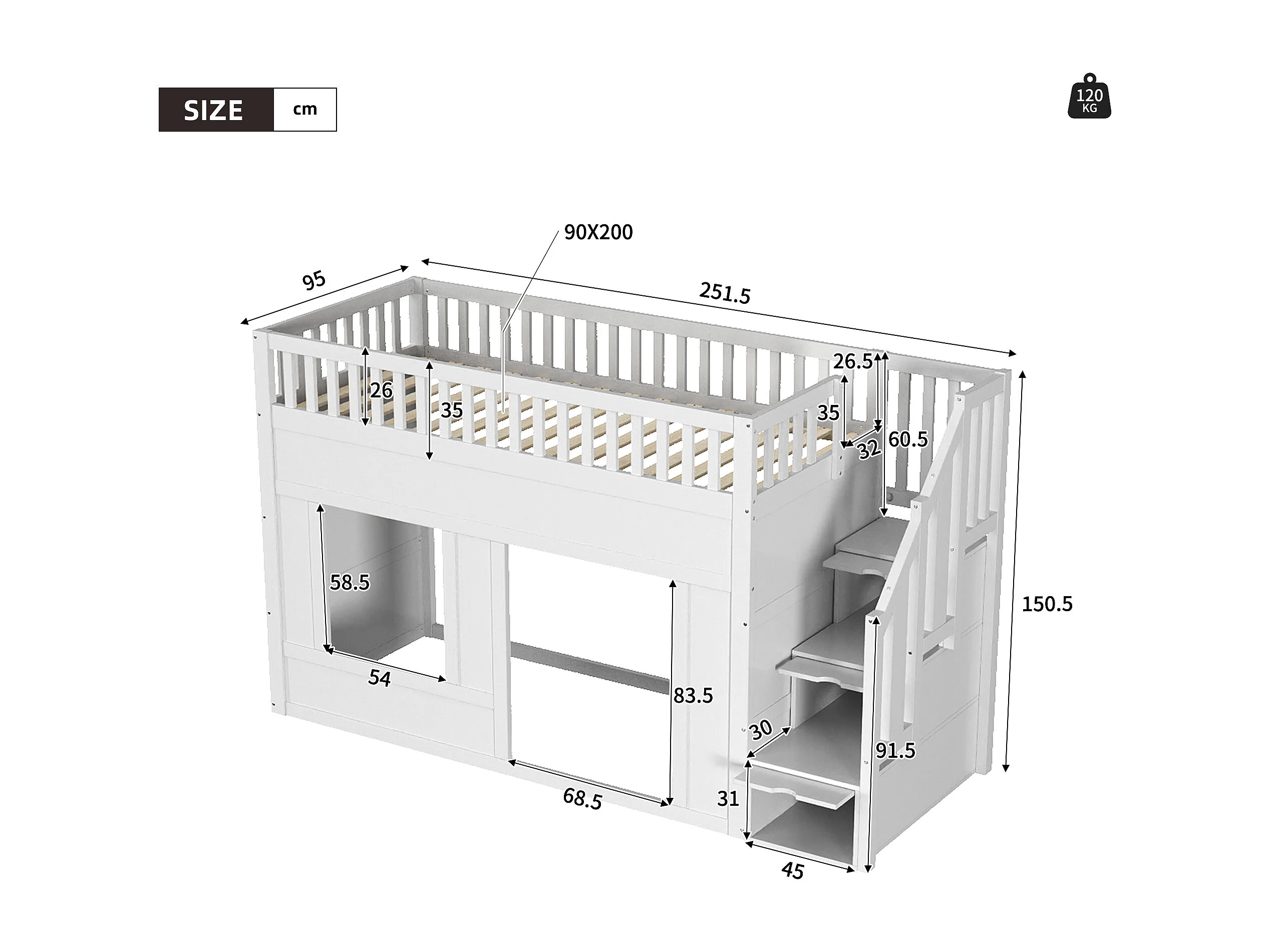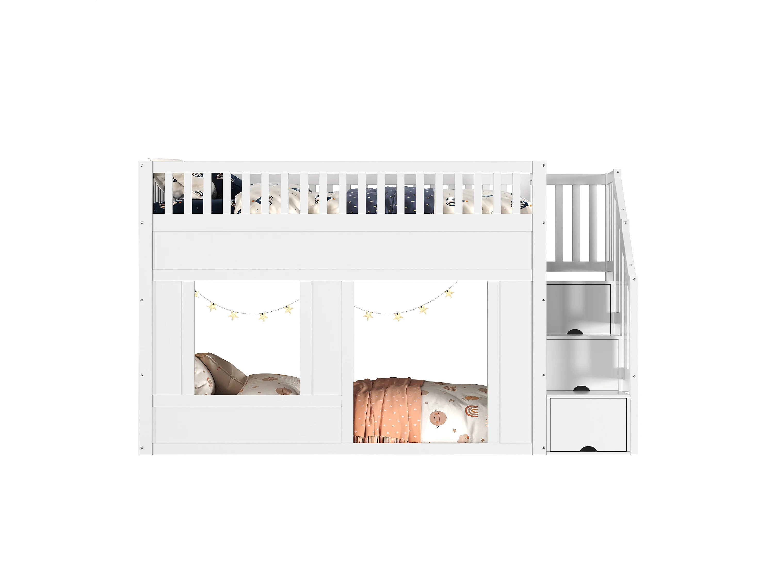 Lit superposé enfant 90×200 cm blanc, avec escalier rangement, zone de jeu modulable dessous, sans matelas, design bois MDF
