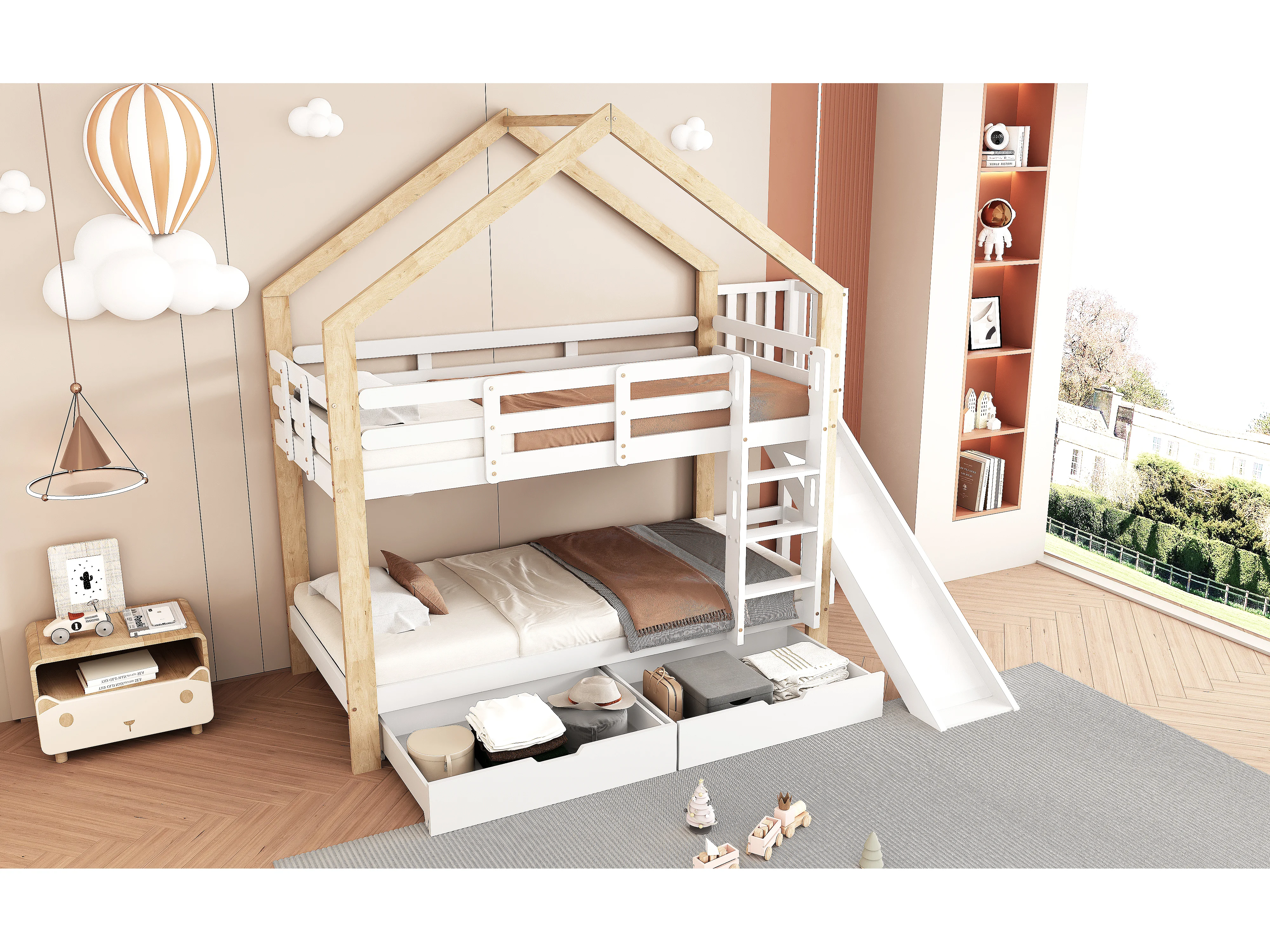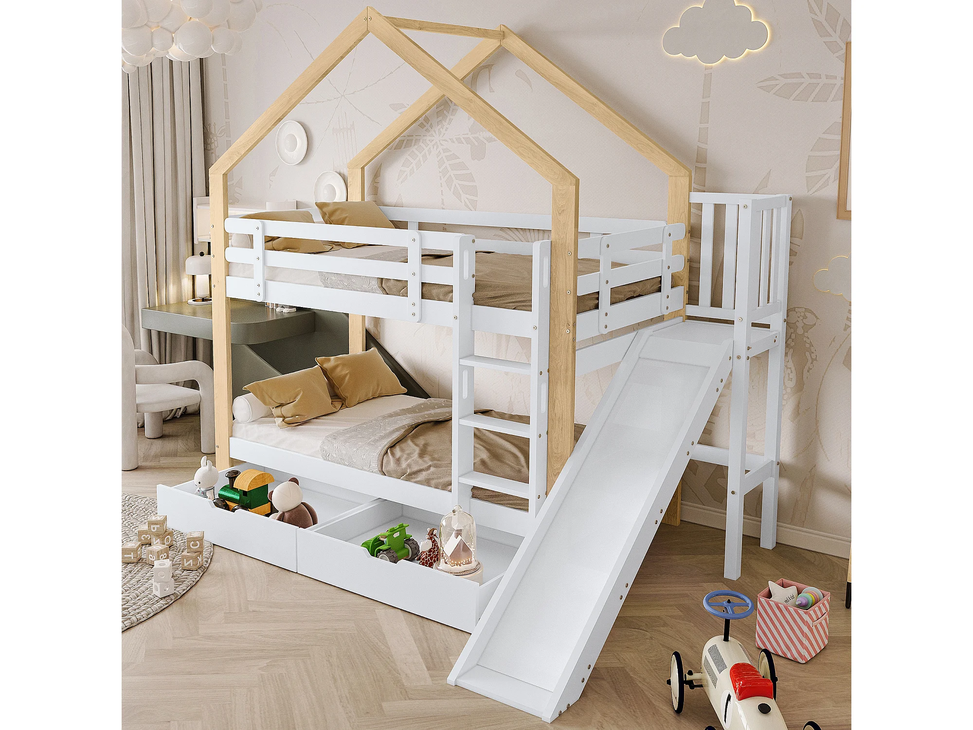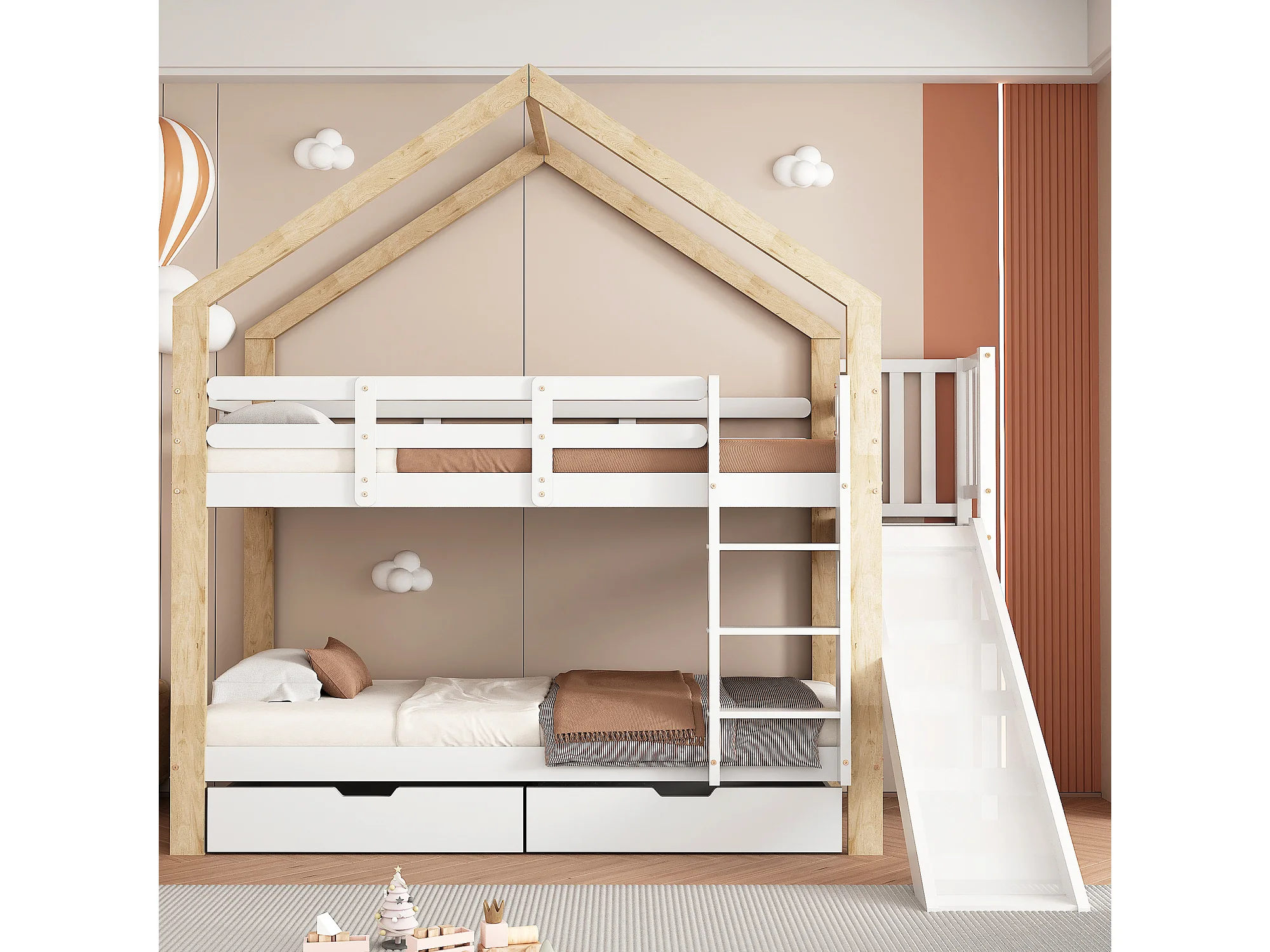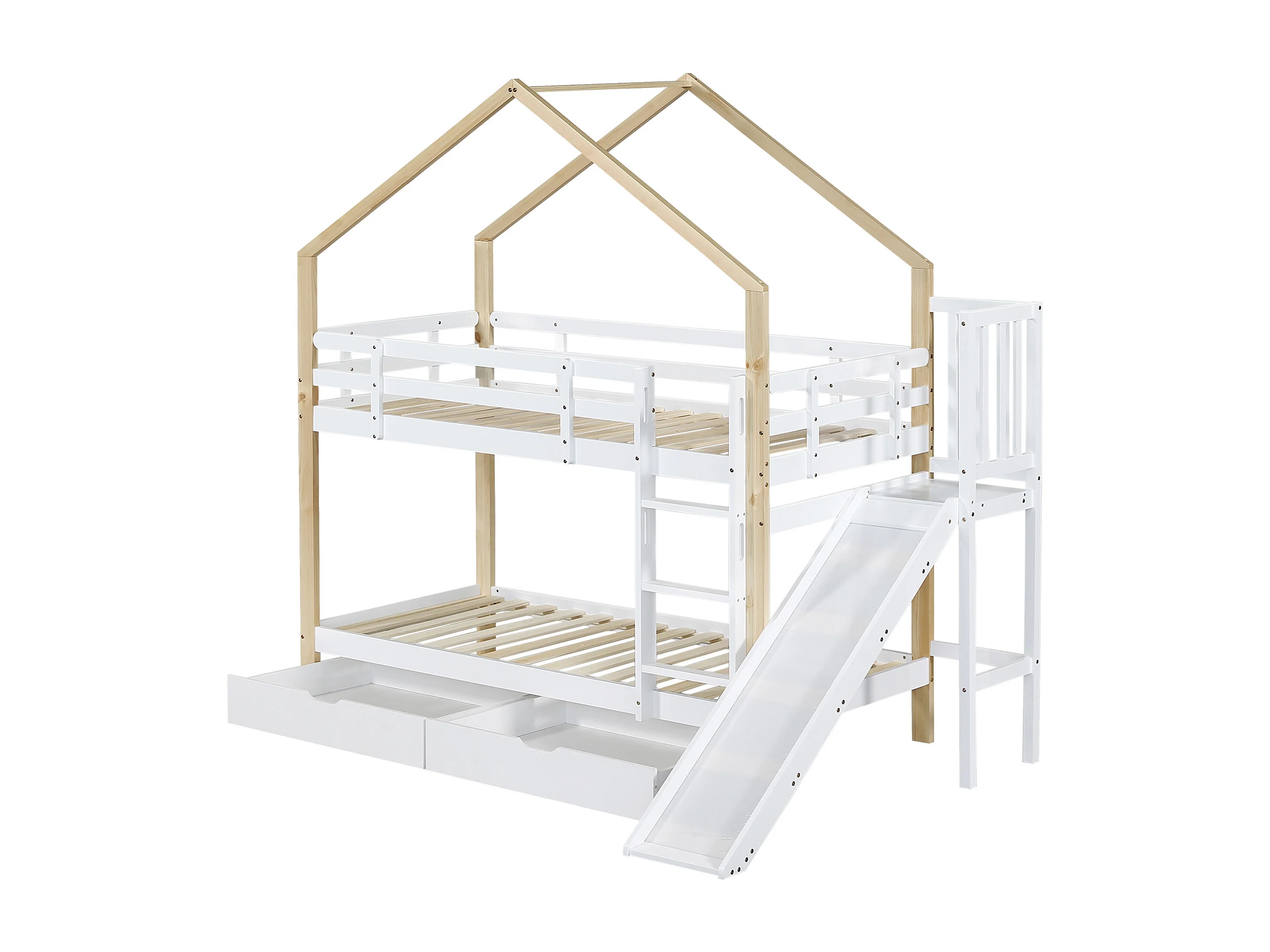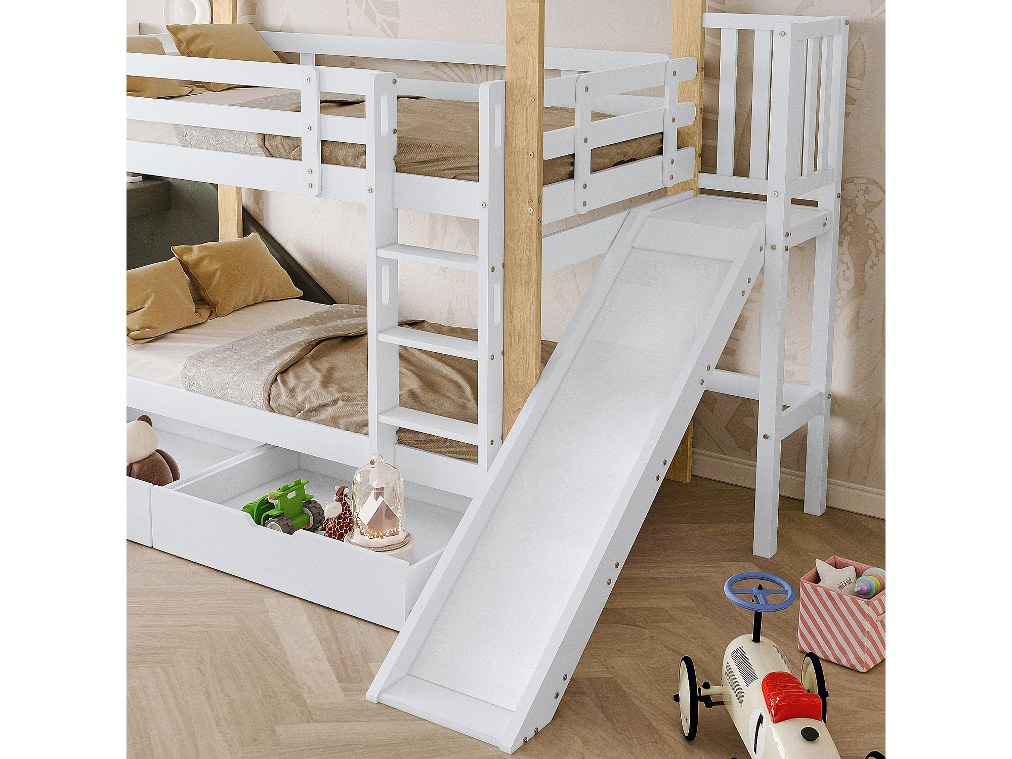 Lit superposé Enfants 90x200 cm avec Toboggan , avec Protection antichute, Blanc + Naturel