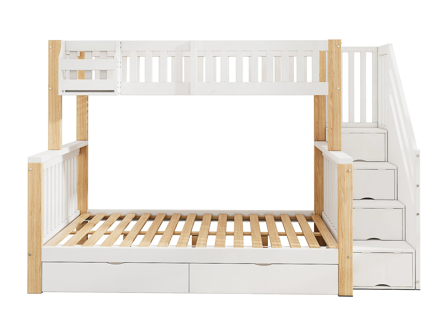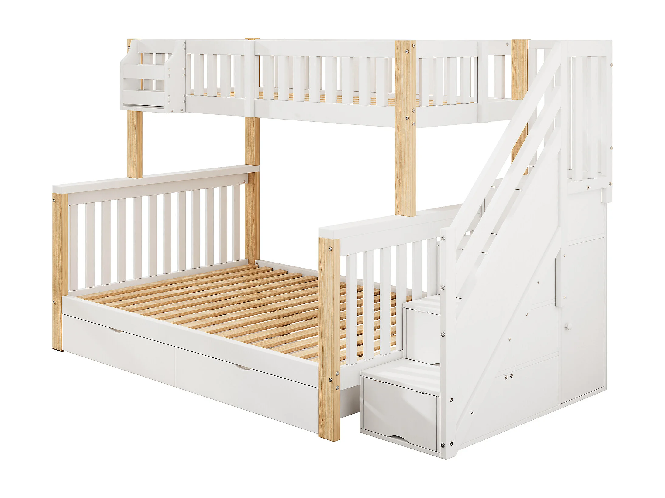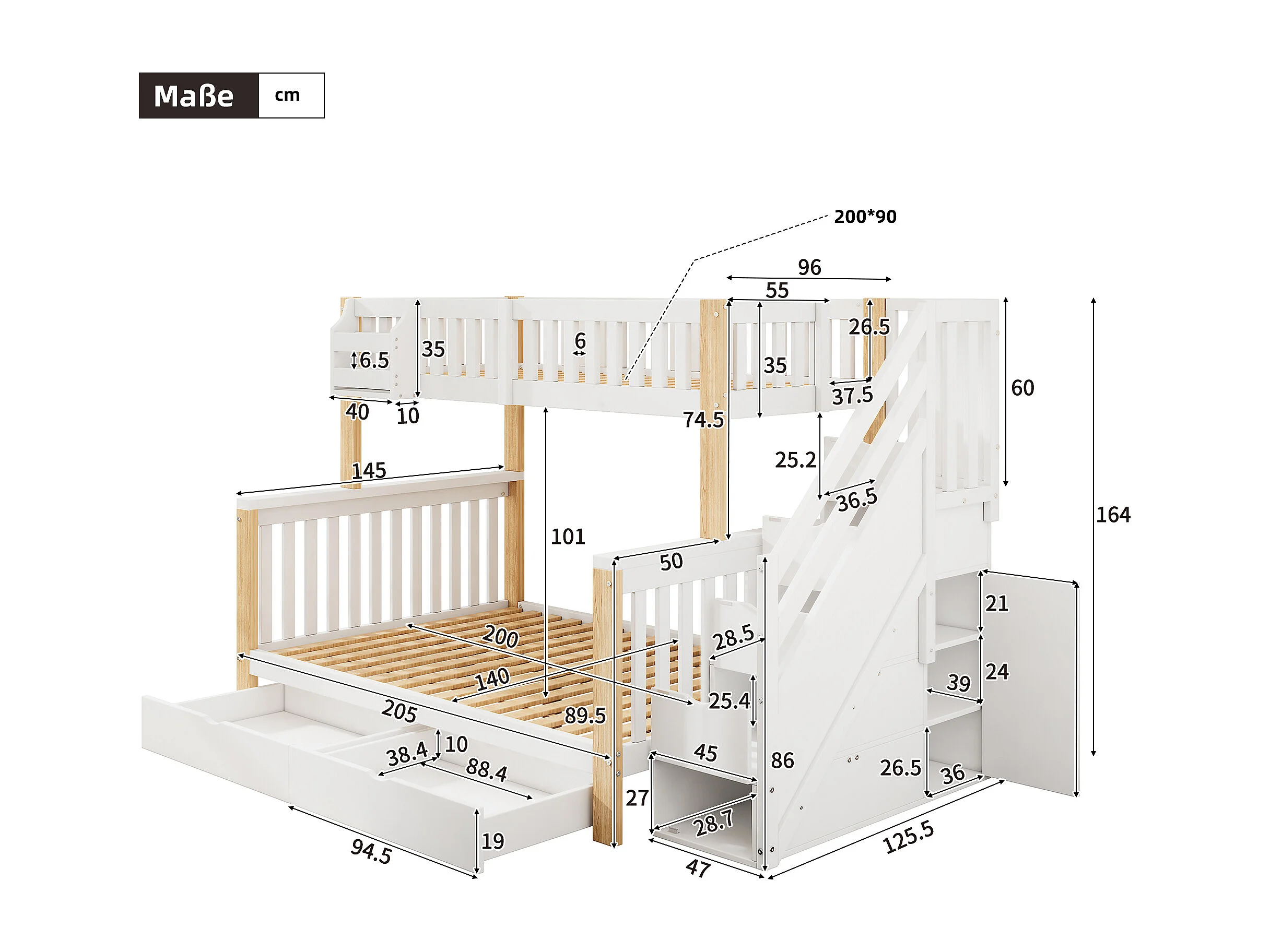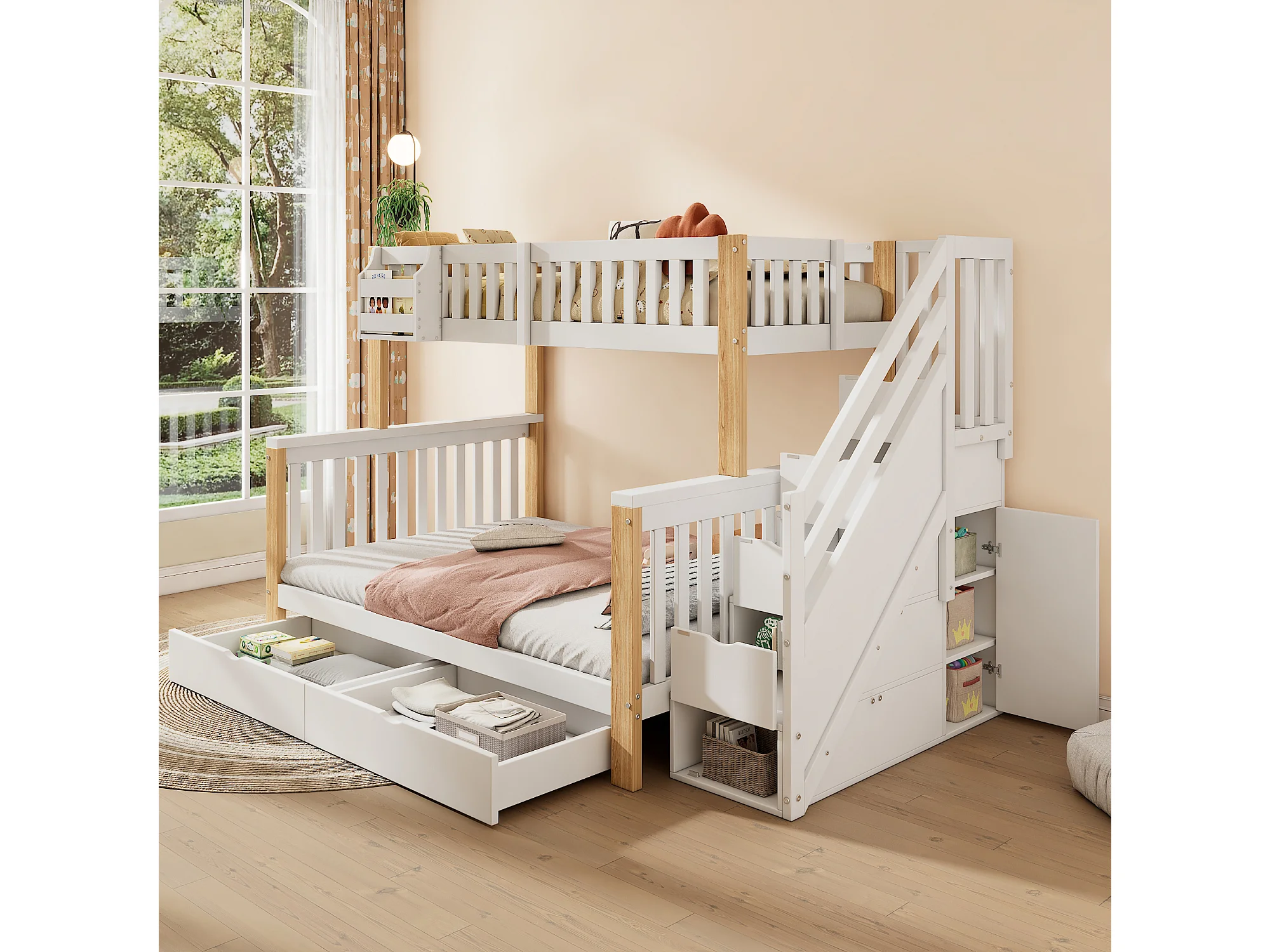 Lit superposé multifonctionnel enfant 90/140x200 cm, avec tiroirs et rangements, blanc + naturel, sans matelas