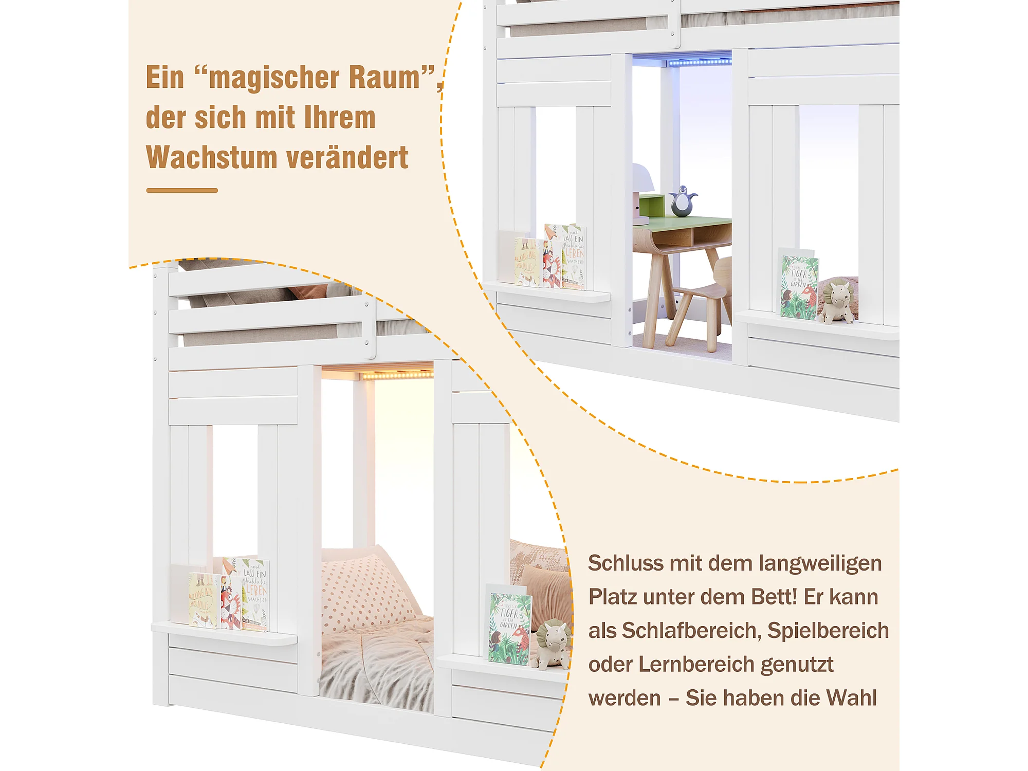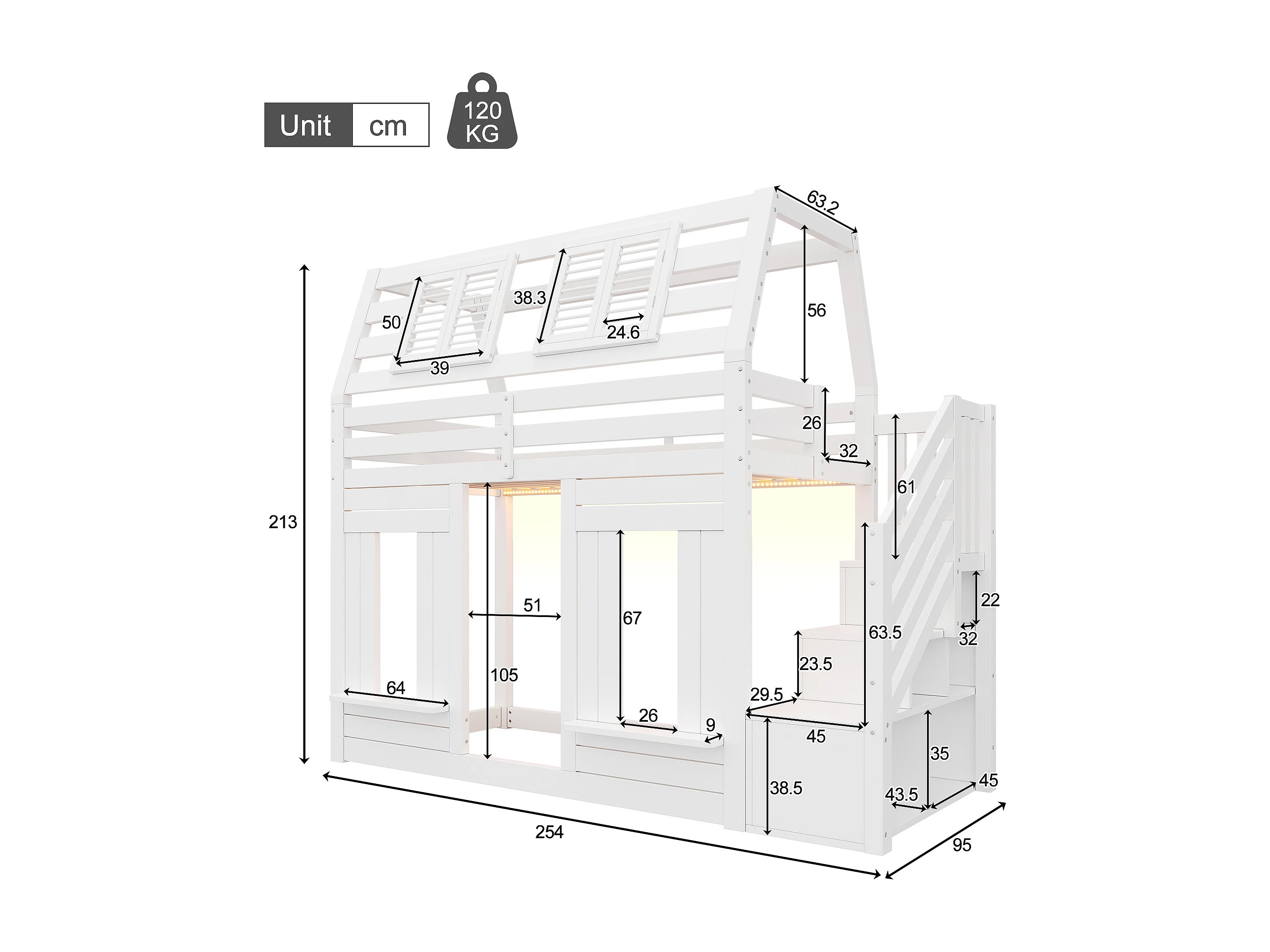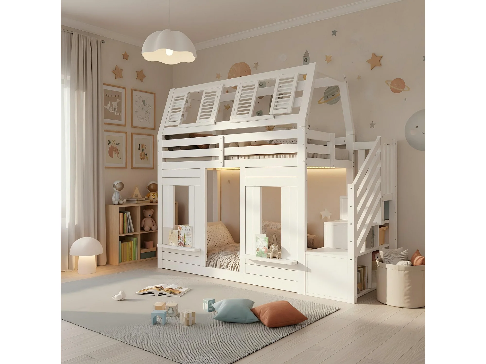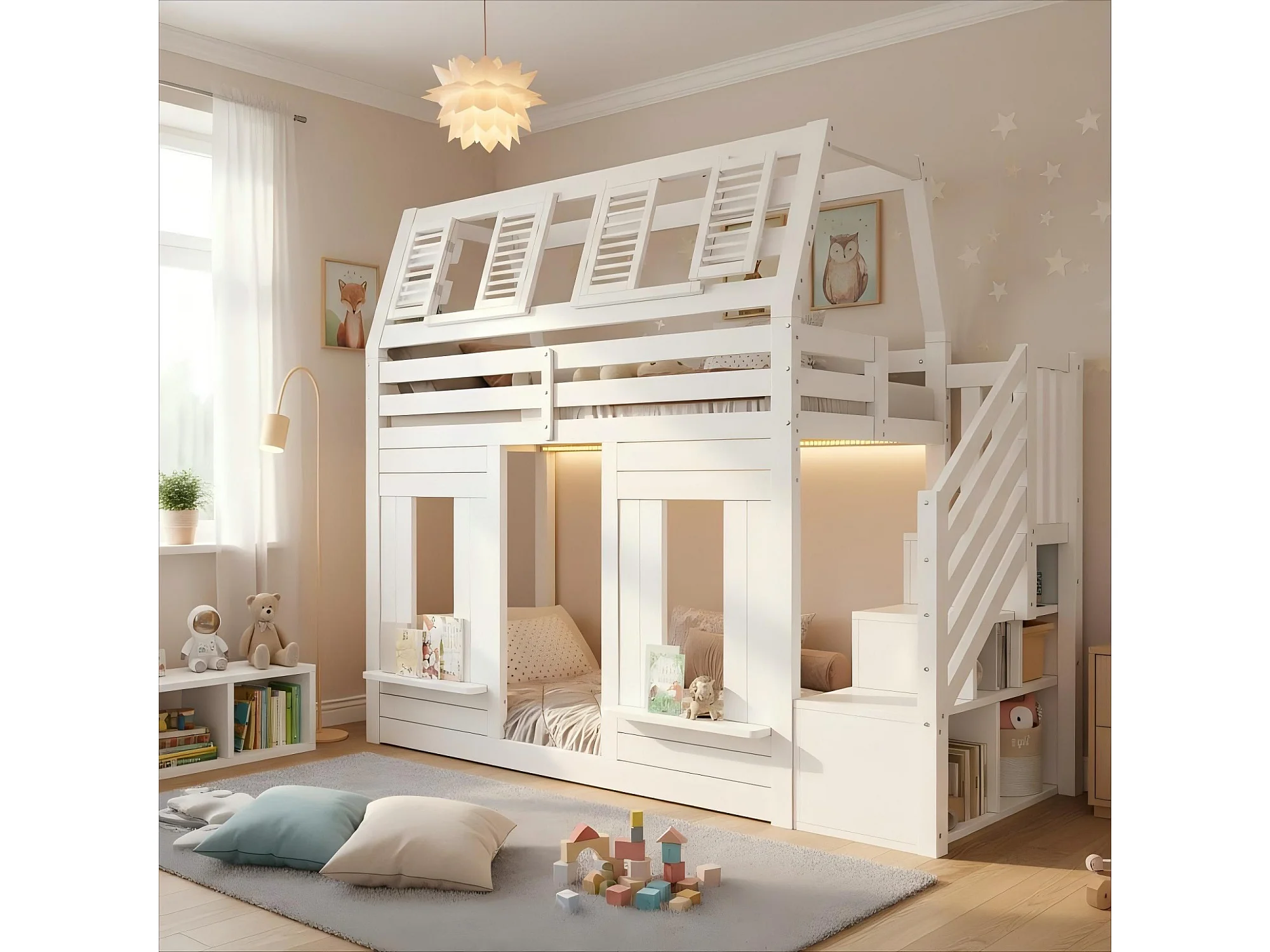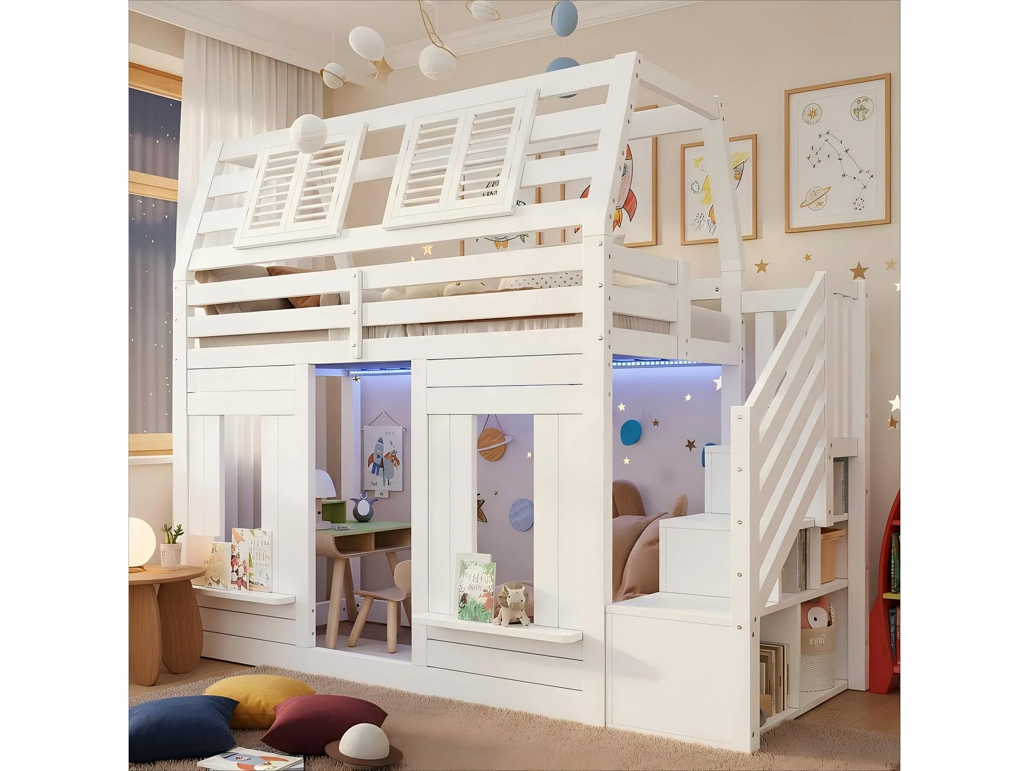 Lit superposé pour enfant - 2 x 90 x 200 cm - avec Leds + escalier de rangement - forme fenêtre - bois - blanc