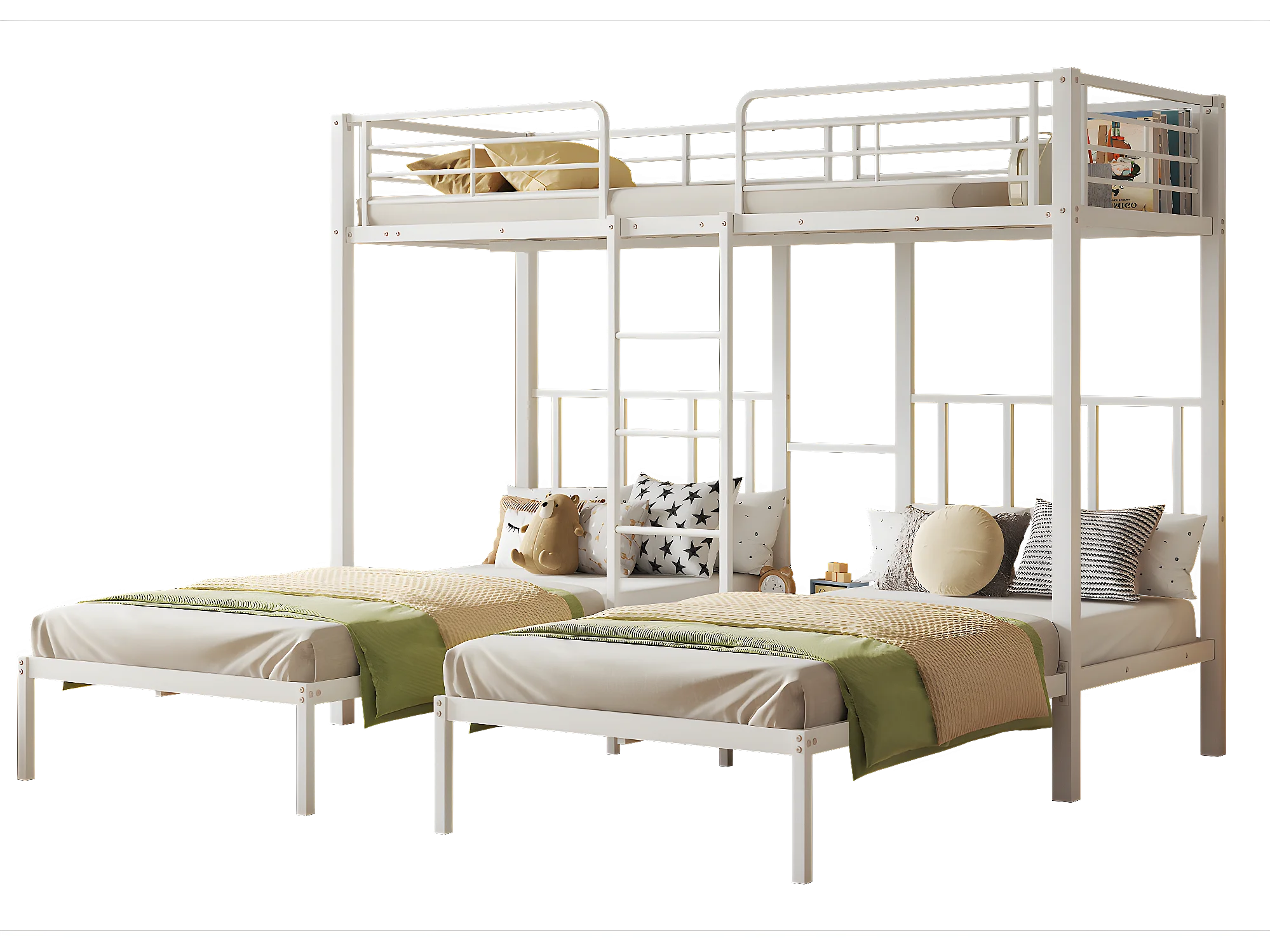 Lit superposé triple 3x90x200cm avec échelle et un plateau - cadre en métal - Blanc
