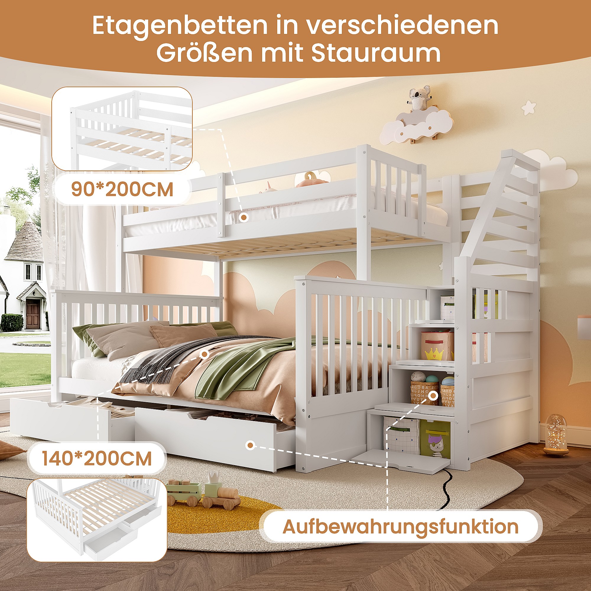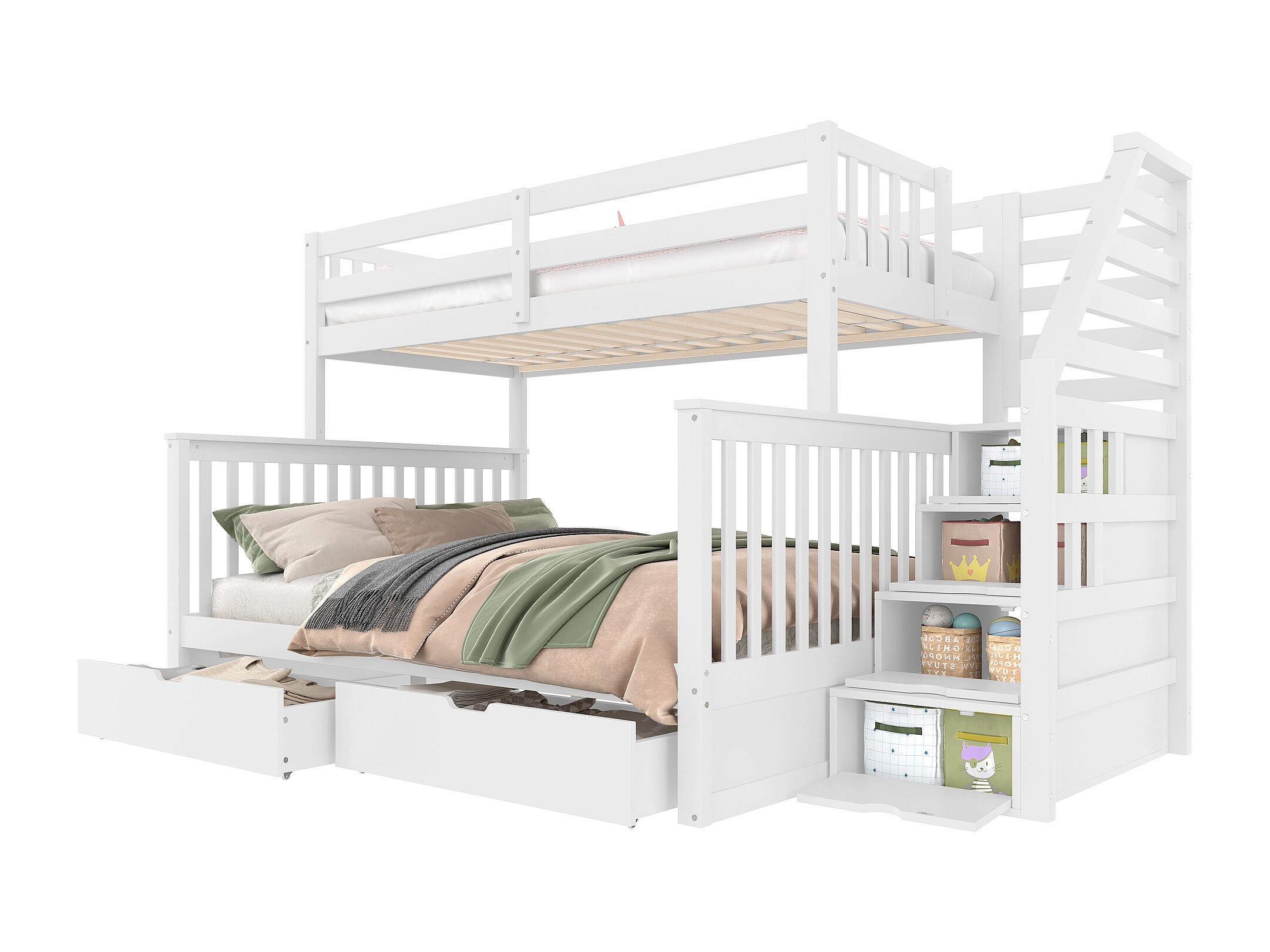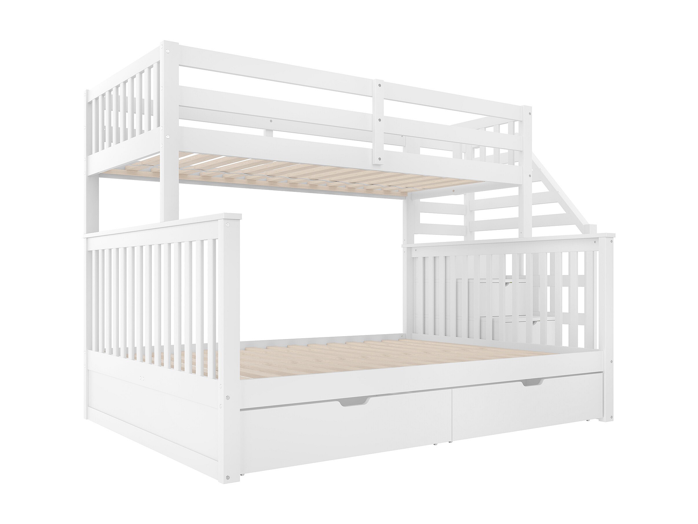 Lit superposés 90 x 200 cm + 140 x 200 cm - avec 2 tiroirs + escalier de rangement - bois - blanc