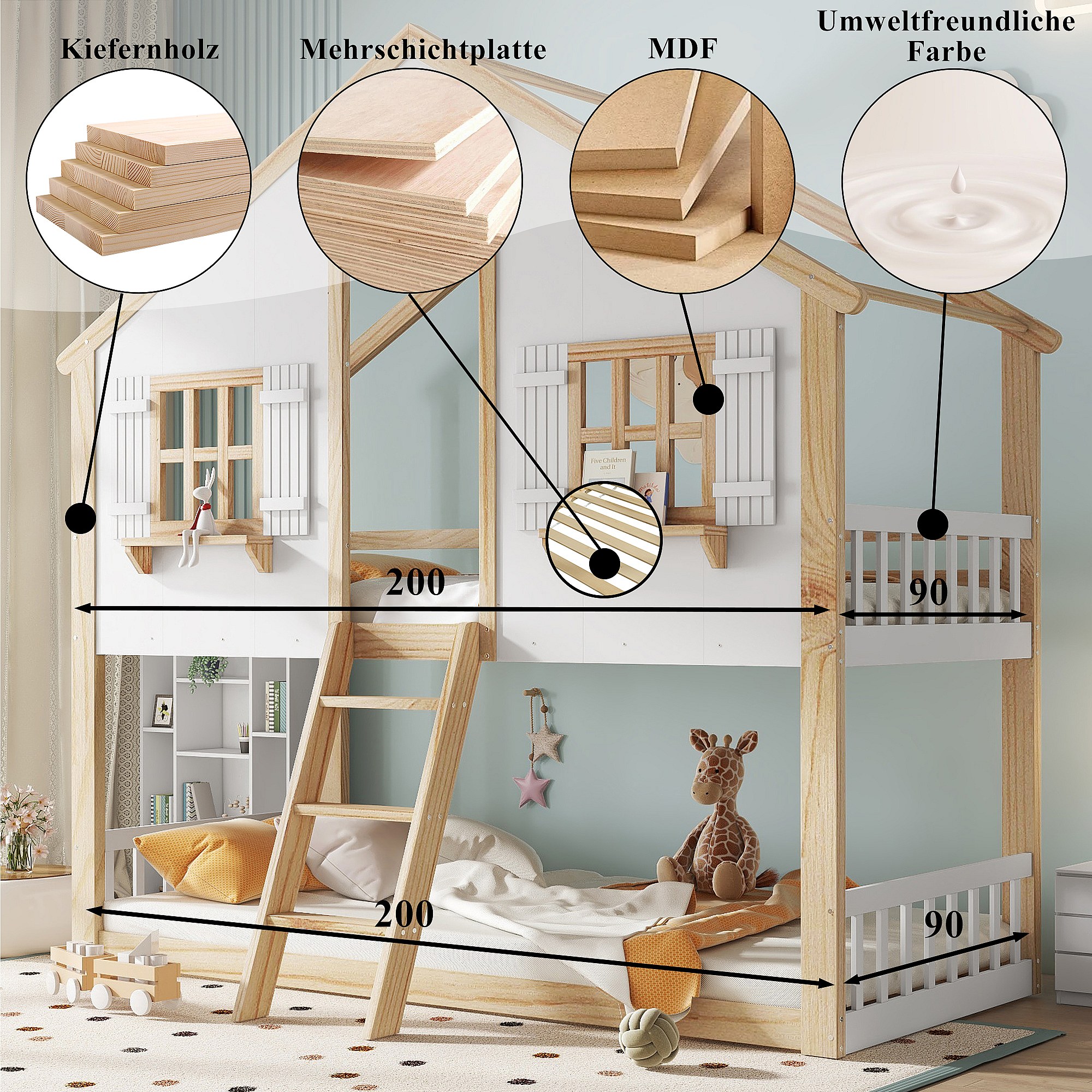 Lit superposés enfant - 2 x 90 x 200 cm - avec fenêtres et toit + sommiers à lattes - pin + MDF + contreplaqué - blanc + naturel