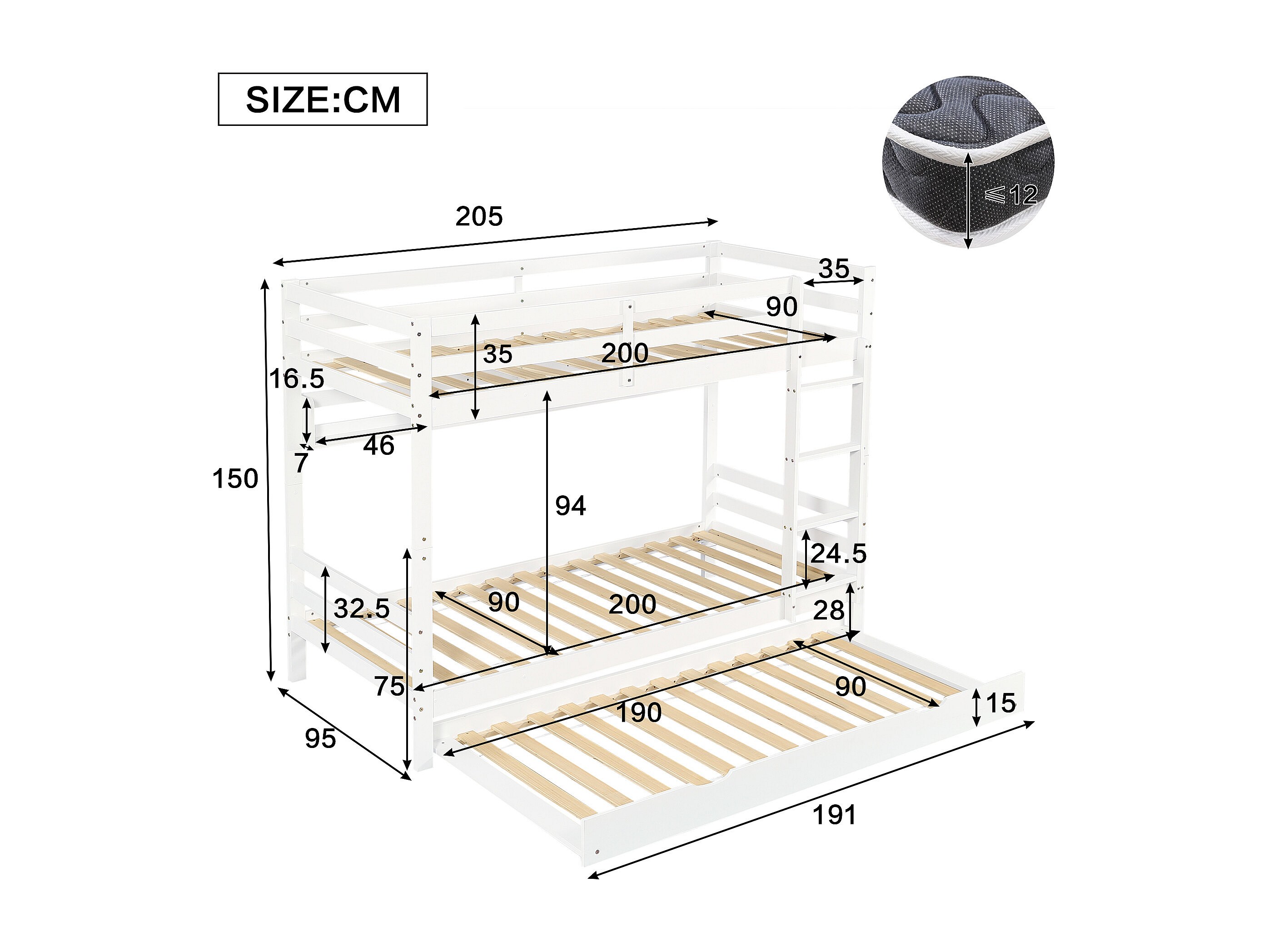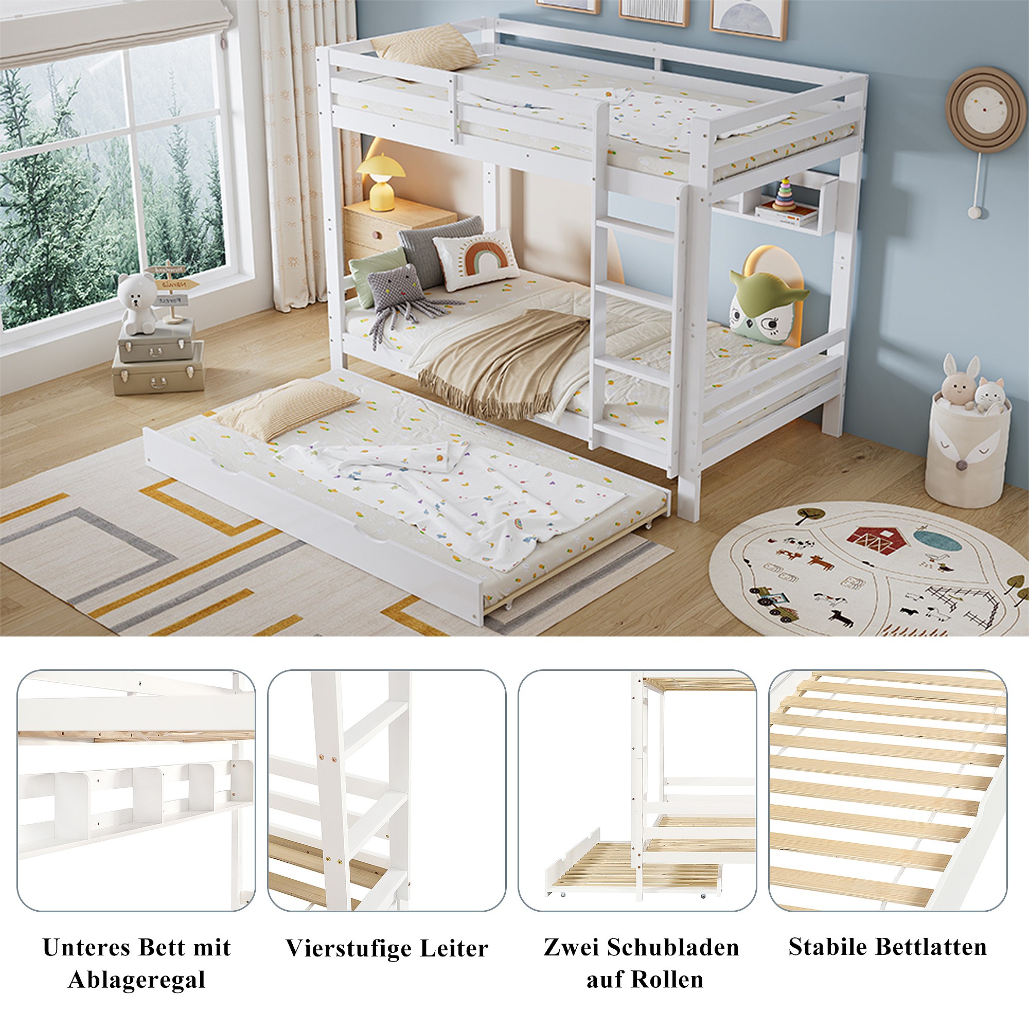 Lit superposés enfant - 2 x 90 x 200 cm - avec lit gigogne 90 x 190 cm + étagères - pin + MDF + contreplaqué - blanc