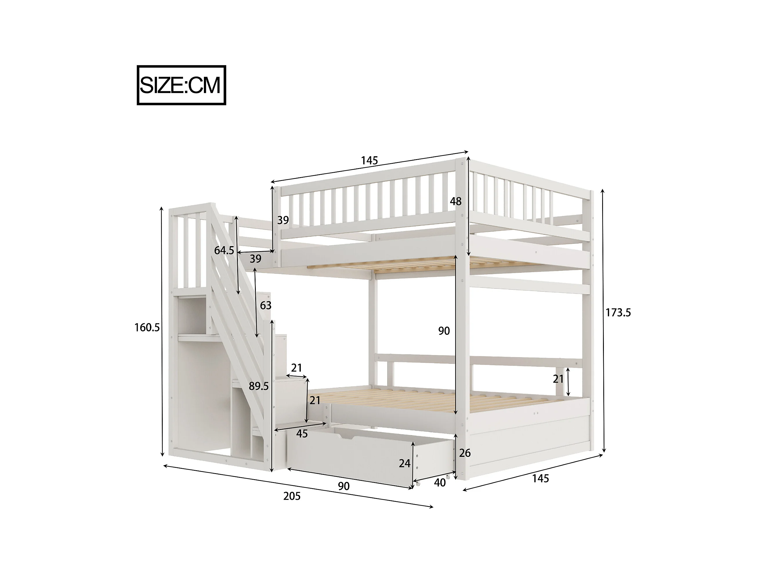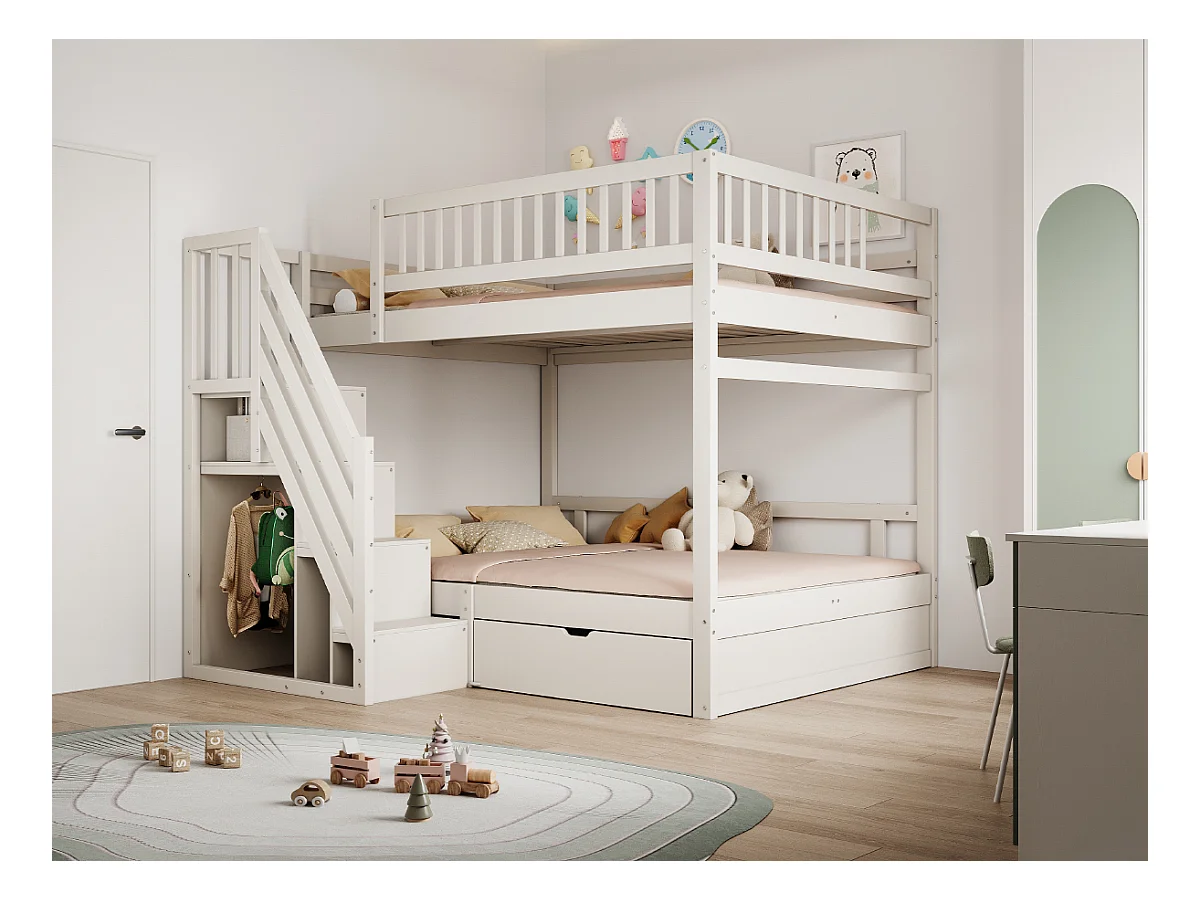 Lit superposés pour enfant - 2 x 140 x 200 cm - avec 1 tiroir + rangements d'escalier - bois + MDF - blanc