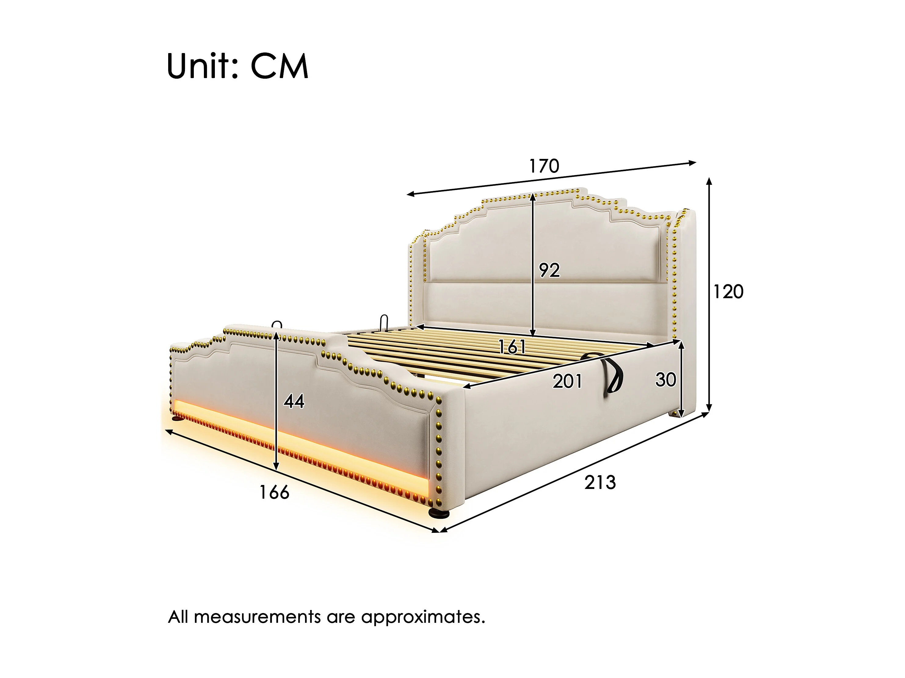 Lit tapissé 160x200 cm double, hydraulique, LED, USB-C, rangement, tissu velours beige, lit jeune (Avec matelas)