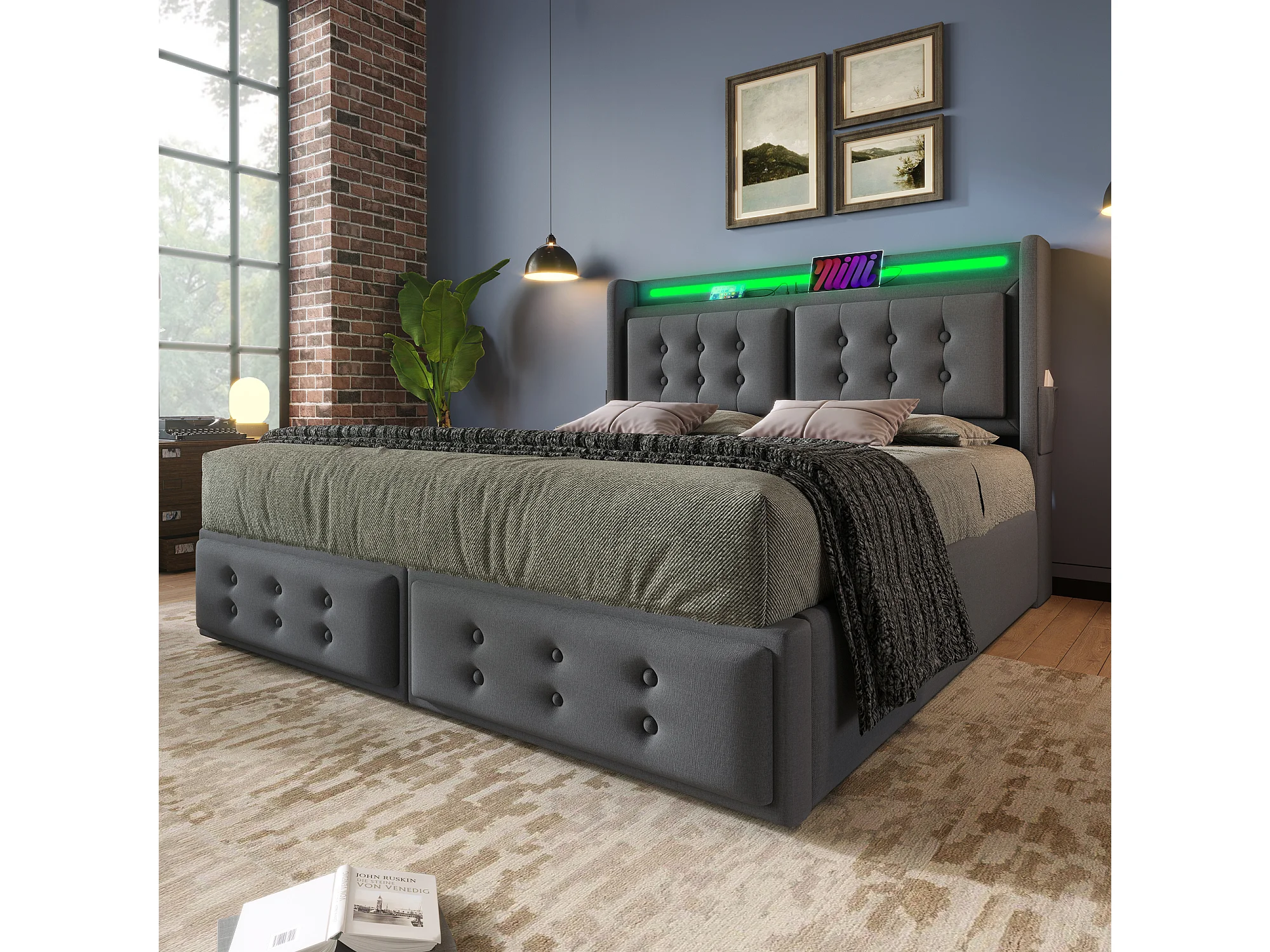 Lit tapissé 160x200 cm double, LED tête, USB-C, hydraulique, cadre bois et métal, coton gris, charge 300 kg (Avec matelas)