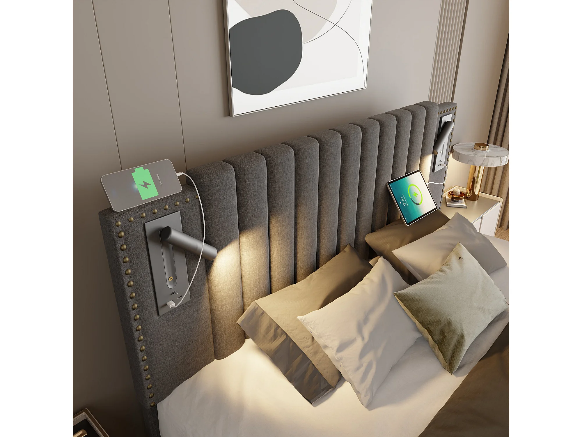 Lit tapissé 160x200 cm double, tiroir de rangement, LED tête, USB, tête cloutée, coton gris (Avec matelas)