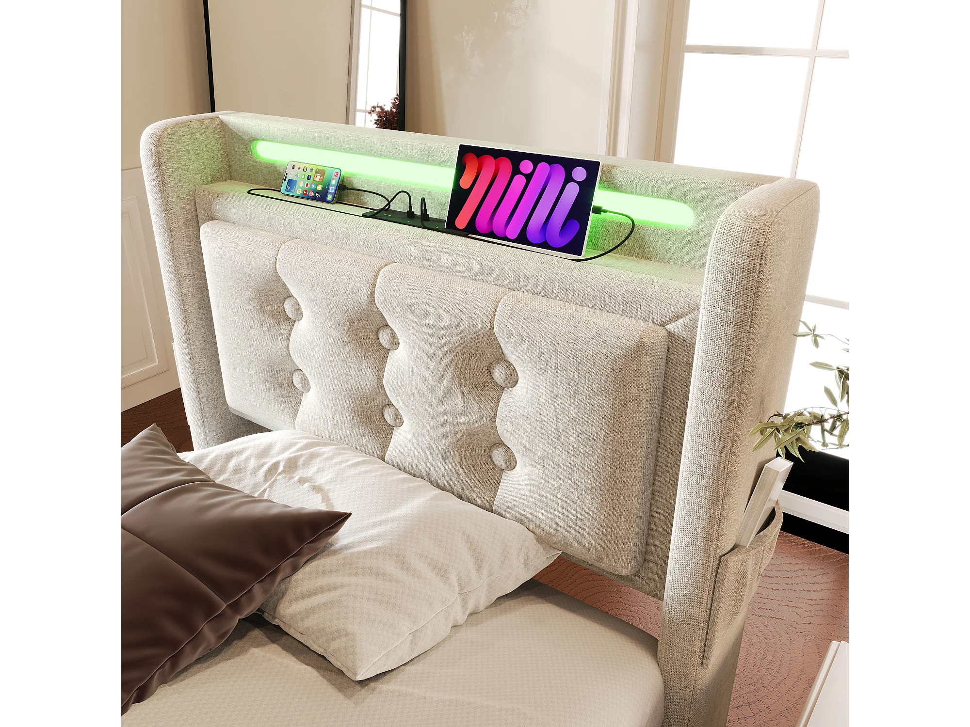 Lit tapissé 90x200 cm simple, LED tête, USB-C, hydraulique, cadre bois et métal, coton beige, charge 150 kg (Avec matelas)