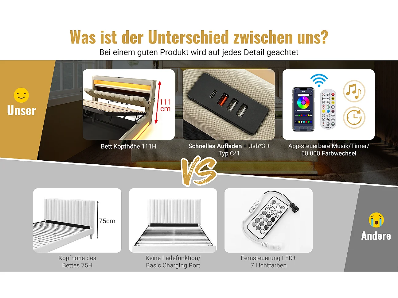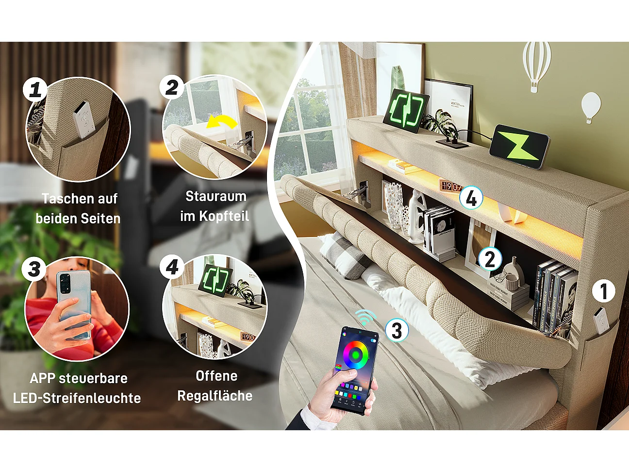 Lit tapissier double 140×200cm : Tête rangement + USB/Typ-C, LED au tête/pied, rangement hydraulique, beige, lin (sans matelas)